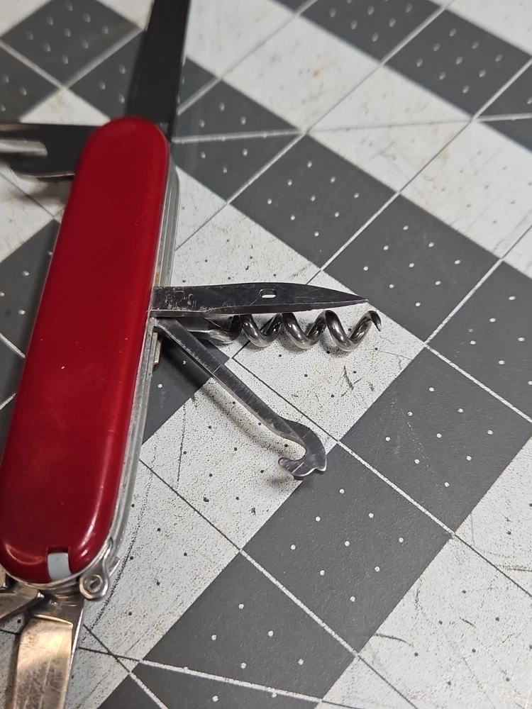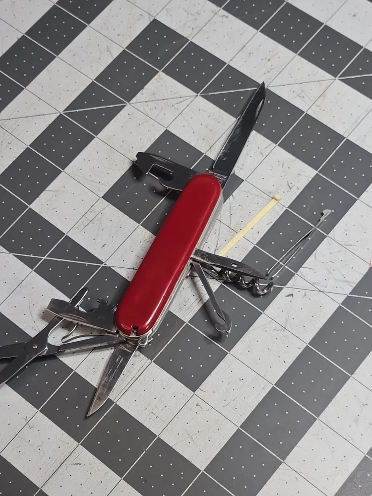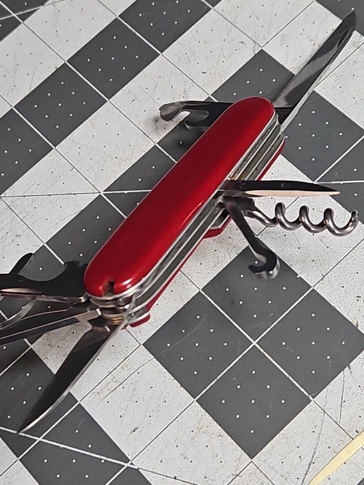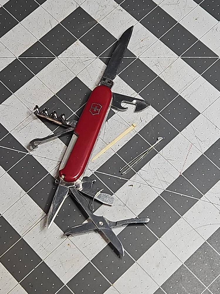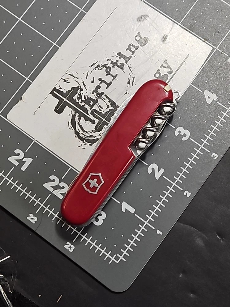 VICTORINOX "Huntsman" Swiss Army Knife 15 Functions Officier Suisse GUC Worn Good used condition. Light wear from age and use. Markings from age and use. See pictures Product will be shipped timely and packaged with care. Offers are encouraged. Please feel free to reach out with questions. Please see pictures. Thank you. The VICTORINOX Huntsman Swiss Army Knife is a 15-function tool that is perfect for any outdoor enthusiast. It features a manual opening mechanism and three blades made of high-quality plastic. The red handle adds a pop of color to the knife, making it easy to find in a crowded toolbox. This knife is a great addition to any collection and is sure to impress. HLB2 hunts