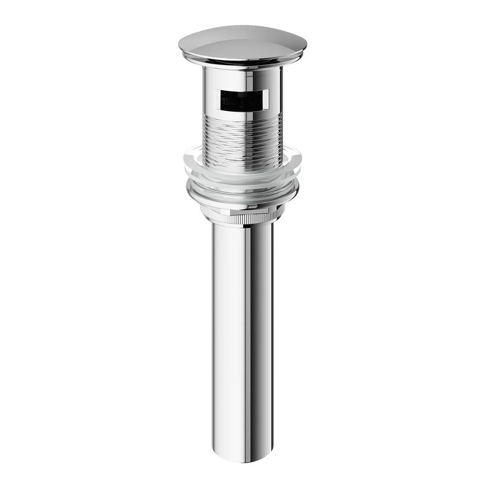 Update your bathroom with an advanced pop-up drain assembly with overflow. Crafted to fit 1.25-inch sink drain holes on bathroom sinks with overflows, this pretty fixture brings a fresh new look to your sink. A rubber seal ring on each side ensures a snug fit, and the drain is made from solid brass for long-wearing service life after installation backed up by a lifetime limited warranty from VIGO.Drain is designed for bath sinks with overflow Unique, sleek push-pop drainVIGO bathroom sink accessory is solid brass with chrome finishRubber seal ring on each sideFits 1.25 Free Shipping Over $49.99* Details VIGO 1.75" W Bathroom Sink Pop-Up Drain in Chrome Product Description: Update your bathroom with an advanced pop-up drain assembly with overflow. Crafted to fit 1.25-inch sink drain holes on bathroom sinks with overflows, this pretty fixture brings a fresh new look to your sink. A rubber seal ring on each side ensures a snug fit, and the drain is made from solid brass for long-wearing service life after installation backed up by a lifetime limited warranty from VIGO. Drain is designed for bath sinks with overflow Unique, sleek push-pop drain VIGO bathroom sink accessory is solid brass with chrome finish Rubber seal ring on each side Fits 1.25 inches sink drain hole Measures 9 inches tall x 2.5 inches in diameter