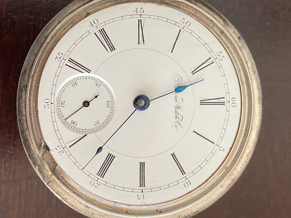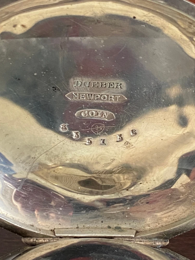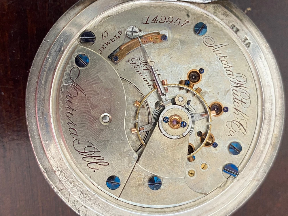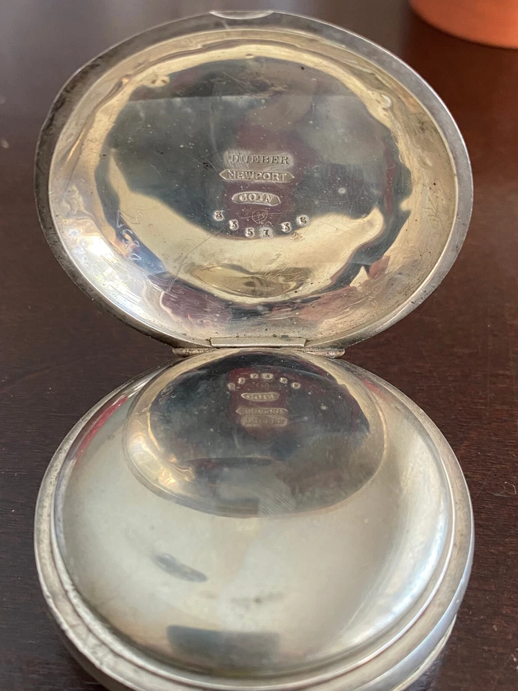 VINTAGE 18S AURORA POCKET WATCH, KEEPING TIME, 3OZ DUEBER NEWPORT COIN SILVER CASE: SIDEWINDER, 3OZ DUEBER NEWPORT COIN SILVER CASE , BOW IS TIGHT, HAS SOME DINGS AND DENTS CRYSTAL:GOOD DIAL: HAS A FEW VERY FAINT HAIRLINES MOVEMENT: KEEPING TIME, HUNTING , WINDS AT 3, OPEN FACE, RED INLAY GRADE: N/A JEWELS: 15J S/N: 142957 Remember to save us on your FAVORITE SELLERS list! YOUR FEEDBACK IS VERY IMPORTANT TO US! Please take a short time to tell us how we are doing! It's our goal to maintain high customer satisfaction rating If you have any questions, comments or concerns, please don't hesitate to contact us We will do our very best to be prompt to answering your questions ARE YOU NOT SATISFIED WITH THE TRANSACTION?? Before leaving us negative feedback, please contact us! We may be able to come up with a solution that will please both of us! Thank you and please visit our eBay store again! NDD SALES, INC Return Policy: Returns accepted up to 14 days. The buyer is responsible for return shipping charges. No returns on watches stated as new. Payment Information: We accept payment by PayPal only. International Buyers: Buyer is responsible for any customs fees or duties incurred by their country based on their country's rules and regulations. No exceptions!