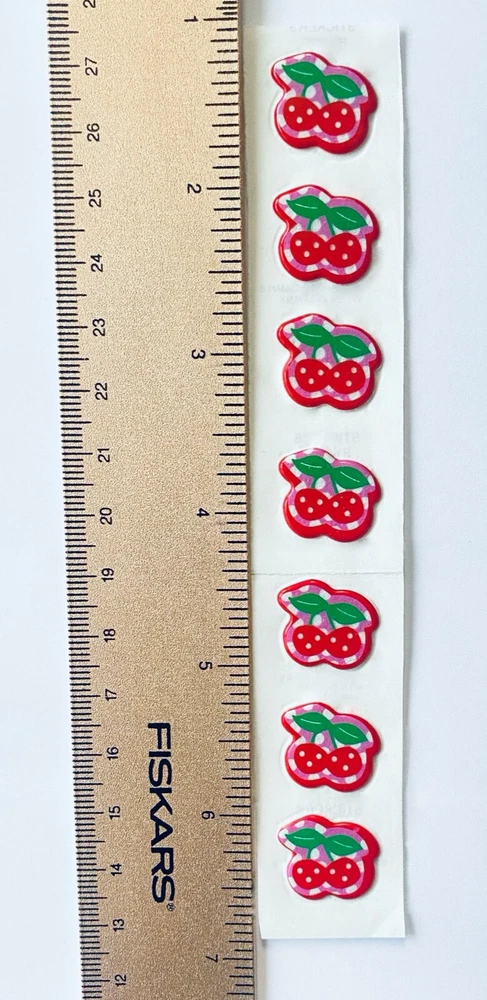 Vintage Set of 7 Count ~ 1983 Mrs. Grossman's Puffy Scratch N Sniff RED Cherries Stickers Vinyl Stick-Ons With Smell -Scent is not guaranteed due to age, but I am still able to smell every sticker. :) Each sticker is carefully unstucked and ready for use, making it easy to create unique and personalized embellishments for your scrapbooking needs. This set is a must-have for any collector or crafter, and is sure to bring a smile to your face. The stickers I am selling are from my Grandmother & Great Grandmother's personal sticker collection. Most are from over 30/40+ years ago. They have been in photo albums, boxes and plastic bags. These stickers are very Rare & in great condition. COLOR MAY VARY FROM DIFFERENT SCREENS PLEASE ASK ANY QUESTIONS YOU MAY HAVE ABOUT THE COLORING OF THIS ITEM BEFORE COMMITTING TO PURCHASING IT PLEASE. Check out my other collections! Thank you.
