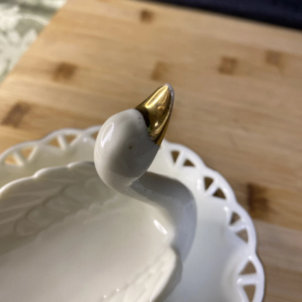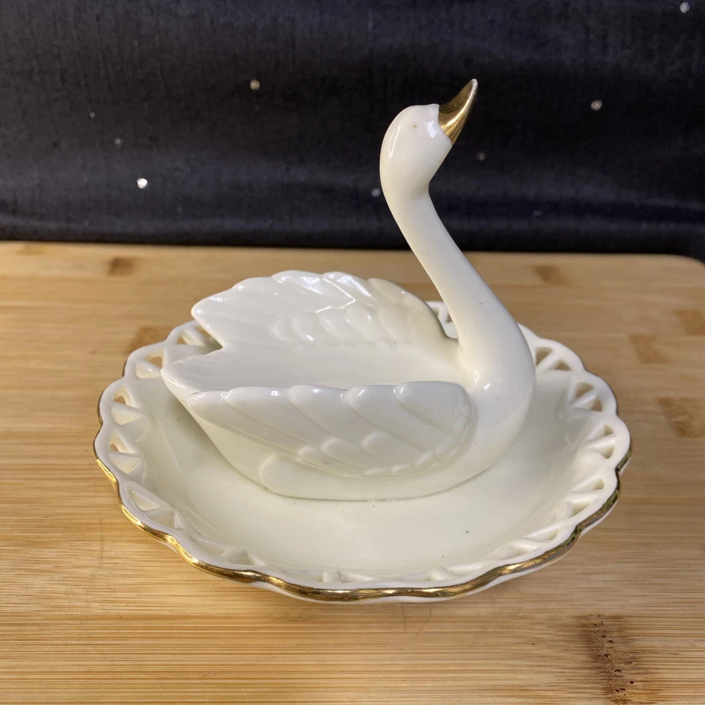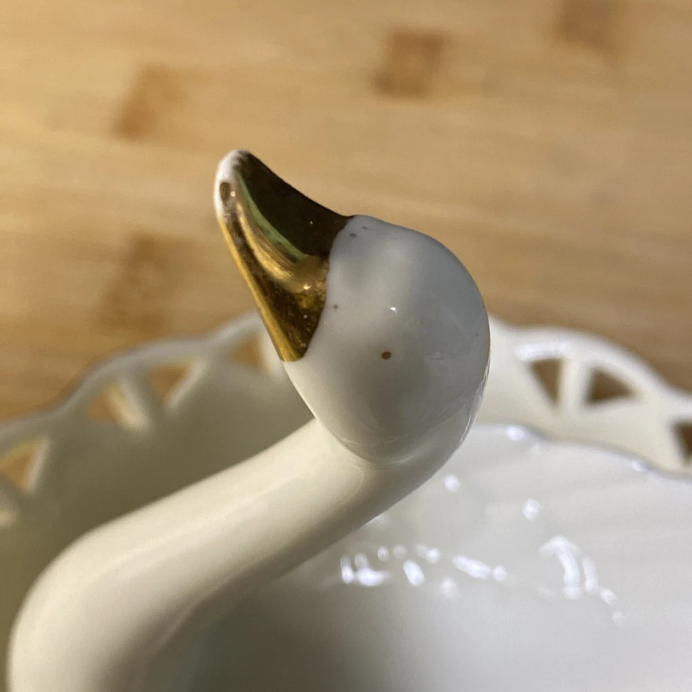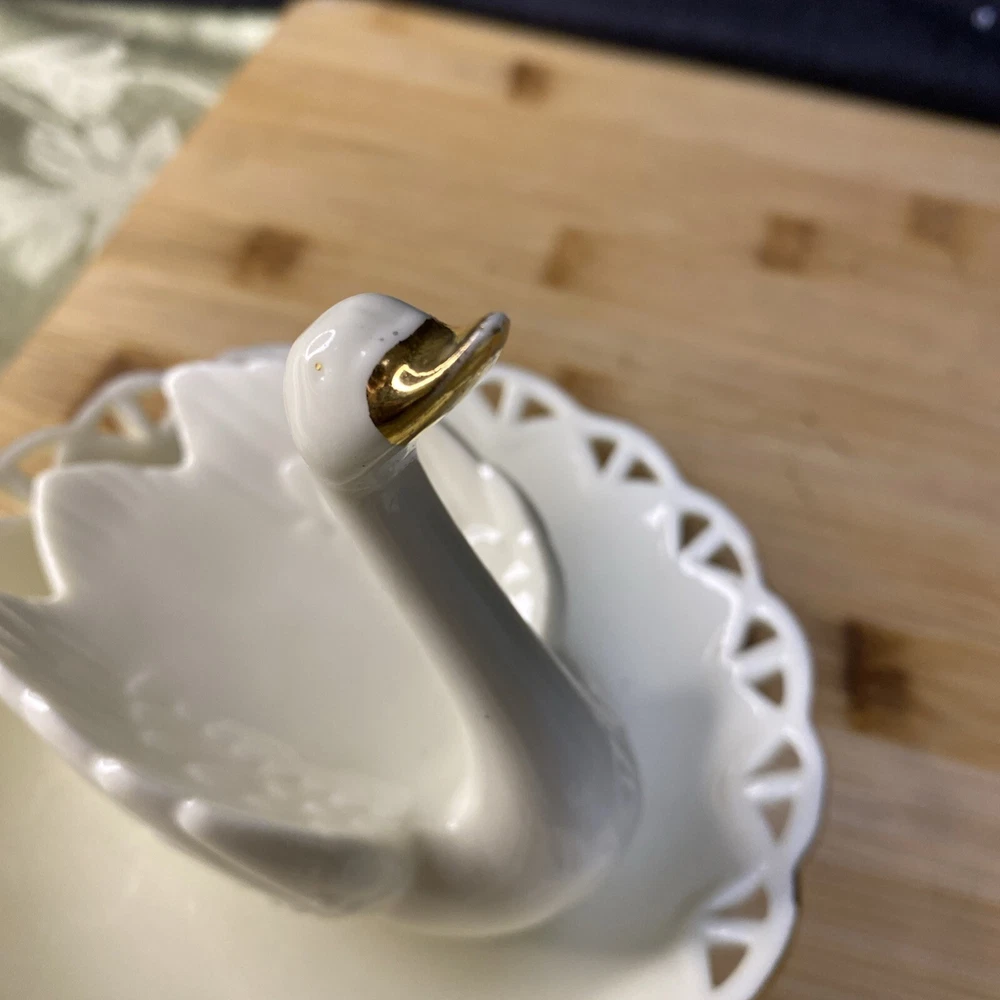 Beautiful white swan with gold accents, ring holder, earring and other jewelry holder. This item is preowned in great condition, with some of the gold on the beak rubbing off (see photos). Sold as is. Feel free to make an offer! Hg-009