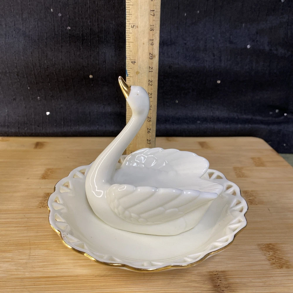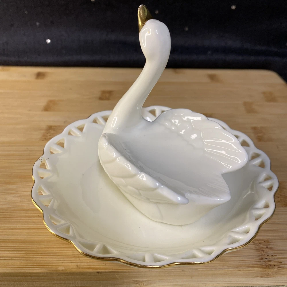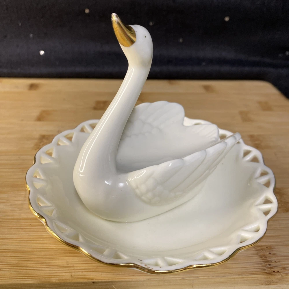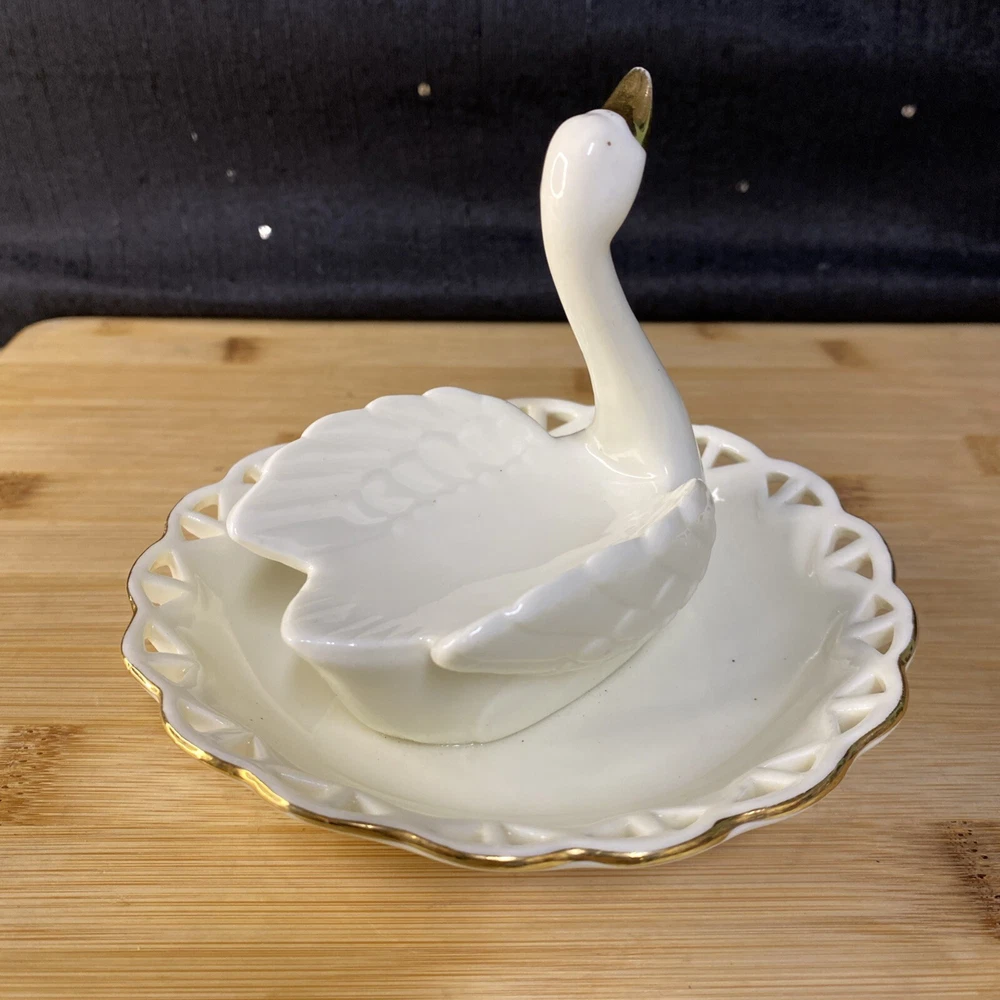 Beautiful white swan with gold accents, ring holder, earring and other jewelry holder. This item is preowned in great condition, with some of the gold on the beak rubbing off (see photos). Sold as is. Feel free to make an offer! Hg-009