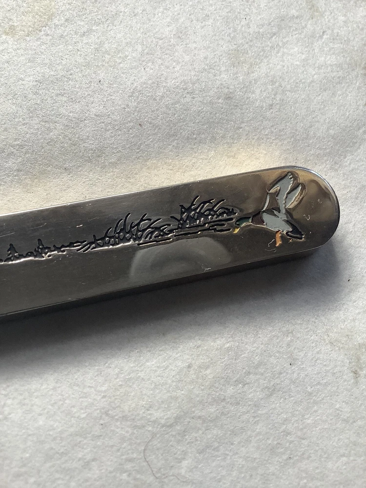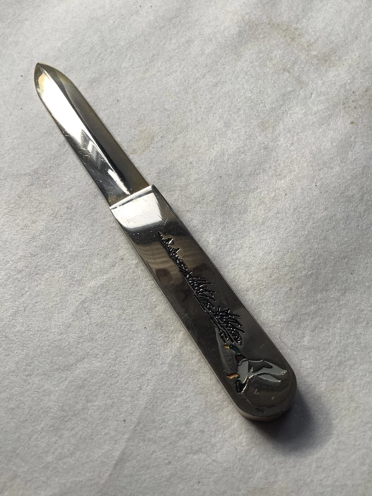 Up for bid is this great old brass letter opener with ducks in payed in pearl, great shape for age. I am a reseller! not a collector, so I might get something wrong in item description. Please use pic,s for best description, I try to take up close pics, But I strive to give accurate details so you are confident in bidding! See my knife feedbacks! I ship fast, reuse boxes to ship costs down, if you win multi auctions, wait till I invoice you with a shipping discount, then pay for items, Any questions please ask, Happy Bidding!! God Bless the USA!! SEE MY OTHER AUCTIONS FOR MORE ITEMS! Dave