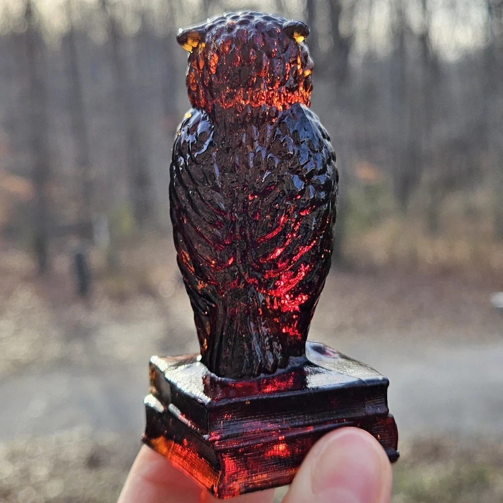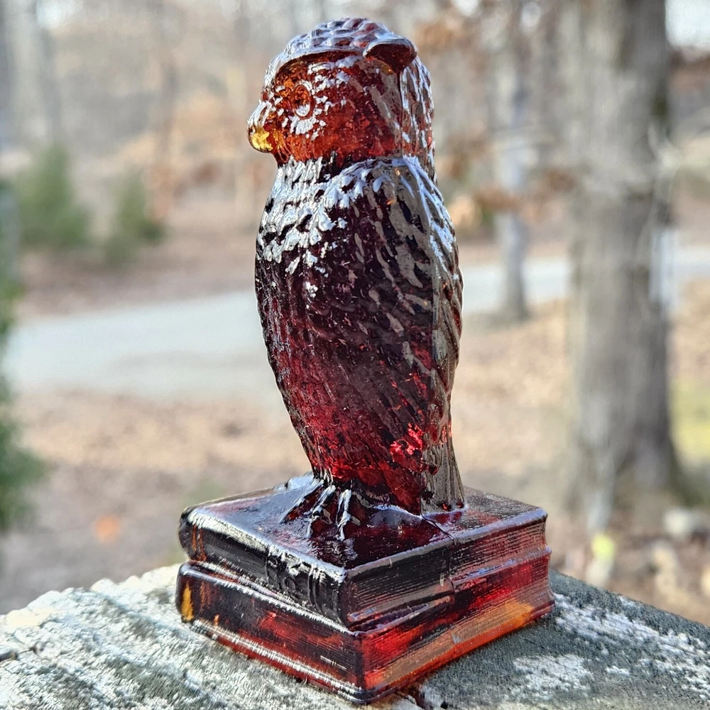 Up for auction is a RARE Degenhart glass owl in the color "Jabes Amber". This is a rich reddish amber. It's similar to a very dark burgundy or wine red. It's very beautiful in person. This is a hard to find color that was named after Jabe Tarter, a friend of the Degenharts. It's in excellent condition with no flaws of any kind. It looks stunning in the sunlight. It stands 3.5 inches tall and has the Degenhart "D" embossed on the bottom of the figurine. Degenhart Glass made this owl from 1967 to 1978. The owl was permanently retired in 1978 and never made again. All pictures were taken in natural outdoor lighting. I'm a highly experienced glass shipper, so you can rest assured that your item will be very carefully wrapped and will arrive safely. Please read below for info on the blacklight/UV light I use and recommendations on the best way to view your owl under a blacklight. 1. What blacklight do you use? The blacklight I use is the Lumenshooter S3 that I purchased through Amazon. This has a 365nm wavelength which is the best for viewing the fluorescing properties of Cadmium, Manganese and Selenium. Uranium glows even brighter than normal with this blacklight. 2. Are 365nm and 395nm blacklights the same? The are not! :) A 395nm blacklight emits a violet light and creates a less intense glow. It is best suited for Uranium glass only. I highly recommend purchasing a blacklight with a 365nm wavelength, as they have the advantage of not emitting violet light, which can be a distraction and create a less intense glow. Most objects containing Cadmium, Manganese, Selenium and Uranium will fluoresce strongest under a 365nm black light. 3. What is the best way to view my Degenhart Owl under a blacklight? I recommend using a completely dark room or closet with no additional lighting that could be a distraction. This will give you the brightest glow possible. All UV pictures in my listings are taken in a completely dark closet with only my blacklight and my phone on the night setting. Thank you for looking and please let me know if you have any questions. :)