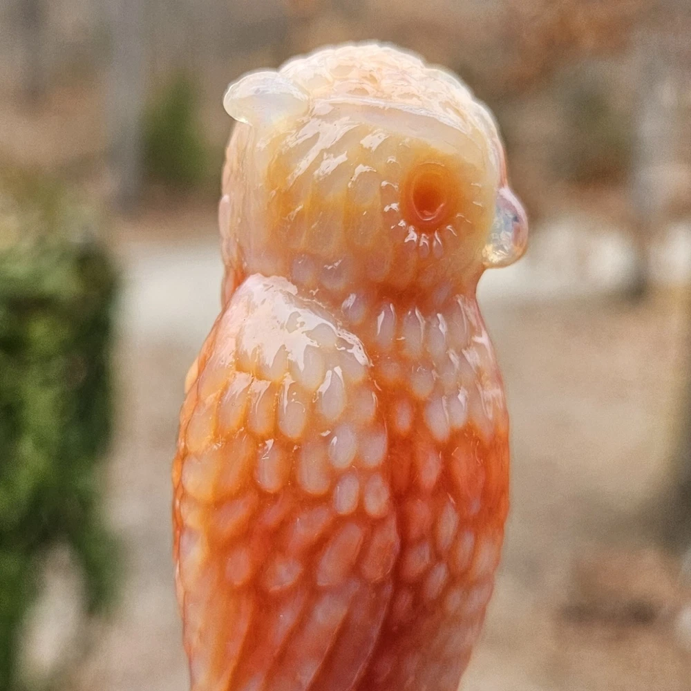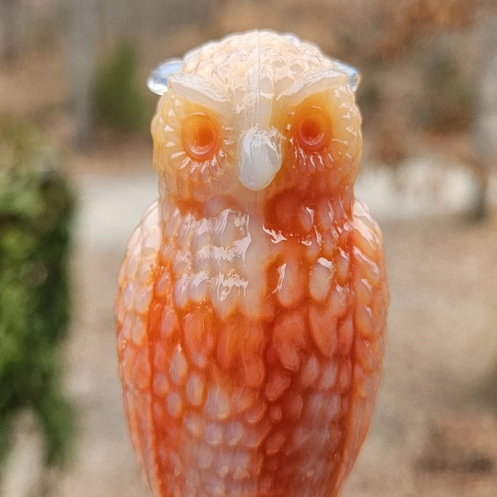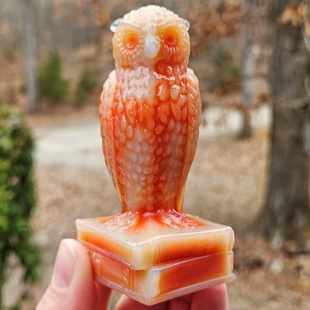 Up for auction is a RARE Degenhart slag glass owl in the color "Bloody Mary #2" (made in 1973). This color consists of cream custard glass with red and orange slag on top. This is a stunning color in person. It glows bright orange and red under a 365nm blacklight due to Cadmium and Selenium in the glass. It's in excellent condition with no flaws of any kind. It looks stunning in the sunlight. It stands 3.5 inches tall and has the Degenhart "D" embossed on the bottom of the figurine. Degenhart Glass made this owl from 1967 to 1978. The owl was permanently retired in 1978 and never made again. All pictures were taken in natural outdoor lighting. I'm a highly experienced glass shipper, so you can rest assured that your item will be very carefully wrapped and will arrive safely. Please read below for info on the blacklight/UV light I use and recommendations on the best way to view your owl under a blacklight. 1. What blacklight do you use? The blacklight I use is the Lumenshooter S3 that I purchased through Amazon. This has a 365nm wavelength which is the best for viewing the fluorescing properties of Cadmium, Manganese and Selenium. Uranium glows even brighter than normal with this blacklight. 2. Are 365nm and 395nm blacklights the same? The are not! :) A 395nm blacklight emits a violet light and creates a less intense glow. It is best suited for Uranium glass only. I highly recommend purchasing a blacklight with a 365nm wavelength, as they have the advantage of not emitting violet light, which can be a distraction and create a less intense glow. Most objects containing Cadmium, Manganese, Selenium and Uranium will fluoresce strongest under a 365nm black light. 3. What is the best way to view my Degenhart Owl under a blacklight? I recommend using a completely dark room or closet with no additional lighting that could be a distraction. This will give you the brightest glow possible. All UV pictures in my listings are taken in a completely dark closet with only my blacklight and my phone on the night setting. Thank you for looking and please let me know if you have any questions. :)