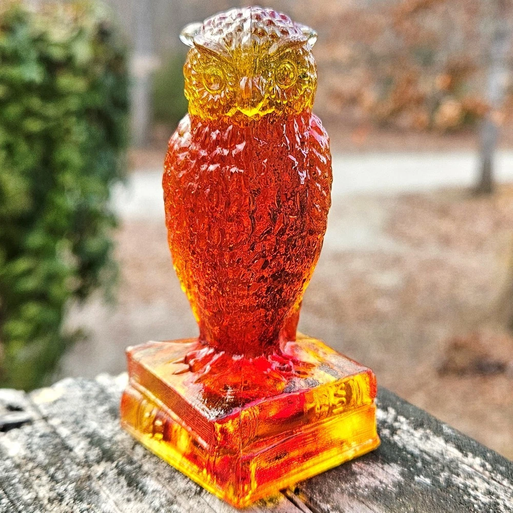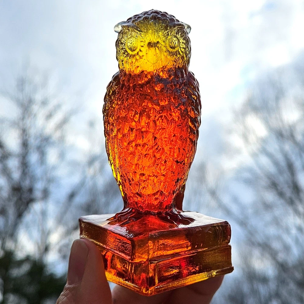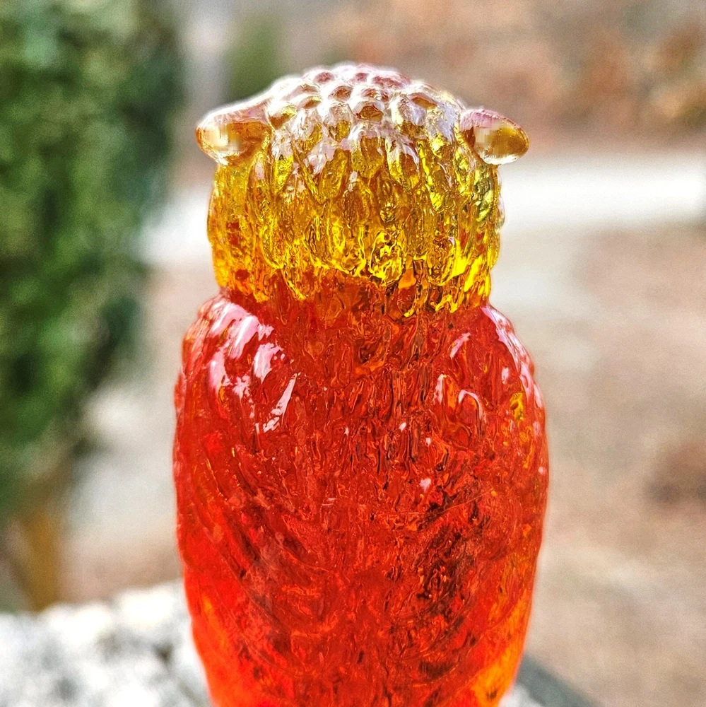 Up for auction is a vintage Degenhart slag glass owl in the color "Desert Sun Warmed in" (made in 1975). This color consists of a golden yellow with an intense orangish-red center. It was originally bought as "warmed in" because the red center was darker and covered more area than the regular "Desert Sun". It glows bright orange and red under a 365nm blacklight due to Cadmium and Selenium in the glass. It's in excellent condition with no flaws of any kind. It looks stunning in the sunlight. It stands 3.5 inches tall and has the Degenhart "D" embossed on the bottom of the figurine. Degenhart Glass made this owl from 1967 to 1978. The owl was permanently retired in 1978 and never made again. All pictures were taken in natural outdoor lighting. I'm a highly experienced glass shipper, so you can rest assured that your item will be very carefully wrapped and will arrive safely. Please read below for info on the blacklight/UV light I use and recommendations on the best way to view your owl under a blacklight. 1. What blacklight do you use? The blacklight I use is the Lumenshooter S3 that I purchased through Amazon. This has a 365nm wavelength which is the best for viewing the fluorescing properties of Cadmium, Manganese and Selenium. Uranium glows even brighter than normal with this blacklight. 2. Are 365nm and 395nm blacklights the same? The are not! :) A 395nm blacklight emits a violet light and creates a less intense glow. It is best suited for Uranium glass only. I highly recommend purchasing a blacklight with a 365nm wavelength, as they have the advantage of not emitting violet light, which can be a distraction and create a less intense glow. Most objects containing Cadmium, Manganese, Selenium and Uranium will fluoresce strongest under a 365nm black light. 3. What is the best way to view my Degenhart Owl under a blacklight? I recommend using a completely dark room or closet with no additional lighting that could be a distraction. This will give you the brightest glow possible. All UV pictures in my listings are taken in a completely dark closet with only my blacklight and my phone on the night setting. Thank you for looking and please let me know if you have any questions. :)