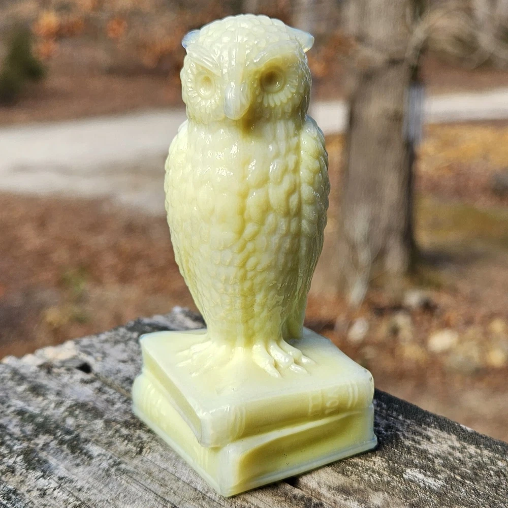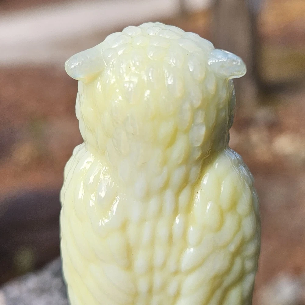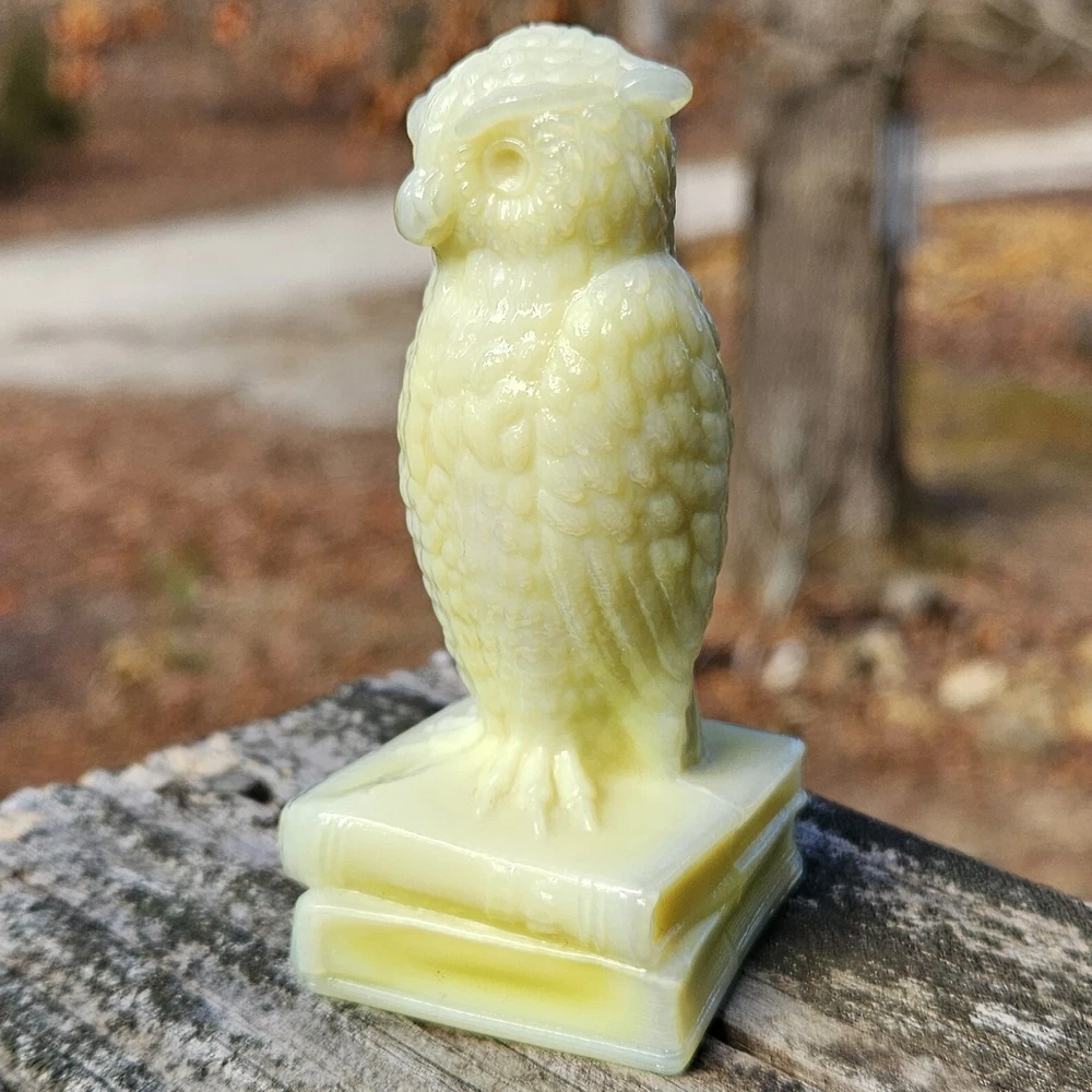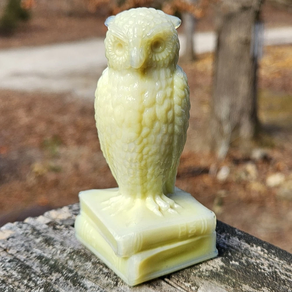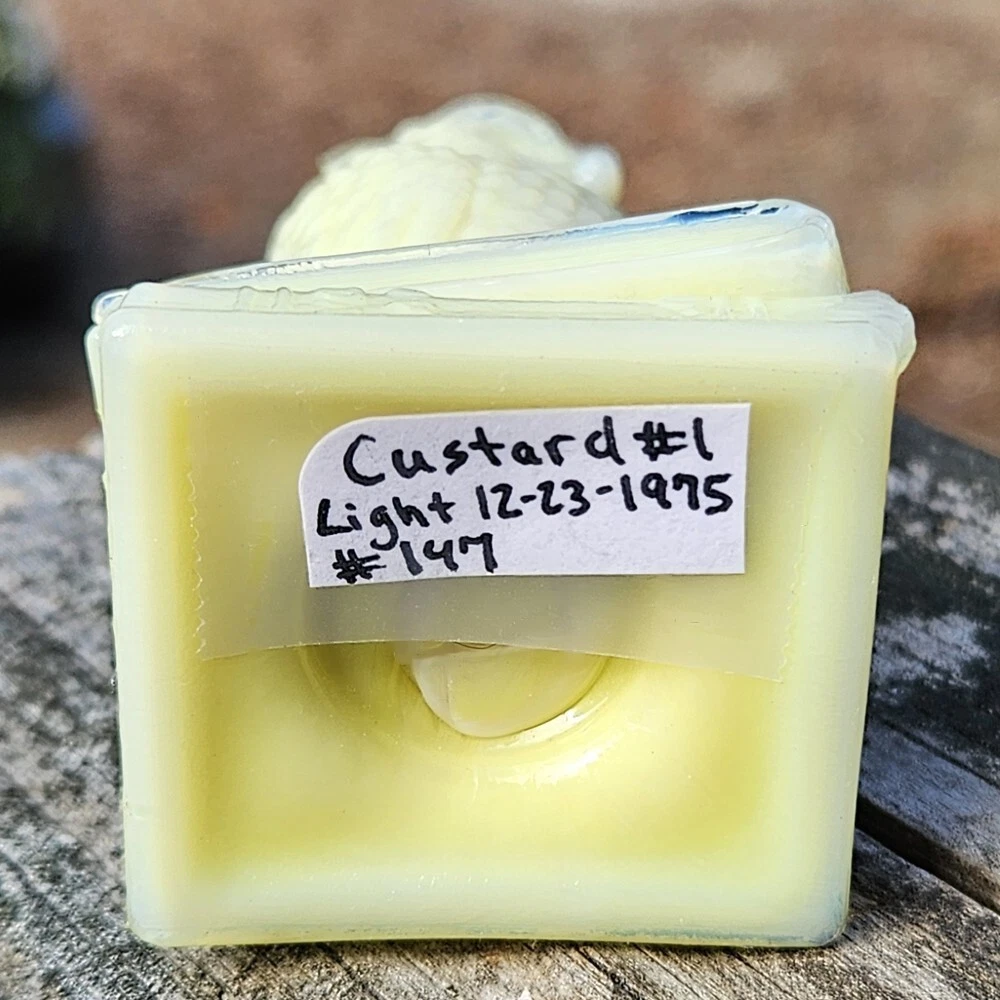 Up for auction is a Degenhart Cadmium glass owl in the color "Custard #1 (Light Custard)" (made on 12-23-1975). This is an opaque pale creamy yellow. It glows bright orange and yellow under a 365nm blacklight due to Cadmium and Selenium in the glass. It's in excellent condition with no flaws of any kind. It stands 3.5 inches tall and has the Degenhart "D" embossed on the bottom of the figurine. Degenhart Glass made this owl from 1967 to 1978. The owl was permanently retired in 1978 and never made again. All pictures were taken in natural outdoor lighting. I'm a highly experienced glass shipper, so you can rest assured that your item will be very carefully wrapped and will arrive safely. Please read below for info on the blacklight/UV light I use and recommendations on the best way to view your owl under a blacklight. 1. What blacklight do you use? The blacklight I use is the Lumenshooter S3 that I purchased through Amazon. This has a 365nm wavelength which is the best for viewing the fluorescing properties of Cadmium, Manganese and Selenium. Uranium glows even brighter than normal with this blacklight. 2. Are 365nm and 395nm blacklights the same? The are not! :) A 395nm blacklight emits a violet light and creates a less intense glow. It is best suited for Uranium glass only. I highly recommend purchasing a blacklight with a 365nm wavelength, as they have the advantage of not emitting violet light, which can be a distraction and create a less intense glow. Most objects containing Cadmium, Manganese, Selenium and Uranium will fluoresce strongest under a 365nm black light. 3. What is the best way to view my Degenhart Owl under a blacklight? I recommend using a completely dark room or closet with no additional lighting that could be a distraction. This will give you the brightest glow possible. All UV pictures in my listings are taken in a completely dark closet with only my blacklight and my phone on the night setting. Thank you for looking and please let me know if you have any questions. :)