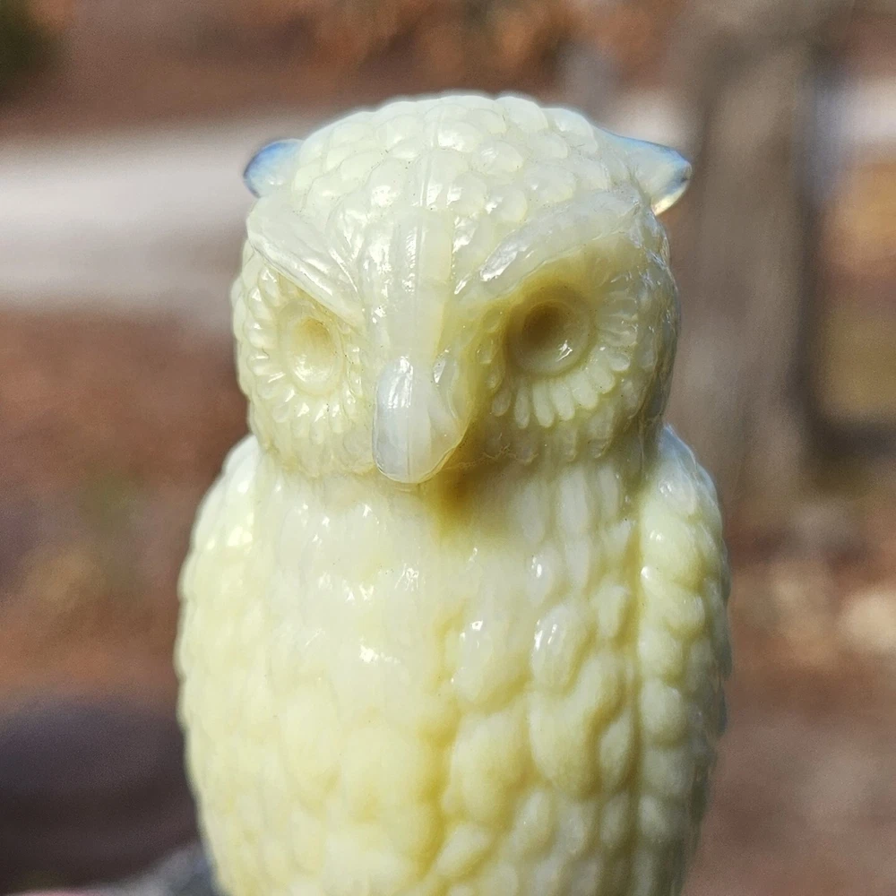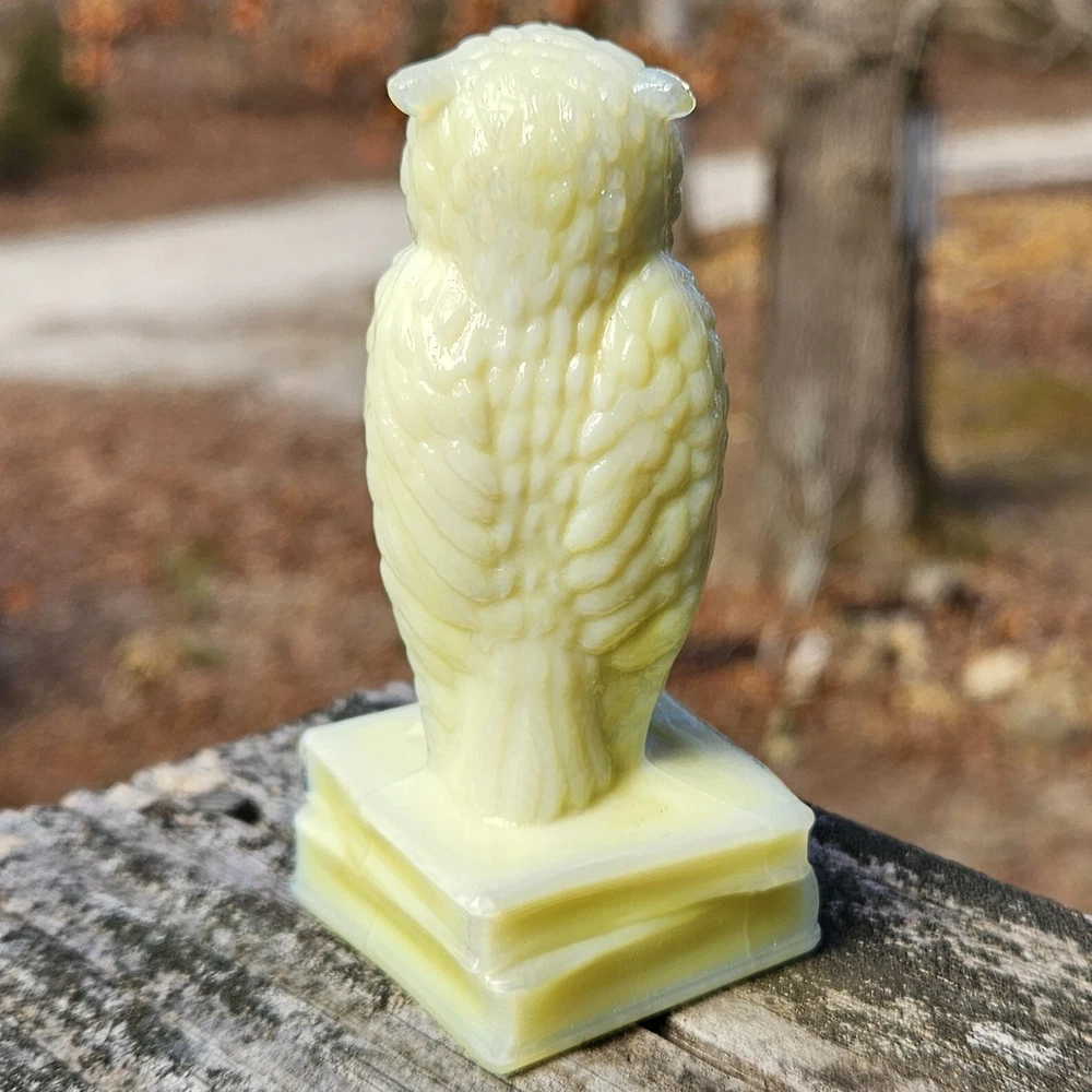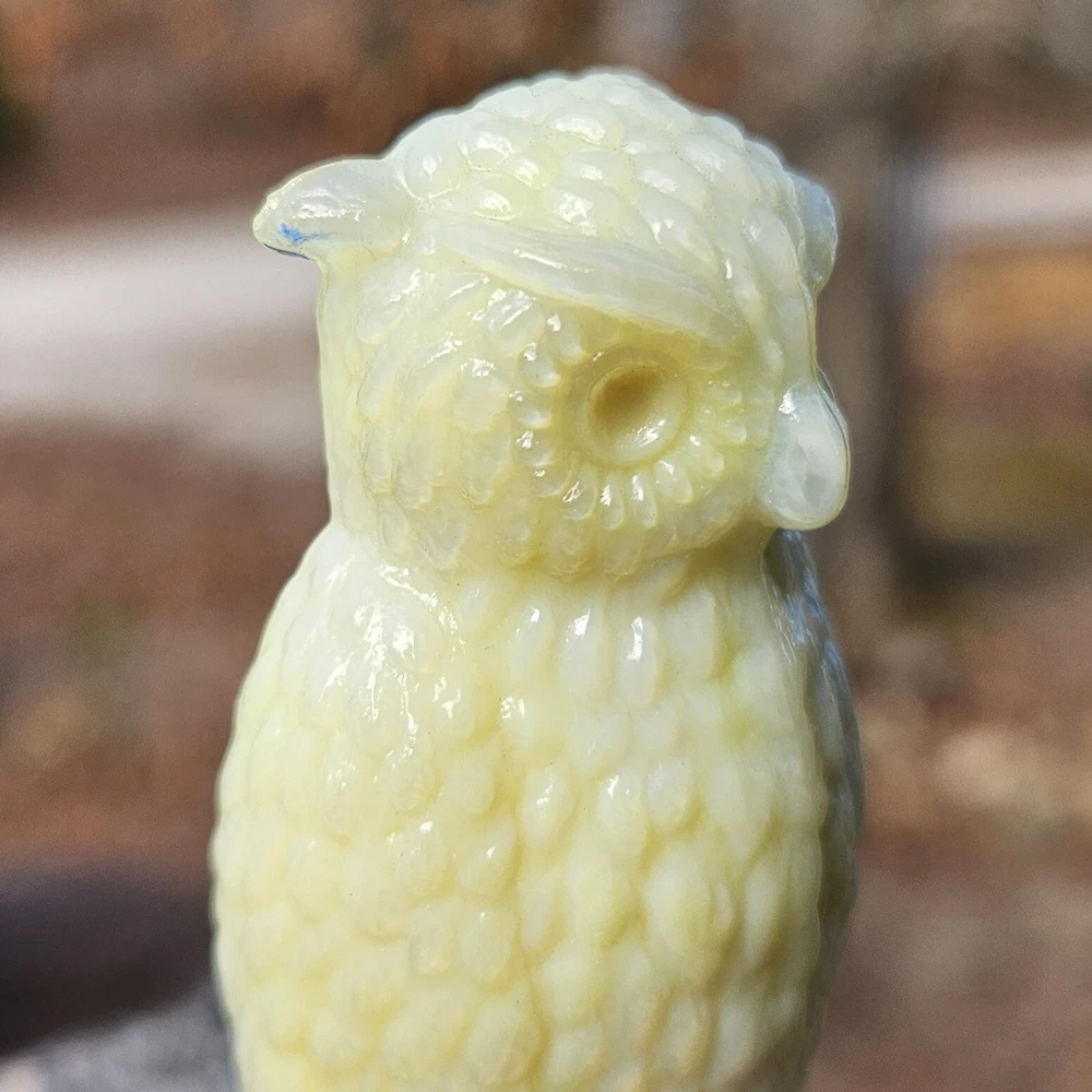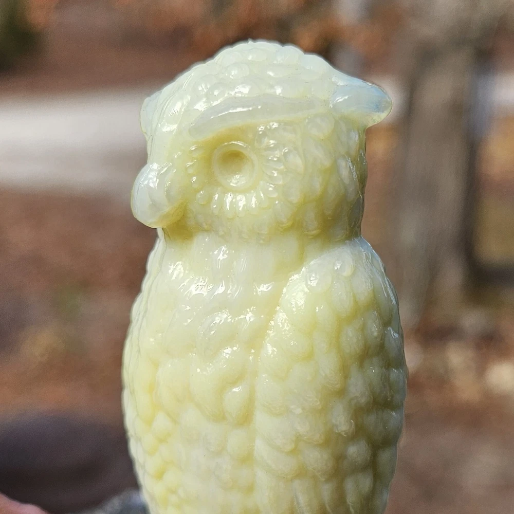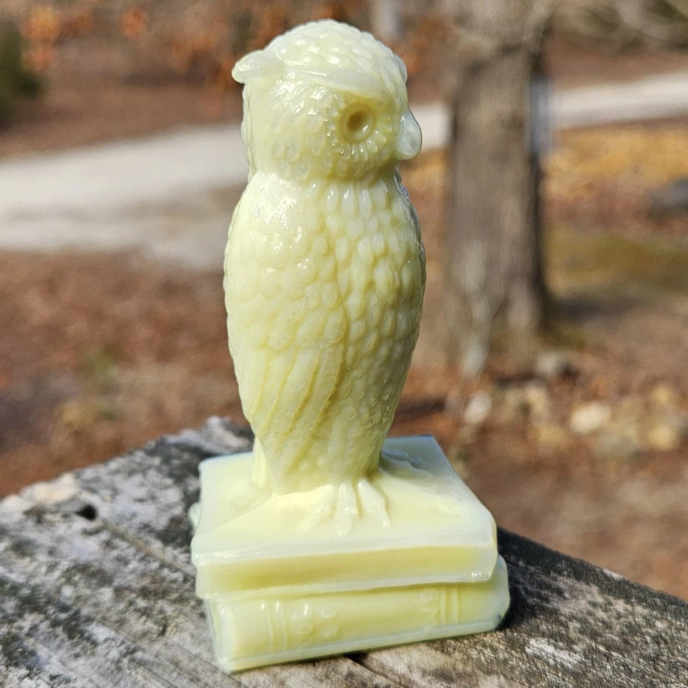 Up for auction is a Degenhart Cadmium glass owl in the color "Custard #1 (Light Custard)" (made on 12-23-1975). This is an opaque pale creamy yellow. It glows bright orange and yellow under a 365nm blacklight due to Cadmium and Selenium in the glass. It's in excellent condition with no flaws of any kind. It stands 3.5 inches tall and has the Degenhart "D" embossed on the bottom of the figurine. Degenhart Glass made this owl from 1967 to 1978. The owl was permanently retired in 1978 and never made again. All pictures were taken in natural outdoor lighting. I'm a highly experienced glass shipper, so you can rest assured that your item will be very carefully wrapped and will arrive safely. Please read below for info on the blacklight/UV light I use and recommendations on the best way to view your owl under a blacklight. 1. What blacklight do you use? The blacklight I use is the Lumenshooter S3 that I purchased through Amazon. This has a 365nm wavelength which is the best for viewing the fluorescing properties of Cadmium, Manganese and Selenium. Uranium glows even brighter than normal with this blacklight. 2. Are 365nm and 395nm blacklights the same? The are not! :) A 395nm blacklight emits a violet light and creates a less intense glow. It is best suited for Uranium glass only. I highly recommend purchasing a blacklight with a 365nm wavelength, as they have the advantage of not emitting violet light, which can be a distraction and create a less intense glow. Most objects containing Cadmium, Manganese, Selenium and Uranium will fluoresce strongest under a 365nm black light. 3. What is the best way to view my Degenhart Owl under a blacklight? I recommend using a completely dark room or closet with no additional lighting that could be a distraction. This will give you the brightest glow possible. All UV pictures in my listings are taken in a completely dark closet with only my blacklight and my phone on the night setting. Thank you for looking and please let me know if you have any questions. :)