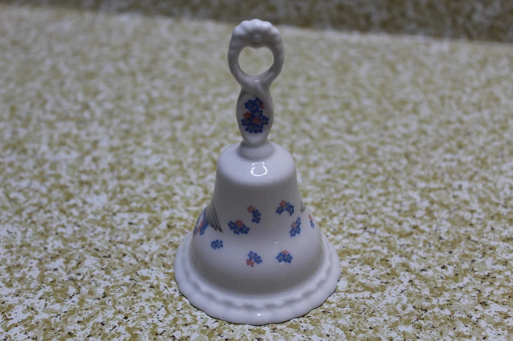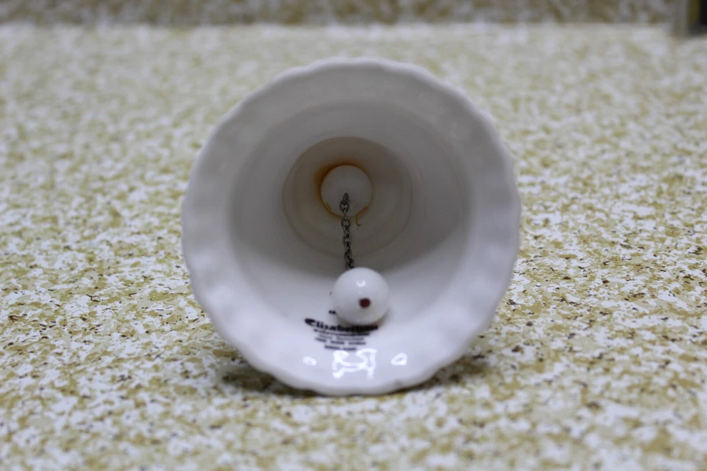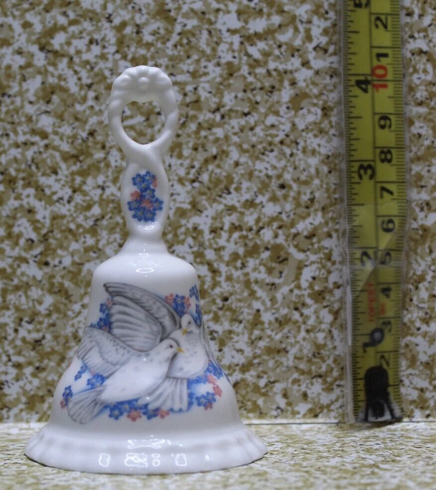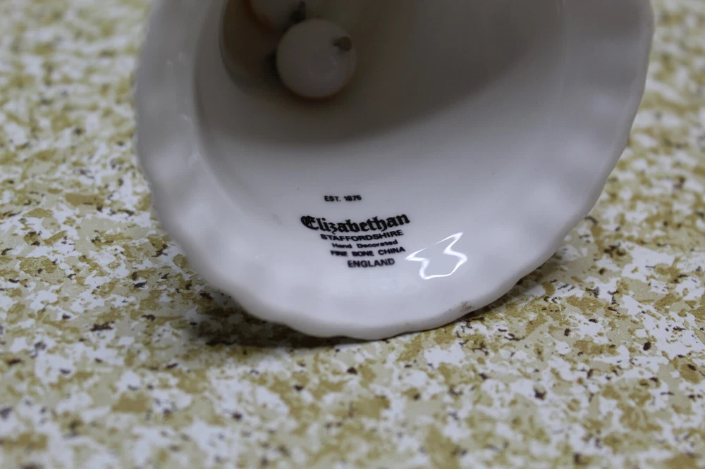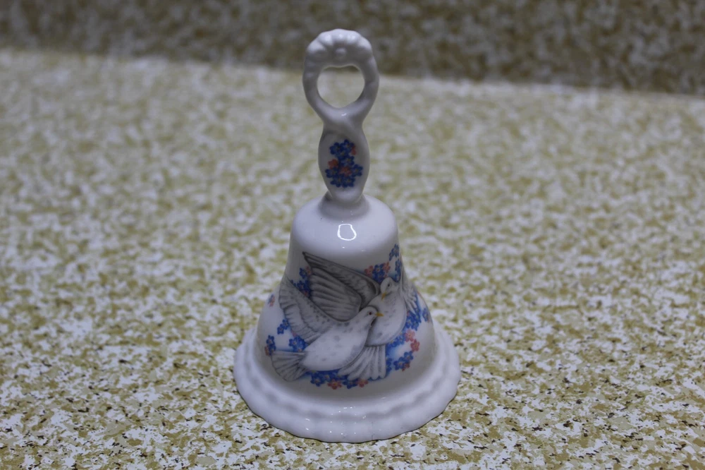 This vintage tea bell is a beautiful addition to any collection. Made in England by Elizabethan Staffordshire, it is crafted from fine bone china with a glossy finish. The bell features a white and blue doves pattern and stands at 4 inches tall. It has a Victorian style and is a licensed original reproduction. This decorative piece is perfect for collectors or as a gift for someone special. Add this exquisite bell to your pottery and glassware collection today.