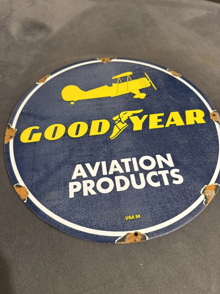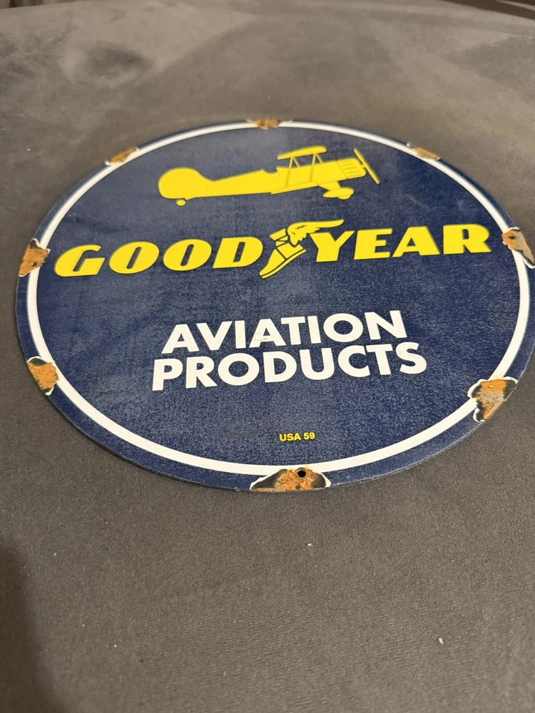 This vintage porcelain sign is a must-have for collectors of automobile parts and memorabilia. Featuring the iconic Goodyear logo, this sign is a great addition to any collection of advertising signs. Made in the United States, this preowned sign is a unique piece of history that will add character to any space. Perfect for fans of aviation and tires, this sign is a great way to show off your love for vintage advertising. The sign is made from high-quality porcelain, ensuring that it will last for years to come. Don't miss out on this one-of-a-kind piece of history!