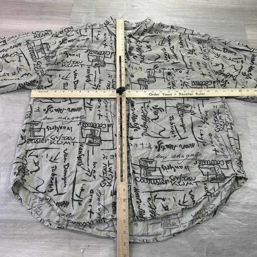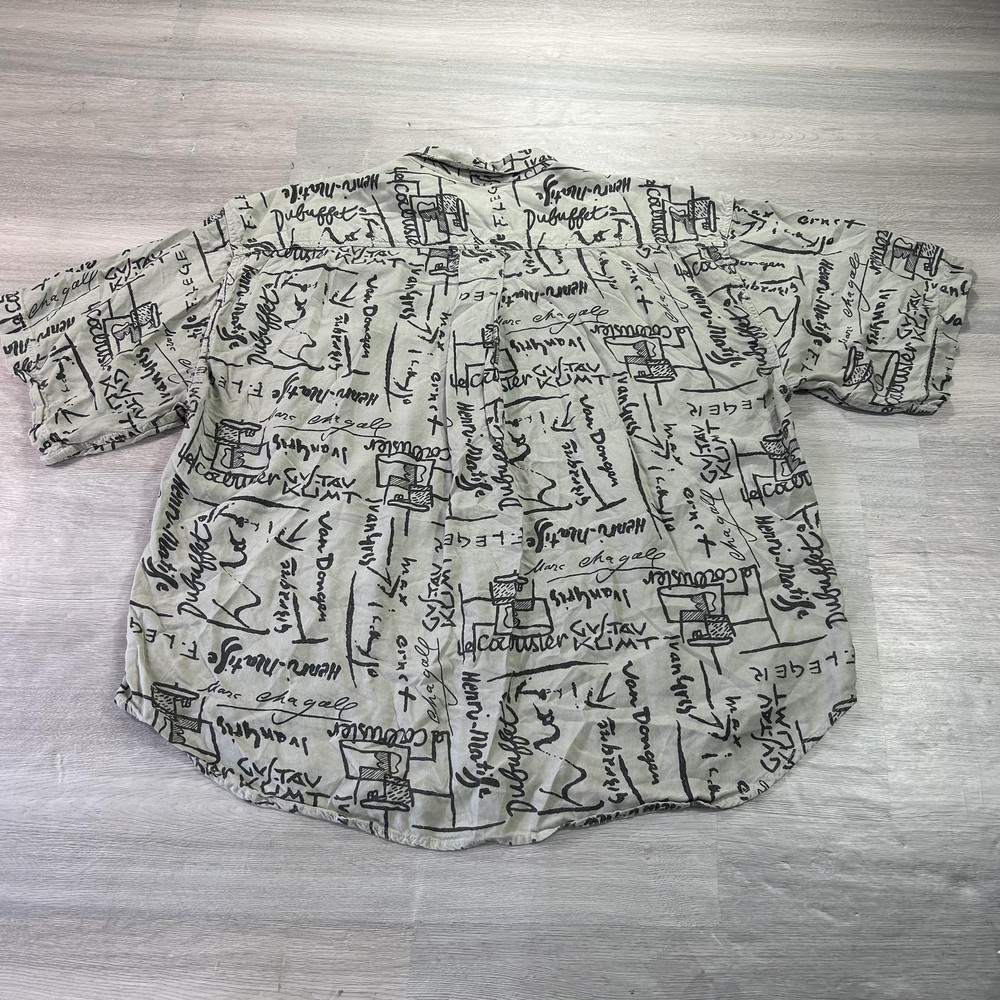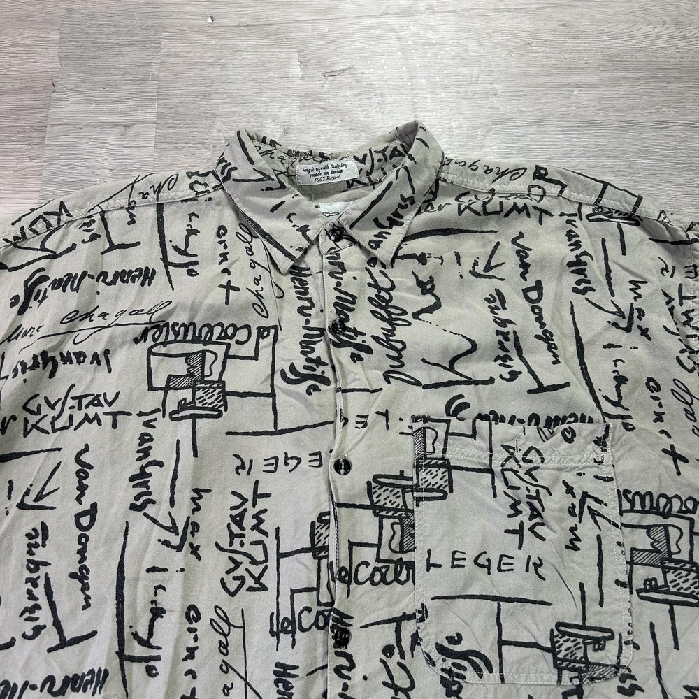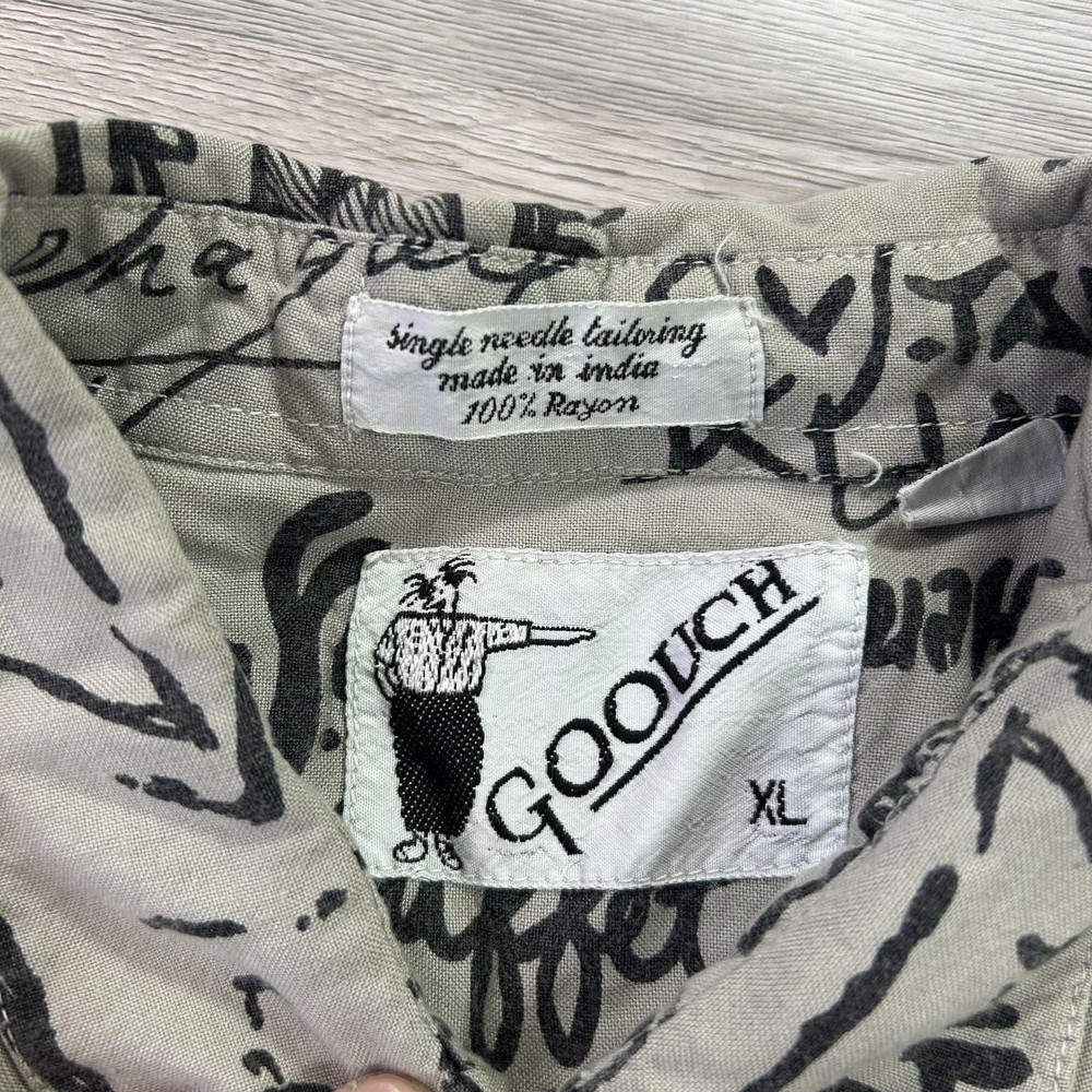 Brand: Goouch. Style: Men's vintage short sleeve button-up shirt with a relaxed, drapey silhouette and art-inspired allover print. Color: Light beige body with contrasting black script, artist names, and abstract sketch graphics throughout. Tag size: Mens XL as indicated on the interior Goouch neck label. Material: 100% rayon as noted on the interior single needle tailoring fabric tag. Country of origin and label info: Interior labels feature the Goouch figure logo along with single needle tailoring and fiber content details, plus a separate woven care label. Branding and logos: Goouch woven neck label with illustrated figure graphic; no exterior brand logo on the shirt body. Design details: Point collar, full front button closure with tonal buttons, single chest patch pocket, back yoke with pleats for ease of movement, short sleeves, and a rounded shirttail hem. Features: Lightweight, soft rayon fabric with an allover handwritten-style graphic print referencing notable artists and abstract motifs, designed for a bold, artistic look. Fit and use: Regular-fit men's casual shirt ideal for warm-weather wear, vacations, resort outfits, or expressive everyday streetwear styling. Additional info: Interior care tag provides washing instructions including wash separately in cold water, do not bleach, drip dry, and warm iron settings.