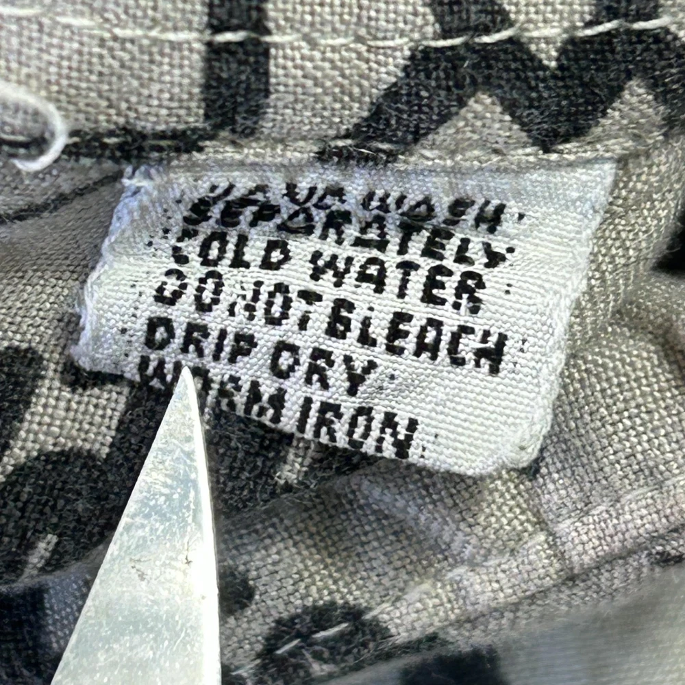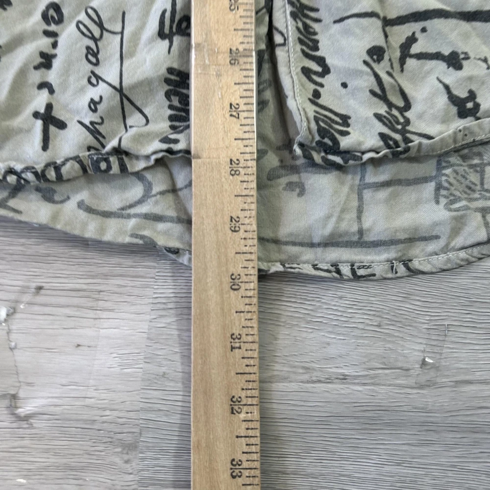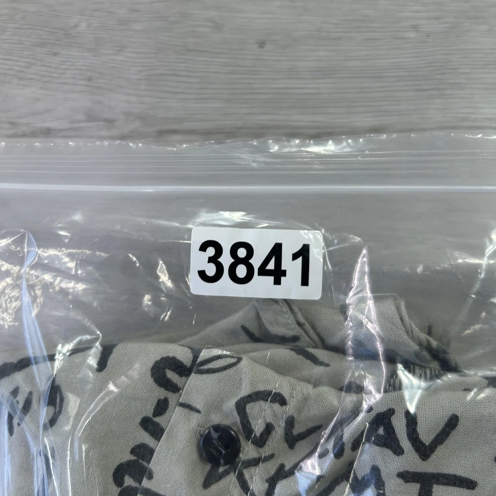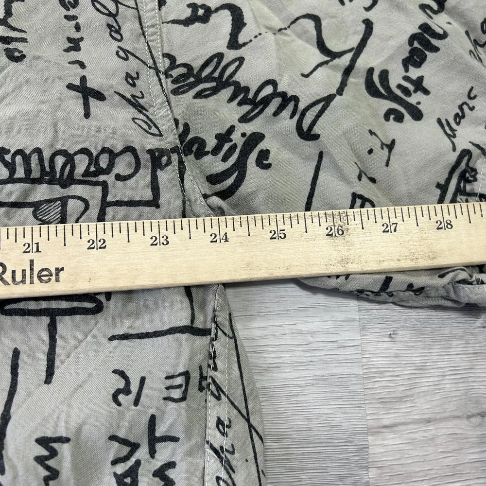 Brand: Goouch. Style: Men's vintage short sleeve button-up shirt with a relaxed, drapey silhouette and art-inspired allover print. Color: Light beige body with contrasting black script, artist names, and abstract sketch graphics throughout. Tag size: Mens XL as indicated on the interior Goouch neck label. Material: 100% rayon as noted on the interior single needle tailoring fabric tag. Country of origin and label info: Interior labels feature the Goouch figure logo along with single needle tailoring and fiber content details, plus a separate woven care label. Branding and logos: Goouch woven neck label with illustrated figure graphic; no exterior brand logo on the shirt body. Design details: Point collar, full front button closure with tonal buttons, single chest patch pocket, back yoke with pleats for ease of movement, short sleeves, and a rounded shirttail hem. Features: Lightweight, soft rayon fabric with an allover handwritten-style graphic print referencing notable artists and abstract motifs, designed for a bold, artistic look. Fit and use: Regular-fit men's casual shirt ideal for warm-weather wear, vacations, resort outfits, or expressive everyday streetwear styling. Additional info: Interior care tag provides washing instructions including wash separately in cold water, do not bleach, drip dry, and warm iron settings.