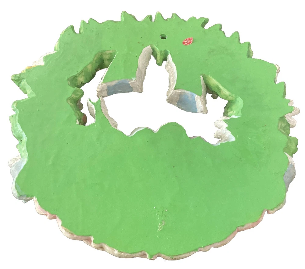 This vintage ceramic figurine from Spring brand features a hand-painted design of a colorful Easter wreath with flowers, bunnies, and eggs. Measuring 11.5 inches in length, it has a matte finish and is perfect for adding a festive touch to your Easter decor. Whether displayed on a mantel, shelf, or table, this medium-sized figurine is sure to bring joy to your home.