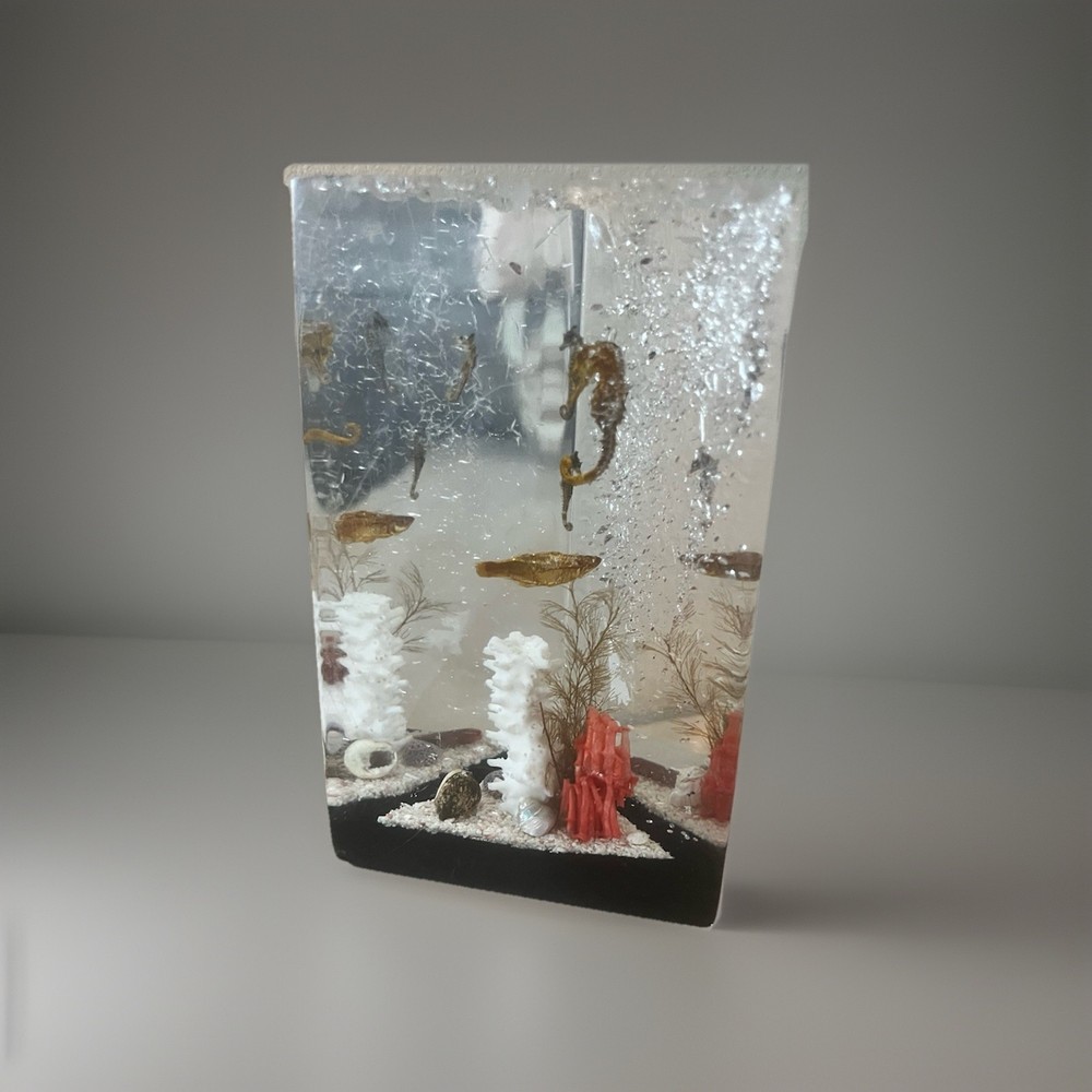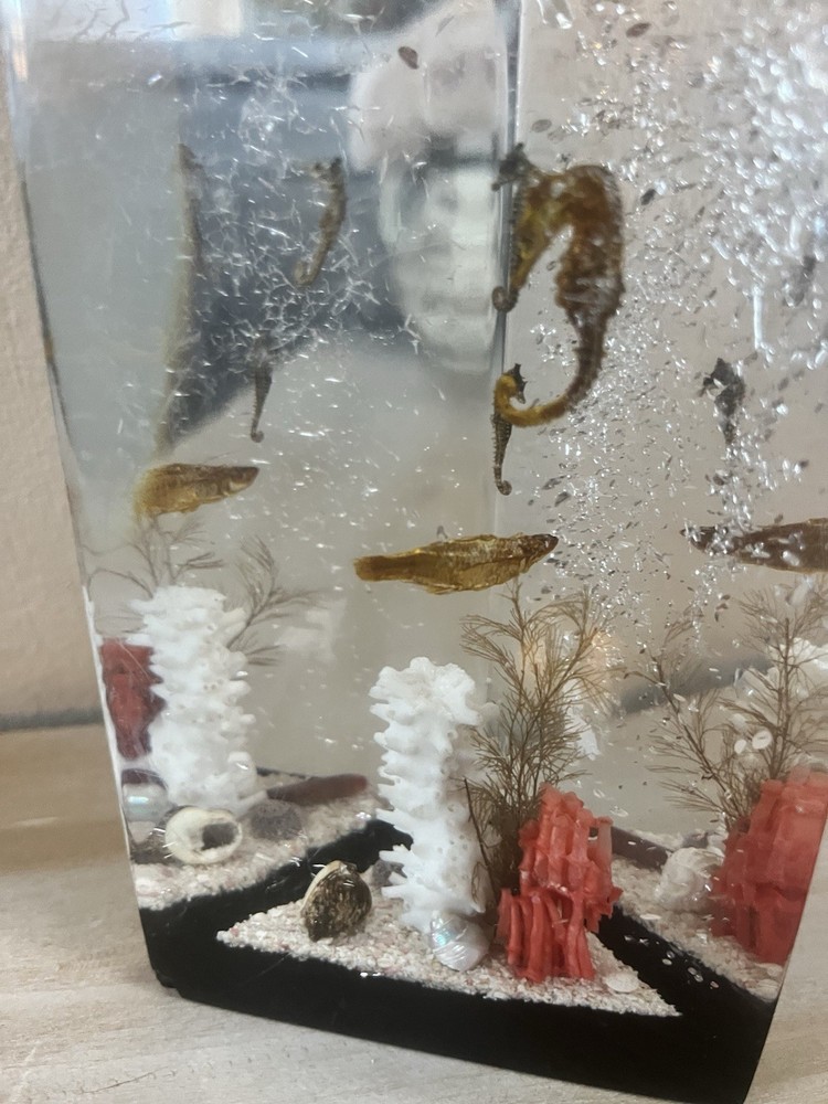 This vintage Lucite ocean beach decor diorama features a unique design of shells, sea fish, and horseshoe-shaped objects, all beautifully embedded within a clear Lucite material. Handmade in the United States, this decorative collectible piece adds a touch of nostalgia and charm to any space. Perfect for collectors or those looking to add a whimsical accent to their home or office decor, this paperweight is a one-of-a-kind conversation piece that celebrates the beauty of the ocean and the sea.