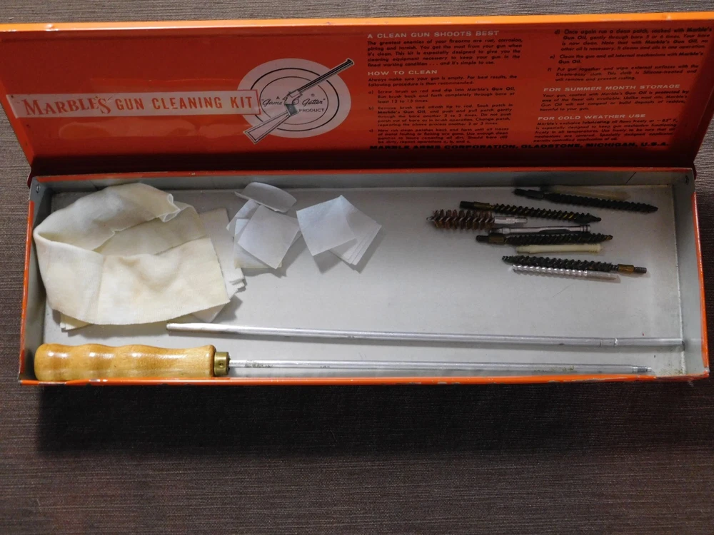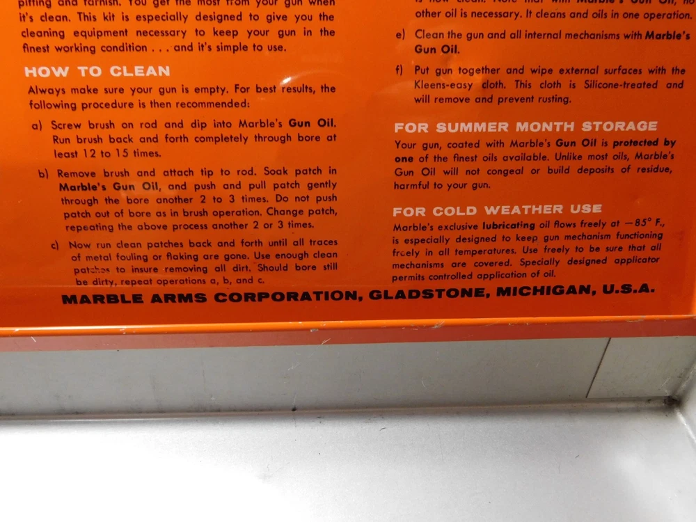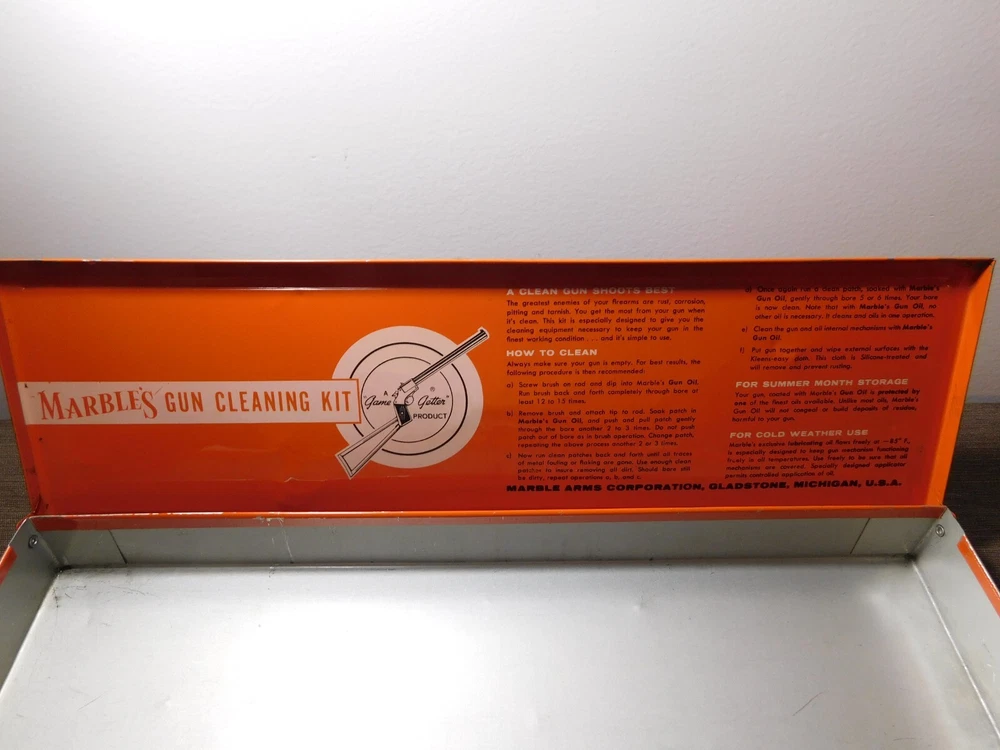 YOU ARE BIDDING ON ...... VINTAGE MARBLE'S GUN CLEANING KIT *INCOMPLETE* .. ...COMES WITH WHATS SHOWN..SHOWS ALOT OF USAGE/AGE WEAR.HAS SCRATCHES/PAINT LOSS/AGE DISCOLORATION/DINGS & DENTS/RESIDUE OF OLD TAPE....PLEASE VIEW PHOTOS FOR CONDITION... ***PLEASE E-MAIL IF YOU HAVE A QUESTION OR WANT AN ADDITIONAL PICTURE....PLEASE VISIT MY EBAY STORE FOR OTHER VINTAGE ITEMS..THANK YOU***7X-BX0404-XXXX