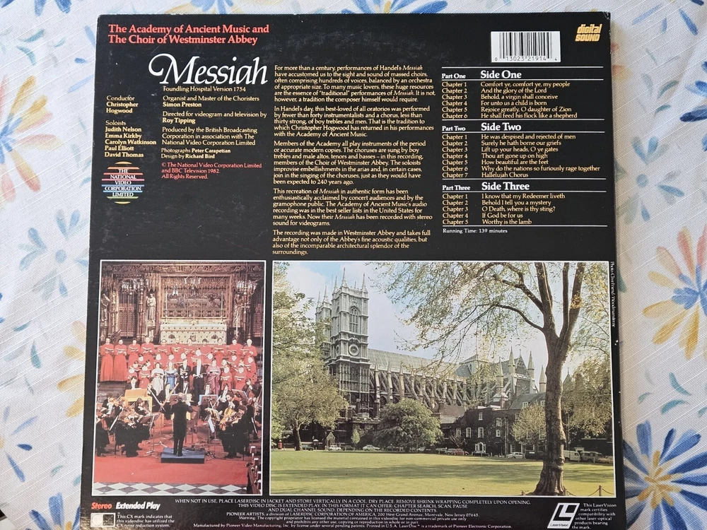 This pair of vintage laserdiscs features a stunning rendition of Handel's Messiah by the Westminster Choir and the Academy of Ancient Music. The discs are perfect for fans of opera and Broadway musicals alike, and are sure to provide hours of entertainment. With their large format and superior sound quality, these laserdiscs are the ideal way to experience this timeless classic. Whether you're a collector of rare musical recordings or simply looking for an engaging way to spend an evening, these laserdiscs are the perfect choice. Excellent Condition and same day shipping 🙂