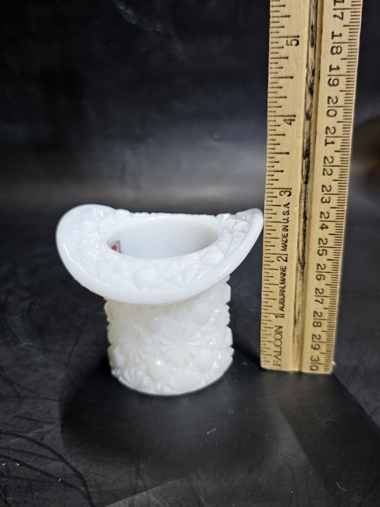 In excellent condition This Vintage Mid Century Fenton Milk Glass Top Hat Daisy Dot Toothpick Holder is a charming piece of decorative pottery and glassware originating from North America. The elegant design features a classic daisy and dots pattern on white milk glass, with a whimsical nod to the subject of a top hat. This vintage original piece from the Fenton brand captures the essence of the mid-century era with its unique style and production techniques. Perfect for collectors or those looking to add a touch of nostalgia to their home decor.