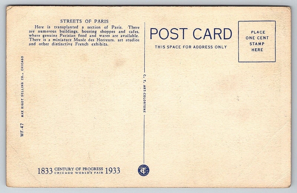 VINTAGE OLD ANTIQUE POSTCARD 1933 CHICAGO WORLDS FAIR STREETS OF PARIS BLIMP USA