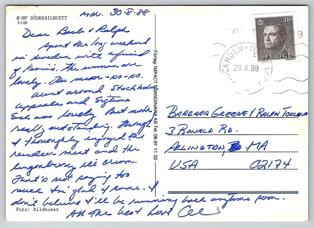 City: Stockholm Material: Paper Finish: Glossy Artist: Postcard Postage Condition: Posted UPC: DOES NOT APPLY Theme: Architecture, Cities & Towns, Community Life, Countries, Cultures & Ethnicities, Domestic & Family Life, Famous Places, Historical Figures, Landscapes, Nautical, Photographs, Seasons, Social History, Technology, Tourism, Transportation, Travel, Postcard, Antique, Vintage, Ephemera, Collectible, Memorabilia, Old, Retro, History, Card, Mail, Paper Brand/Publisher: IMPACT SCANDINAVIA Franchise: Postcard Country: Sweden Posted: Yes Subject: Bridge Color: Multicolor Location: Stockholm, Sweden Number of Items in Set: 1 Vintage: Yes Type: VINTAGE OLD ANTIQUE POSTCARD Signed By: Sender Antique: Yes Character: Postcard Unit of Sale: Single Unit gtin13: DOES NOT APPLY Seller Notes: “Good Vintage Condition. See Pictures And Description Closely For Details.” Stamp: Yes Era: Divided Back (1907-1915) Featured Person: None Continent: North America Time Period Manufactured: 1980-1989 Original/Licensed Reprint: Original Year Manufactured: 1988 Orientation: Vertical Features: Divided Back, Original Genuine Antique Vintage Postcard Occasion: Postcard Size: Continental (6 x 4 in) Country/Region of Manufacture: Sweden Signed: Yes Region: Stockholm