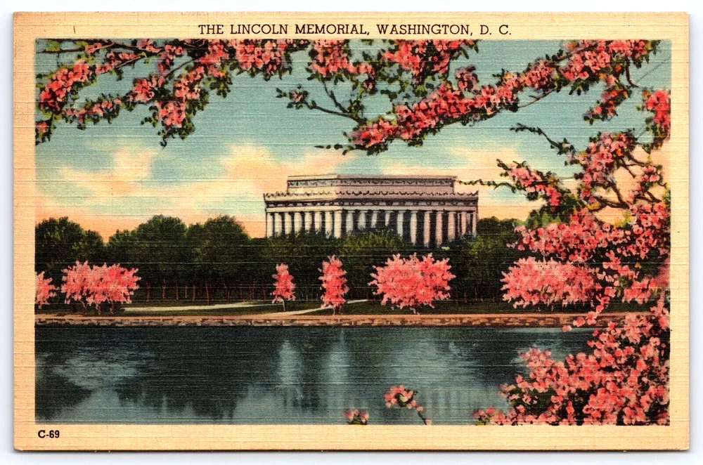 VINTAGE OLD ANTIQUE POSTCARD LINCOLN MEMORIAL CHERRY BLOSSOM WASHINGTON D.C. USA