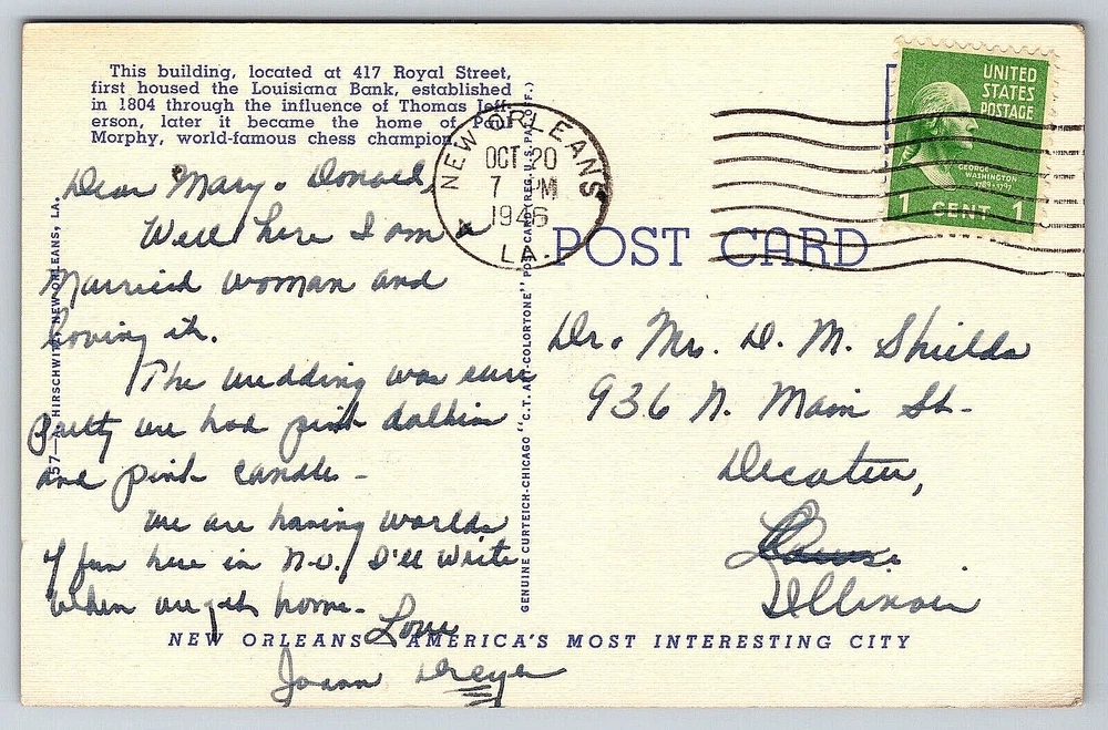 Subject: Cities & Towns Year Manufactured: 1946 Finish: Matte Country/Region of Manufacture: United States Stamp: Yes Unit of Sale: Single Unit UPC: DOES NOT APPLY gtin13: DOES NOT APPLY Original/Licensed Reprint: Original Location: New Orleans, Louisiana USA Region: Louisiana Character: Postcard Signed By: None Franchise: Postcard Brand/Publisher: Curt Teich Postage Condition: Posted Time Period Manufactured: 1940-1949 Occasion: Postcard Vintage: Yes Theme: Architecture, Cities & Towns, Community Life, Domestic & Family Life, Famous Places, Historical Figures, Seasons, Social History, Tourism, Postcard, Antique, Vintage, Ephemera, Collectible, Memorabilia, Old, Retro, History, Card, Mail, Paper City: New Orleans Featured Person: None Antique: Yes Features: Divided Back, Stamp, Stamped, Original Genuine Antique Vintage Postcard Type: VINTAGE OLD ANTIQUE POSTCARD Artist: Postcard Number of Items in Set: 1 Continent: North America Size: Standard (5.5 x 3.5 in) Seller Notes: “Good Vintage Condition. See Pictures And Description Closely For Details.” Country: United States Signed: No Color: Multicolor Orientation: Horizontal Posted: Yes Material: Paper Era: Divided Back (1907-1915)