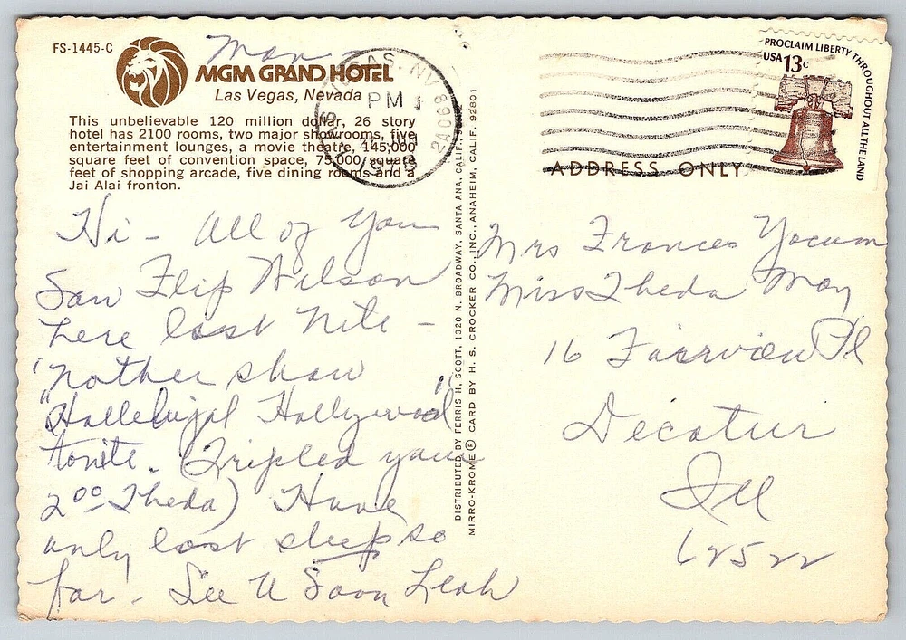 VINTAGE OLD ANTIQUE POSTCARD PICTURE MGM GRAND HOTEL CARS LAS VEGAS NEVADA USA