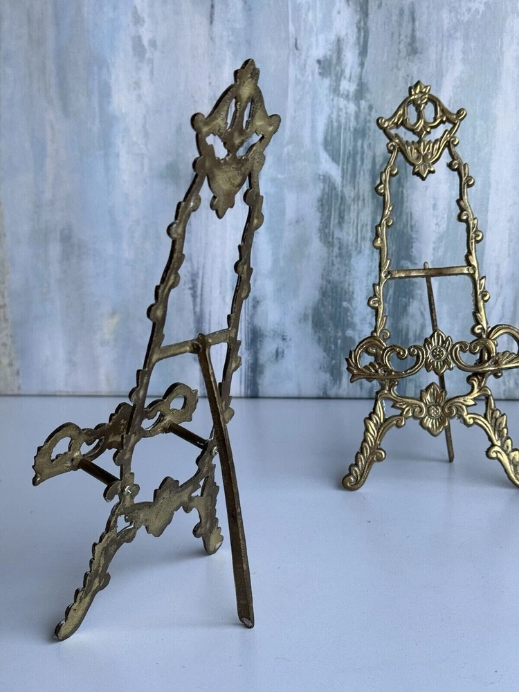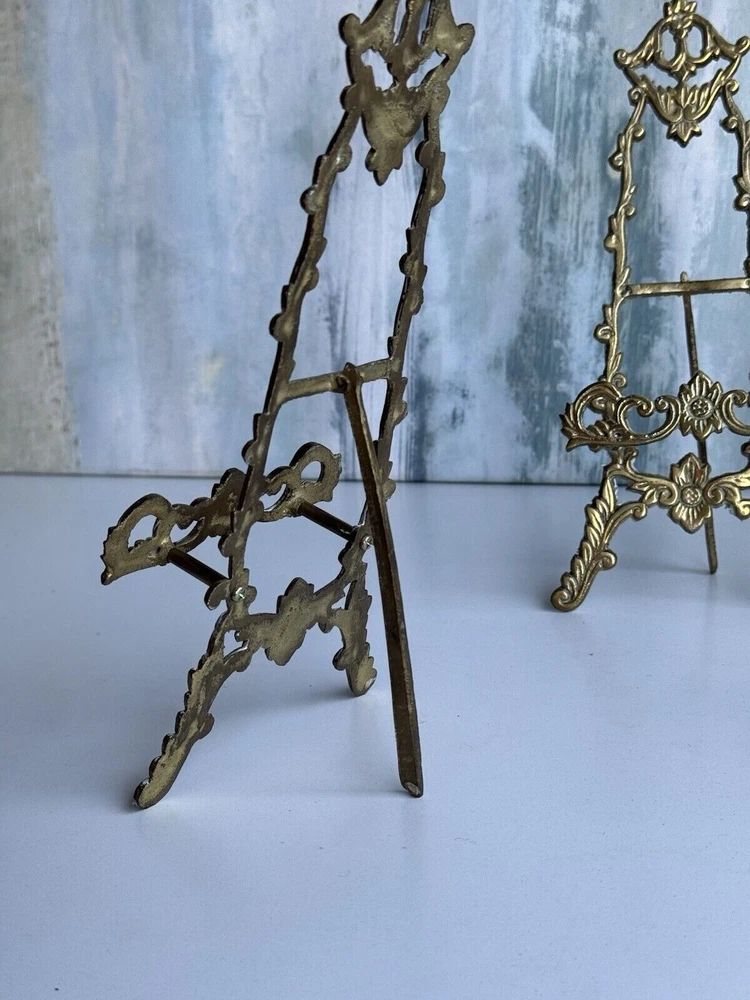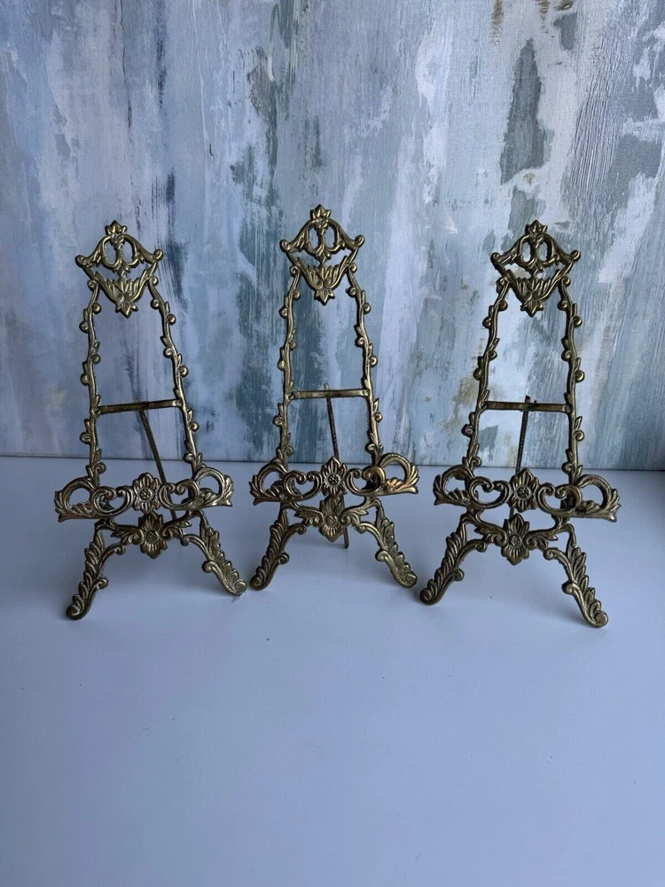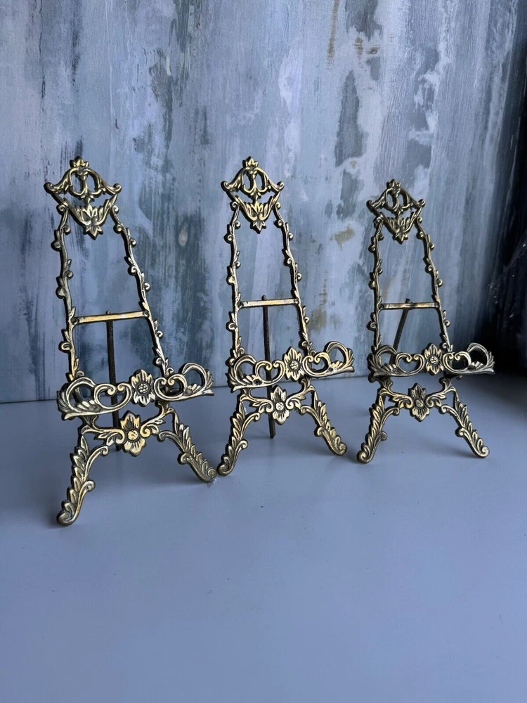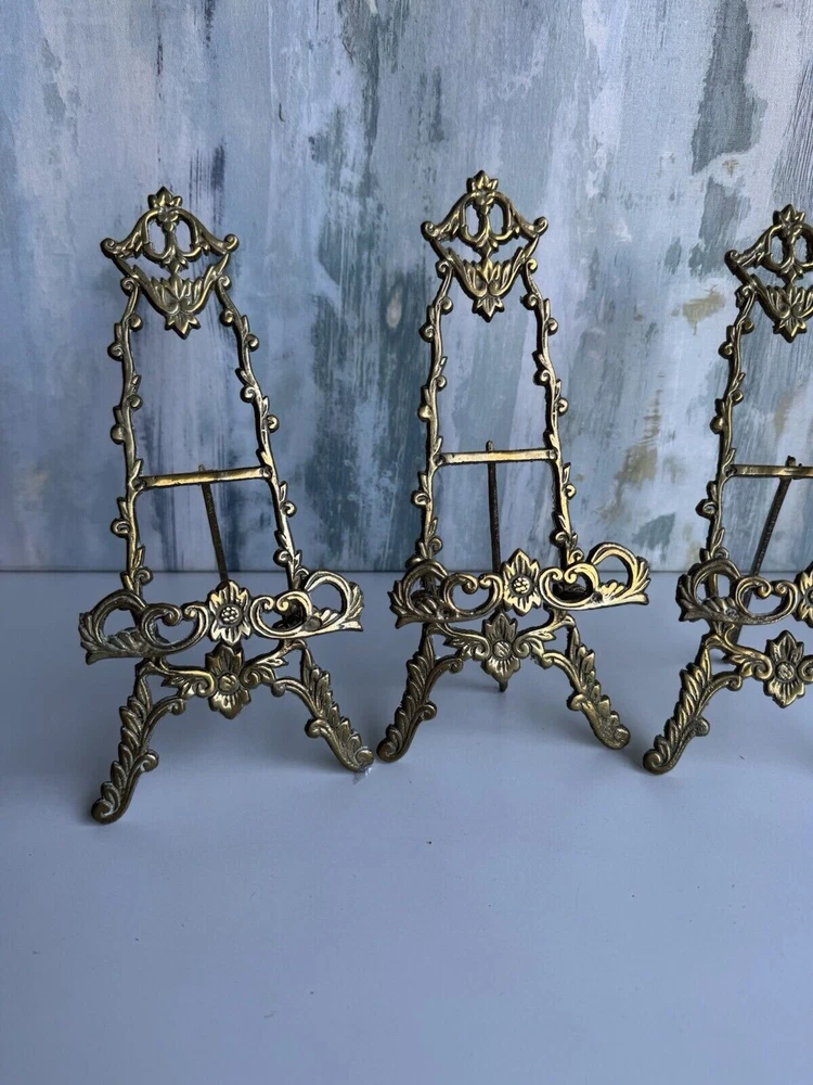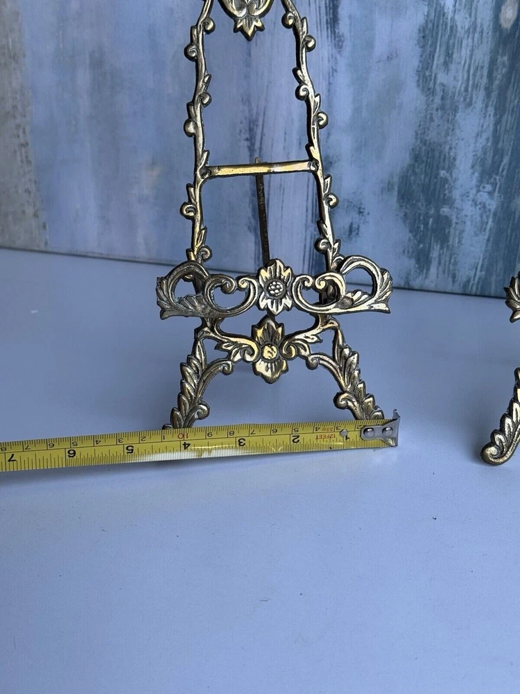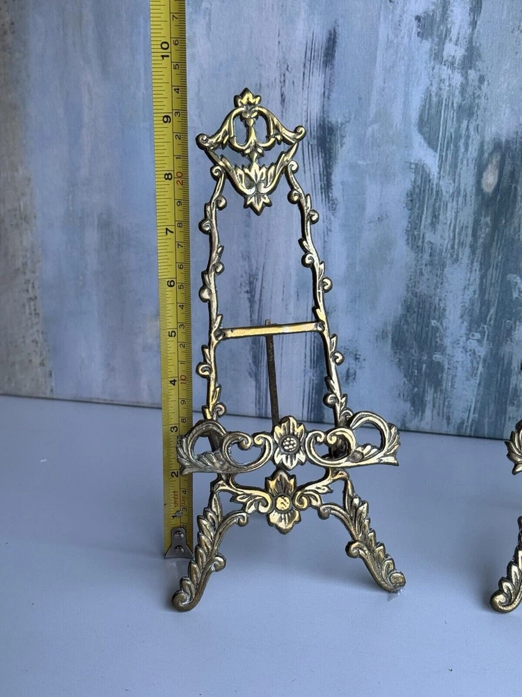 This is a vintage ornate brass easel for displaying art, pictures, plates, or tiles. It features a Victorian chic cottage style design in a gold color. The brass material adds a touch of elegance to any decor setting.aa5
