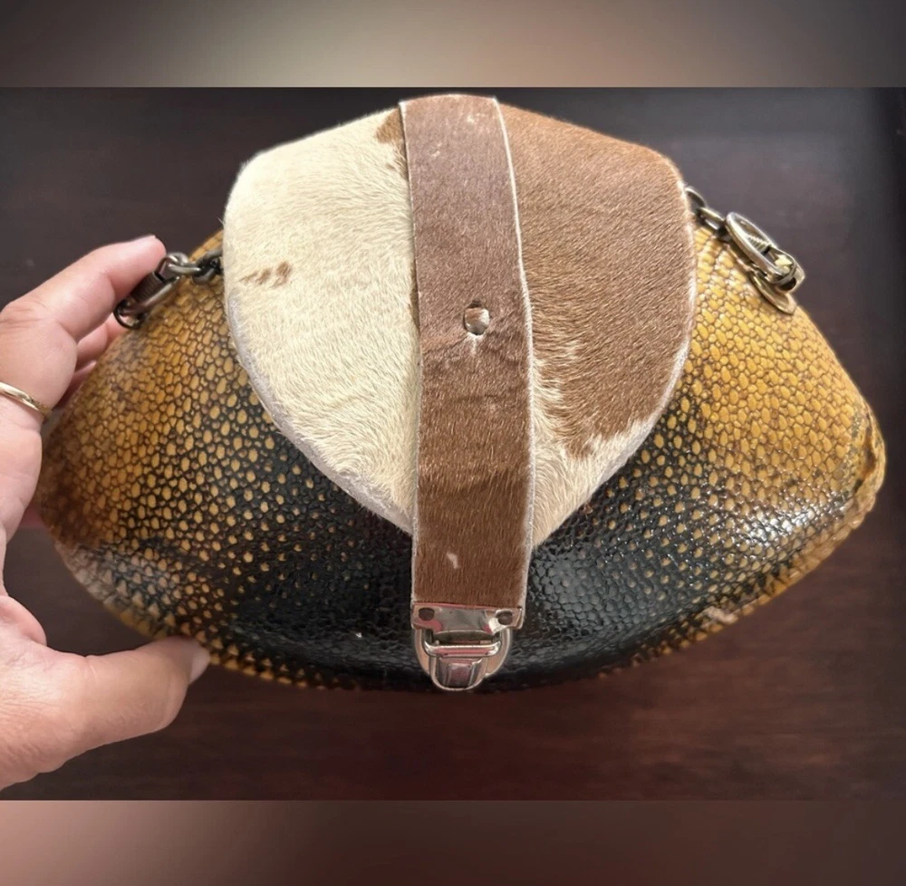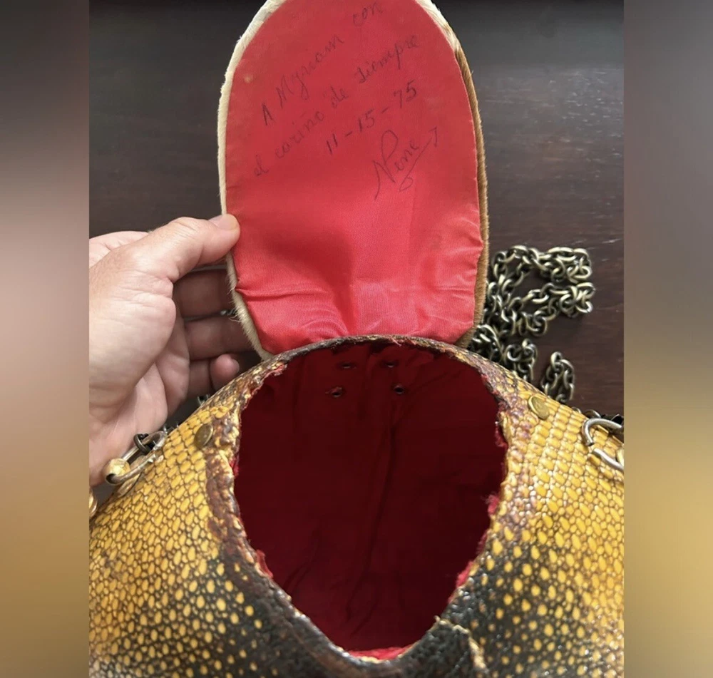 This vintage purse from the 1930s-1940s era is a unique statement piece, featuring a handmade design crafted from real armadillo leather. The brown color and purse style reflect the fashion trends of that period, making it a rare and original accessory. The use of leather adds a touch of luxury to the bag, showcasing the quality and craftsmanship of vintage accessories from that time.