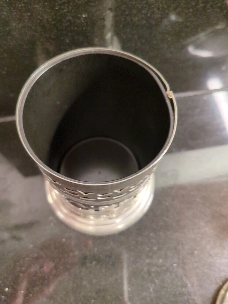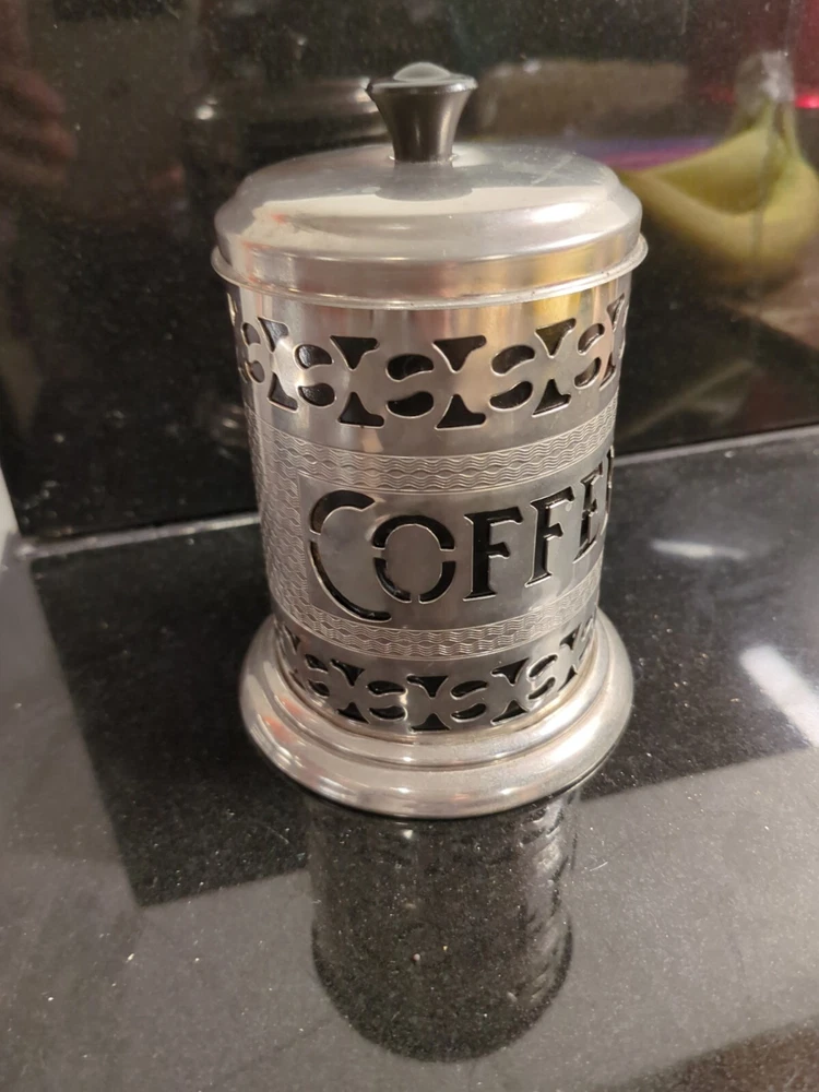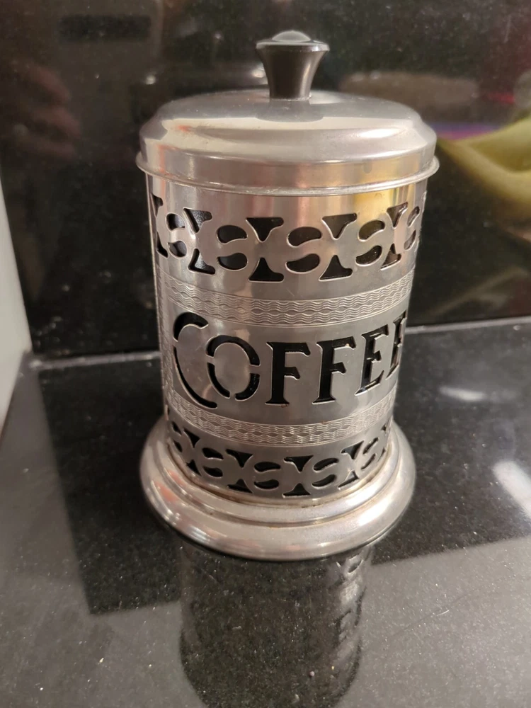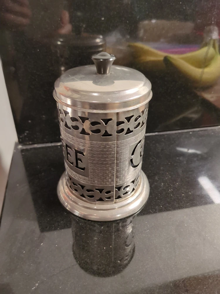 Elevate your kitchen decor with a touch of vintage charm. This silver plate coffee canister holder, dating back to the period between 1920 and 1949, is an authentic piece hailing from the United Kingdom. It stands at a quaint height of 5 1/4" including the top, and measures 3 3/4" in diameter at its widest point, making it a compact yet impactful addition to your countertop. The canister's hammered texture and the spell "Coffee" engraved on the black insert lend an air of rustic elegance to this original item. Complete with a functional twist-off lid and a small spoon for easy access, it's not just a decorative piece but a practical accessory for your coffee lovers' collection. Whether it's for daily use or as a display, this canister captures the essence of a bygone era.
