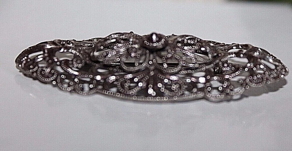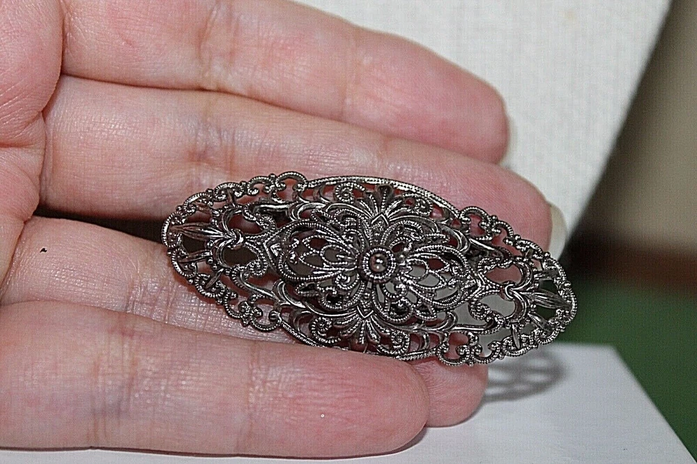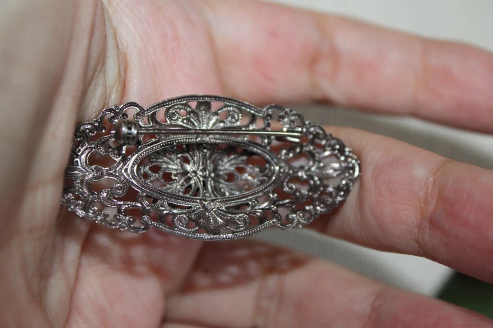 VINTAGE SILVER PLATED FILIGREE METAL FLORAL DESIGN BROOCH PIN GERMANY Vintage Description LONG INTRICATE BROOCH, FLORAL DESIGN, METAL FILIGREE. 2 1/4" BY ALMOST 1" WIDE Condition: vintage, mint condition. Shipping: International buyers are welcome, shipping cost will depend on your location. Insurance is included. Your package will ship next day upon payment confirmation. International - the shipping price indicated on the shipping calculator is the lowest rate available If there is a problem during/after shipping please email so I can get involved. I will do the same. Returns: I love my stuff and I love my customers, so if for whatever reason you are not happy with your purchase, please return them back so we will find another loving home for them:-) Returns in original condition and packaging are refundable within 14 days, buyer will pay the shipping back. Please email within as soon as possible should you want to return your merchandise. Damage: If your shipment is insured and is damaged by the shipper, it must be claimed by you with the shipper within 5 days - I will assist in this process if you wish. PLEASE EMAIL ABOUT ANY OF THE ABOVE INFORMATION. I WILL DO MY BEST TO RESOLVE ANY CONCERNS. A VERY SINCERE THANK YOU!