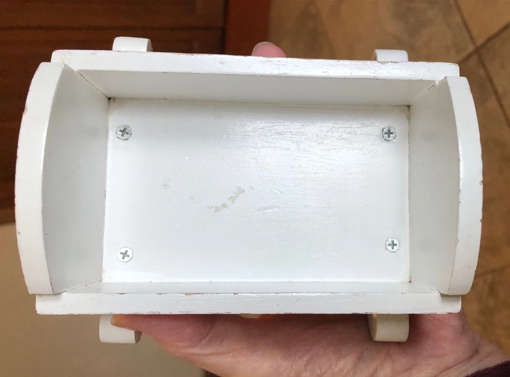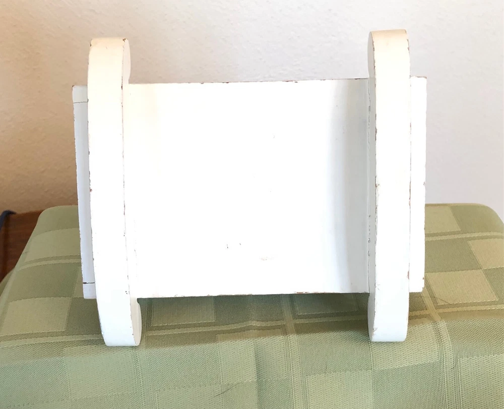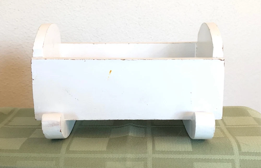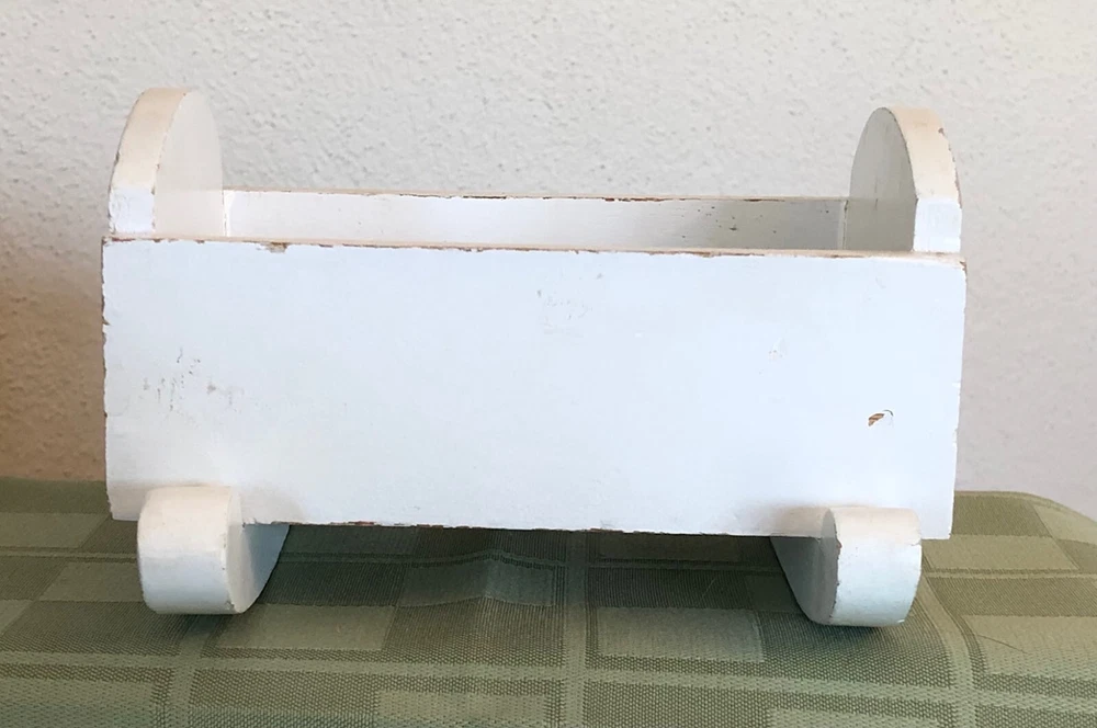 Vintage Small White Wood Lullaby Cradle for a small doll. It is not marked. It is approximately 5" long, 3 1/4" wide, 3 1/4" tall. The rockers are approximately 4 5/8" wide. It is in Used Condition. I do not ship outside of the USA. Thanks for looking. Payment is due within 3 days of auction close. Please contact me with any questions. I mail the day after I receive payment unless it is the weekend or a holiday. I ONLY MAIL IN THE UNITED STATES I ONLY ACCEPT PAYPAL - BE SURE YOUR ADDRESS IS CORRECT ****** ALL SALES ARE FINAL