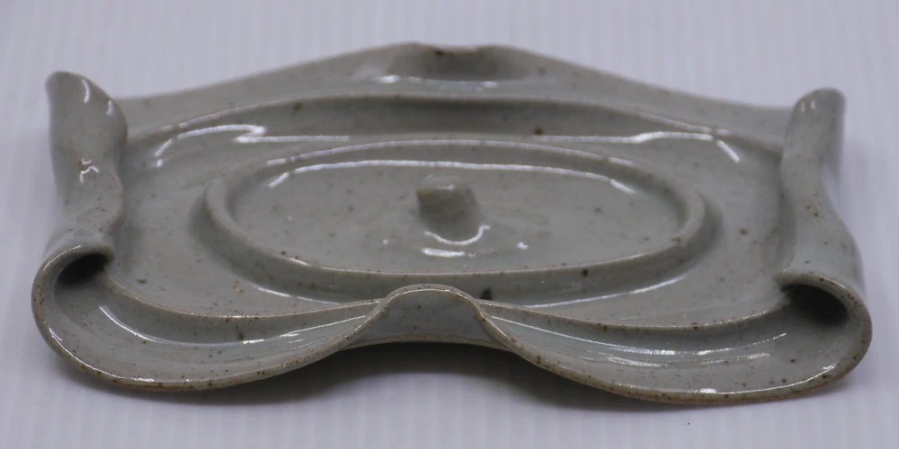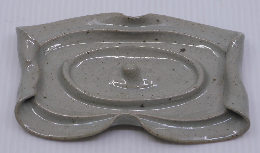 This sale is for an older studio art pottery butter dish with an unusual design. The abstract piece has a short of raised bullseye pattern in the clay with curved edges. The piece is gray in color. It measures 5 1/2 by 3 1/4 inches. The pottery is unsigned. The dish is in good condition with no chips or cracks. Please check out the other art pottery items we are offering on eBay. YES! We will combine shipping. To purchase more than one item, please use the shopping cart feature and click on "commit to buy and request total" to receive a combined invoice.