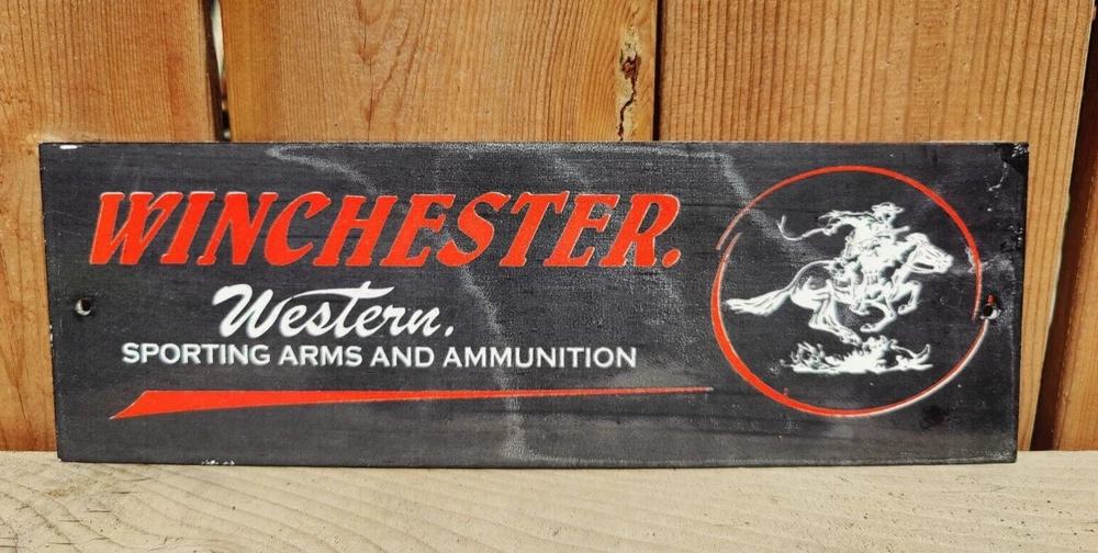 This vintage Winchester Western arms and ammunition sign is a true gem for any collector or enthusiast. Measuring 12 inches by 4 inches, this porcelain enamel sign features the iconic Winchester brand and is a perfect addition to any vintage hunting or sporting goods collection. Made in the United States, this sign is a rare find and a true piece of American history. The sign's vintage status adds to its charm and makes it a unique conversation starter. Picture Says it All, Pls see all pics carefully for your satisfaction before placing bids... Thank You..