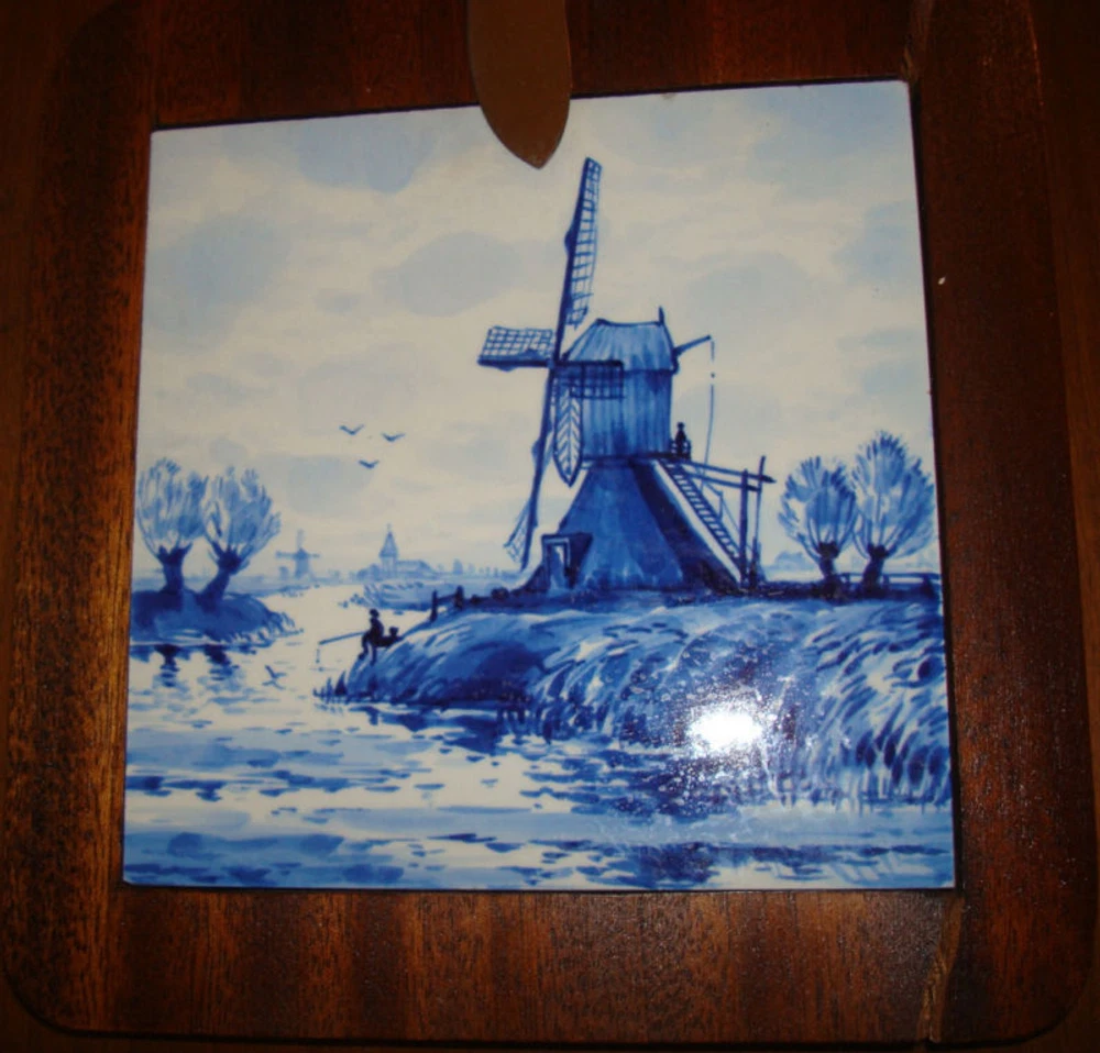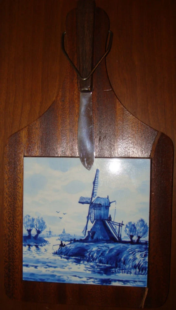 DELFT BLUE VINTAGE DELFT BLUE WOOD and TILE CHEESE CUTTING BOARD WITH KNIFE This cutting board has a mattel handle with a hole for hanging. Tile is blue and white Dutch windmill scenes! overall height of cutting board is approx. 13" and the width is 7 1/2". The tile insert which is the actual cutting area is in mint condition measuring 51/2" x 51/2" in the center. There is a spreader knife for cheese that is held on with a magnet. Condition : Good, except a crack on the side of the wood. Sold as is. Thank you. *PLEASE LOOK AT ALL PICTURES*