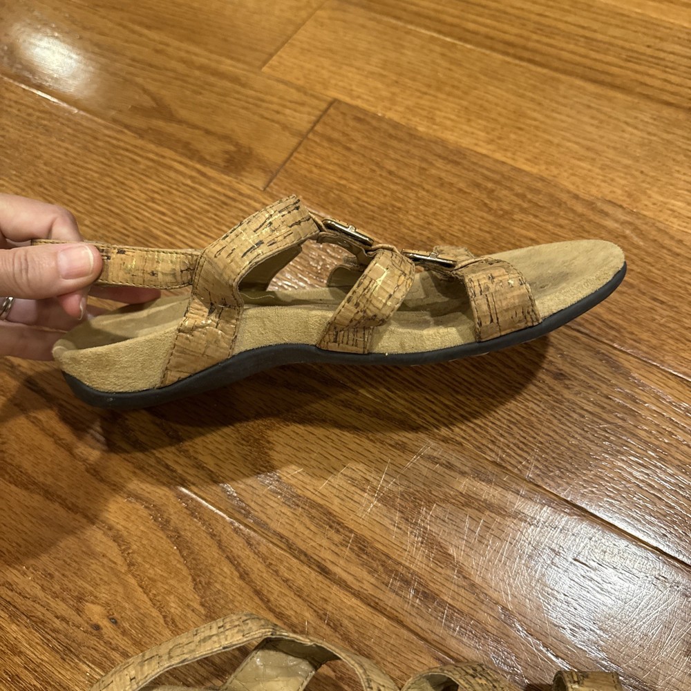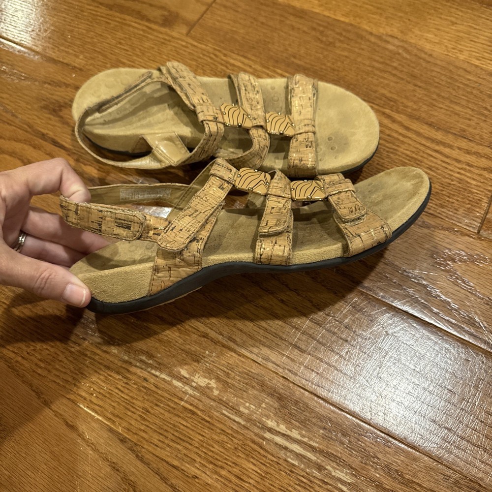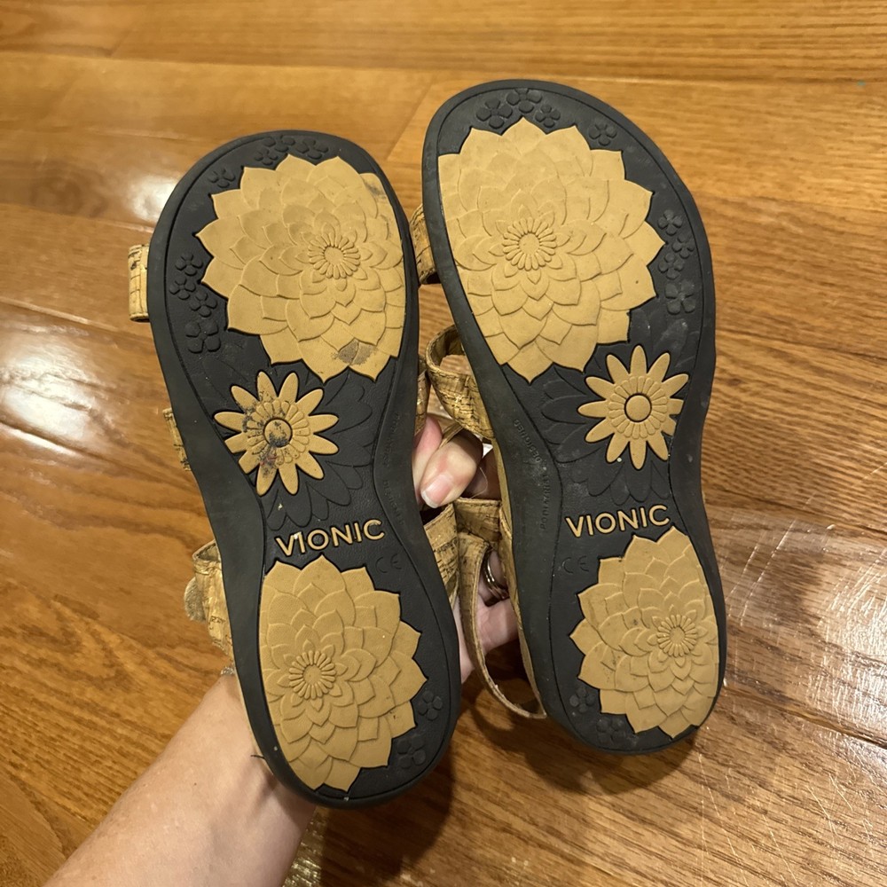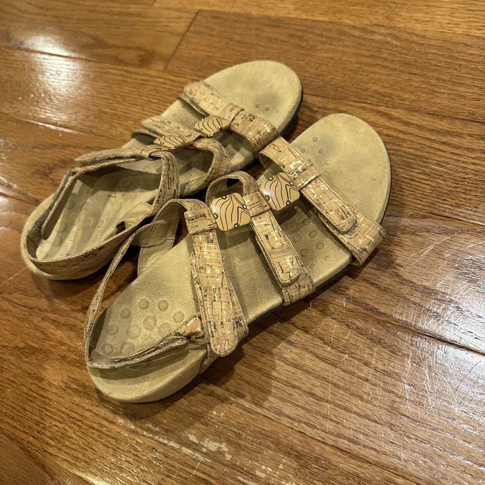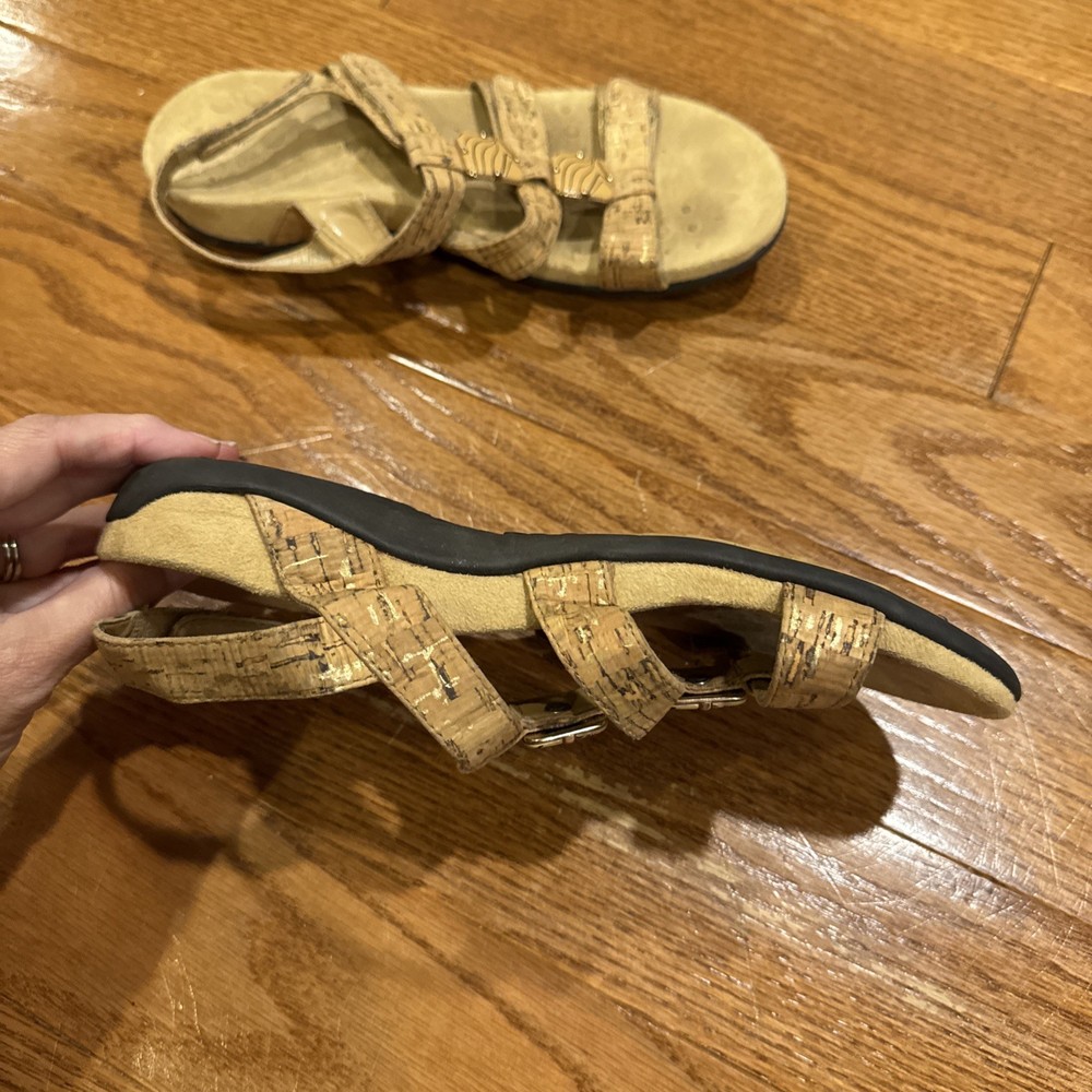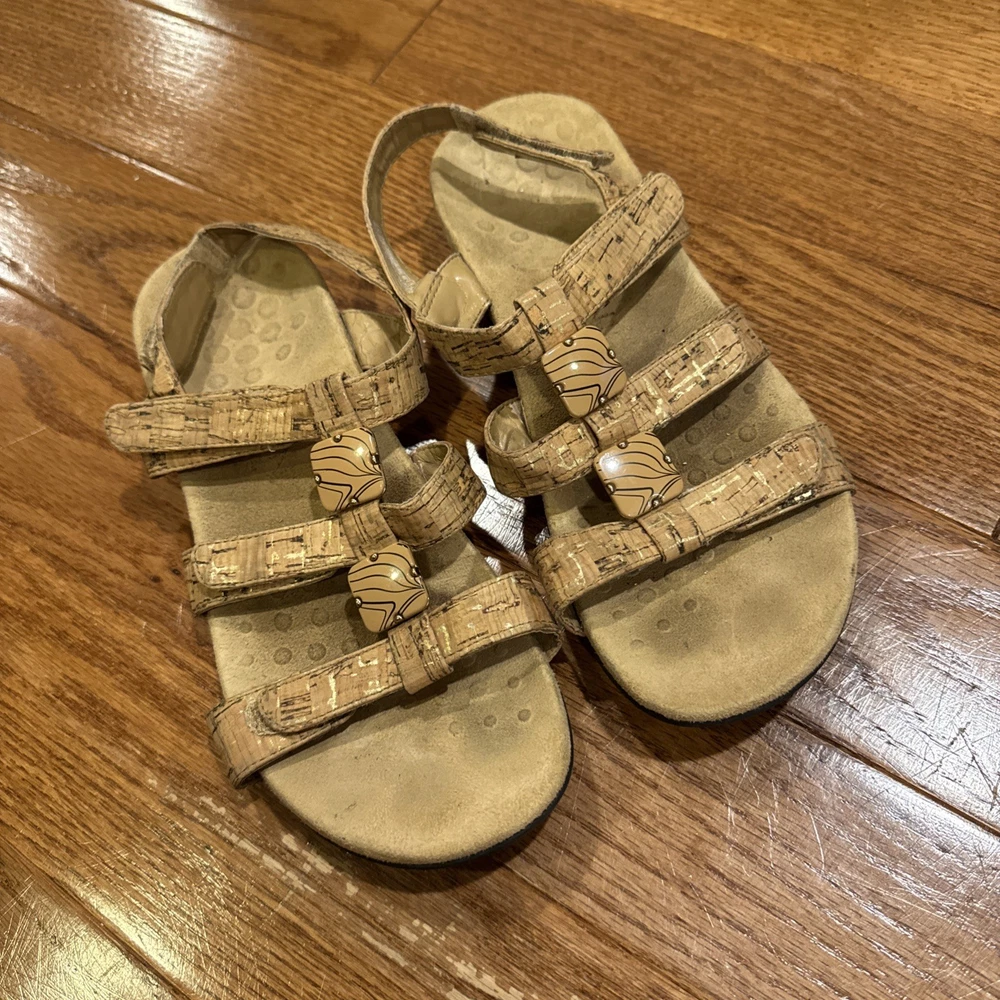 The VIONIC Amber Beaded Women’s Cork Tan Metallic Sandals in size 7 are stylish and comfortable footwear for women. These sandals feature a hook and loop closure, adjustable ankle strap, and a flat heel style, making them perfect for everyday wear. The tan color, metallic accents, and synthetic upper material give these sandals a fashionable and modern look. The rubber outsole provides durability and support, while the fabric lining and insole ensure a comfortable fit. Perfect for those looking for a versatile and practical sandal option.