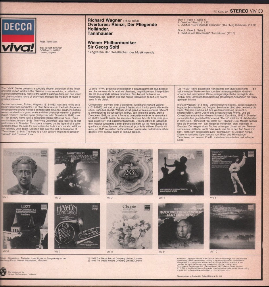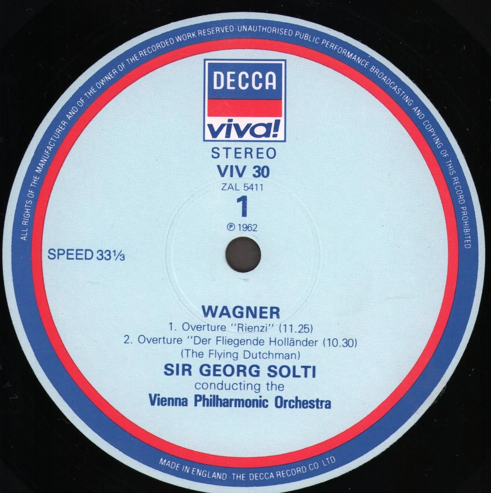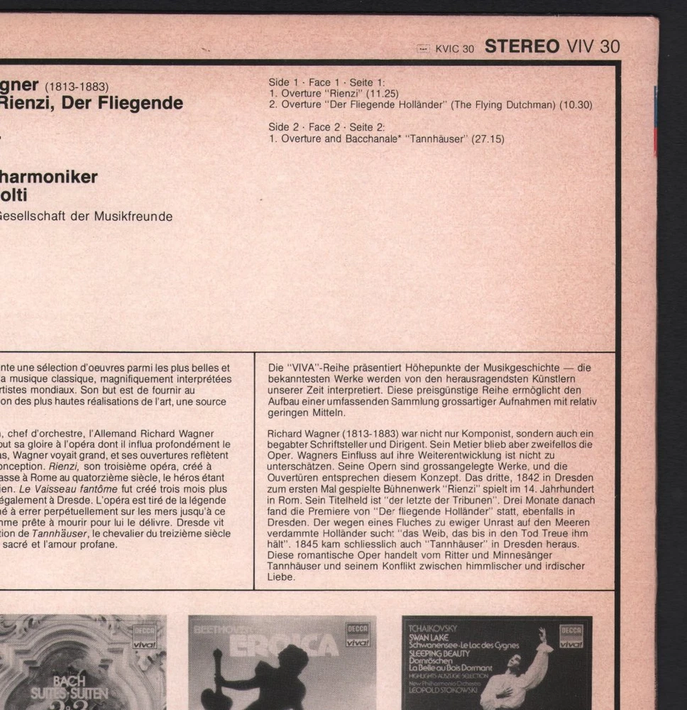 GRADING Our Grading System The table below is an overview of how our grading system works. The first grade is for the sleeve and second grade is for the media/disc, e.g. VG+/EX means that the item's sleeve is in Very Good Plus condition and the media/disc is in Excellent condition. If there is only one condition, e.g. /EX, it means that the item is not in a picture sleeve and that the media/disc is in excellent condition. Records that aren't in picture sleeves will either be in a company sleeve or a generic plain sleeve. If you have any questions, please get in touch. Condition Sleeve Media MINT (10/10) Mint, perfect Mint, perfect EX+ (9/10) Excellent plus, near mint Excellent plus, near perfect EX (8/10) Excellent, well looked after, clean, only slight signs of use Excellent, well looked after, clean, only slight signs of use EX- (7/10) Excellent minus, light wear and signs of use Excellent minus, light wear and signs of use VG+ (6/10) Very good plus, some moderate wear Very good plus, some scuffs, no deep marks VG (5/10) Very good, well used and worn Very good, well used and marked VG- (4/10) Very good minus, very worn Very good minus, very worn and marked GOOD (3/10) Good, some major wear Good, some major wear and scuffing FAIR (2/10) Fair, major wear Fair, major wear and scuffing POOR (1/10) Poor, severe wear Poor, severe wear and scuffing DELIVERY Combined Postage If you add all the items you wish to purchase from us to your shopping basket/cart, and then go to the checkout page from the shopping basket page, the shipping cost will be automatically combined. Packaging All of our items are parcelled using strong specially designed packaging, each vinyl in an order is placed in a clear plastic sleeve and plain paper white sleeve, and is separated from its cover (unless it is advertised as sealed), to prevent any damage during transit. If an item is sealed, and you would prefer the vinyl to be placed outside of its sleeve before dispatch, please let us know. Prices You can see all delivery options and prices for an item on the "Postage and payments" tab. Tracked delivery If you wish to have a tracking number with your order, please select the "Signed" or "Express" delivery option, "Standard" delivery does not include a tracking number. SHOP Click here to view our Ebay shop, with over 200,000 items in stock FAQ Does a used item include the original inner sleeve/insert/poster etc.? We will always include in the description if a used item includes any additional parts, e.g. "with inner" or "includes poster", if you know an item originally came with any additional parts, such as a printed inner sleeve, and it isn't mentioned in the description, then generally the used item won't include it, but please feel free to ask. New items will always be complete, unless otherwise specified. CATEGORIES Shop Home 10" Vinyl Records 12" Vinyl Records 7" Vinyl Records Cassettes (Tape) CDs (Compact Discs) LP Vinyl Records Music Memorabilia Other Artist Georg Solti / Wiener Philharmoniker Orchestra Title Wagner - Overtures: Rienzi / der Fliegende Holländer / Tannhäuser Format LP Vinyl Country UK Label Decca Catalogue Number VIV30 Description 3 track stereo - sleeve has light discoloration on back Condition (Sleeve/Disc) VG+/EX Track List A1. Overture - Rienzi (11:25) A2. Overture - The Flying Dutchman (10:30) B1. Overture And Bacchanale - Tannhauser (27:15) DELIVERY INFORMATION If you wish to have a tracking number with your order, please choose the Signed or Express delivery option, the Standard delivery option does not include a tracking number. Please note, the Express option for delivery outside of the UK includes a tracking number, but has the same delivery time as the Standard option. ABOUT US Vinyl Tap has been in the business of selling music for over 30 years, and in that period we have supplied many thousands of collectors and music fans around the globe with vinyl, CDs and music memorabilia. You can check out the over 200,000 items that we have in stock on our Ebay shop, here . Artist: Georg Solti / Wiener Philharmoniker Orchestra - Title: Wagner - Overtures: Rienzi / der Fliegende Holländer / Tannhäuser - Format: LP Vinyl - Country: UK - Label: Decca - Catalogue Number: VIV30 - Year: - Description: 3 track stereo - sleeve has light discoloration on back