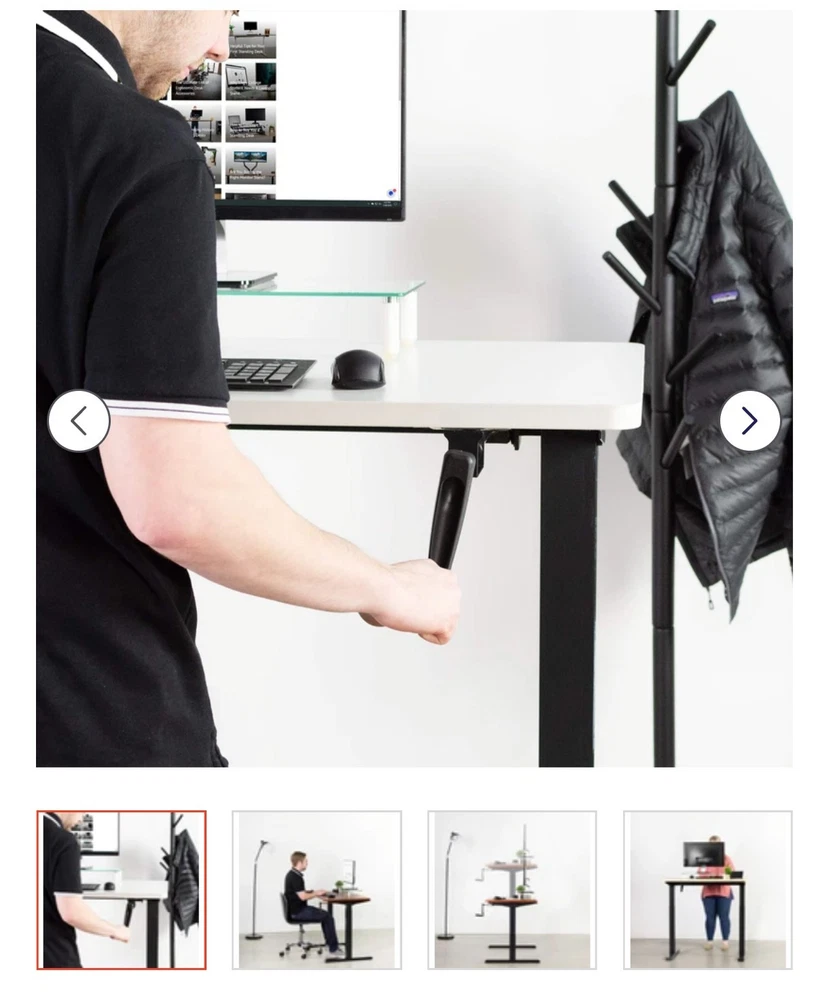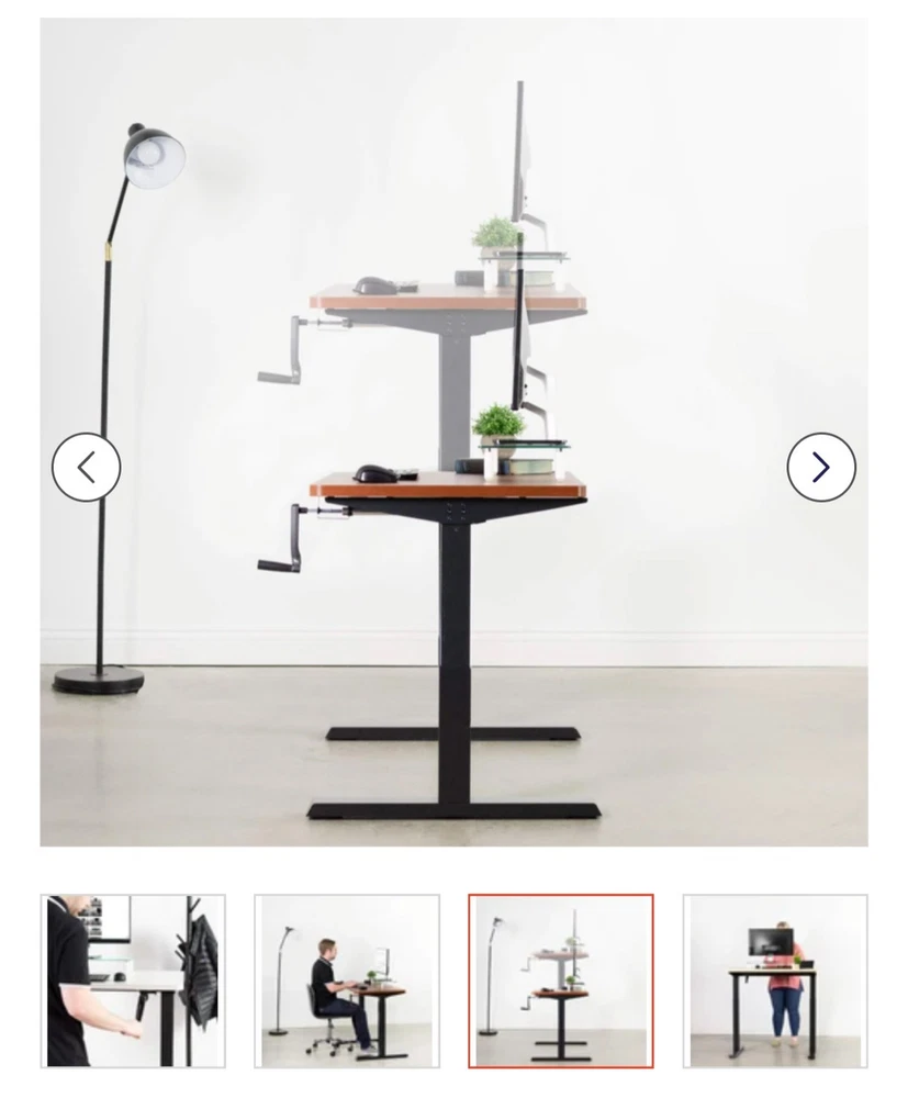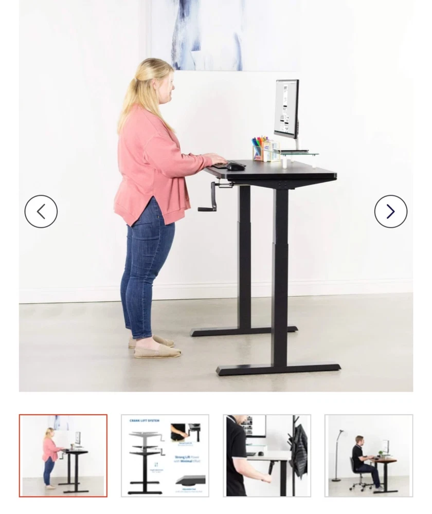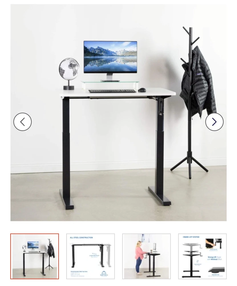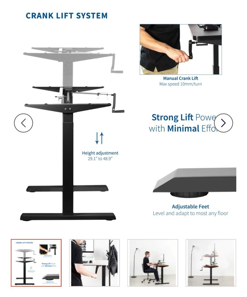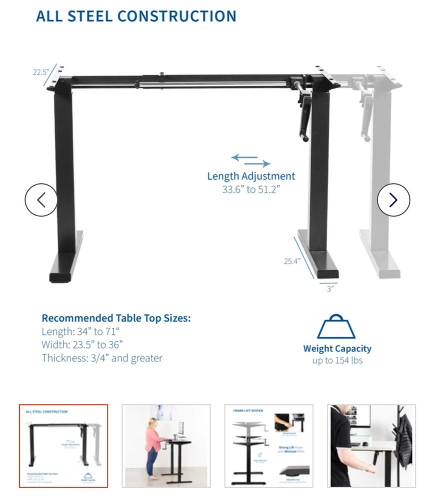 Top is sold separately on AMZ and eBay. Very light use. Everything has been wrapped marked labeled along with hardware and instructions for storage. EUC Frame Dimensions and Compatibility - Frame Length: 33.6” to 51.2”, Frame Height: 29.1” to 48.9”. Recommended table top measurements: Length of 34” to 71”, Width of 23.5” to 36”, and a Thickness of 3/4” and greater. Perfect space efficient active workstation legs for home and office settings. Foldable Hand Crank - Simple crank system requires minimal effort adjusting to your desired sitting and standing height. The handle is foldable to save space when not in use. Telescopic Height Adjustment - The strong legs use telescopic adjustment to make your transition from sitting to standing as smooth as possible. Sturdy 154 lbs Support - All steel construction and a thick leg support system hold weights up to 154 lbs. The leveling feet ensure excellent stability on a variety of floor surfaces.