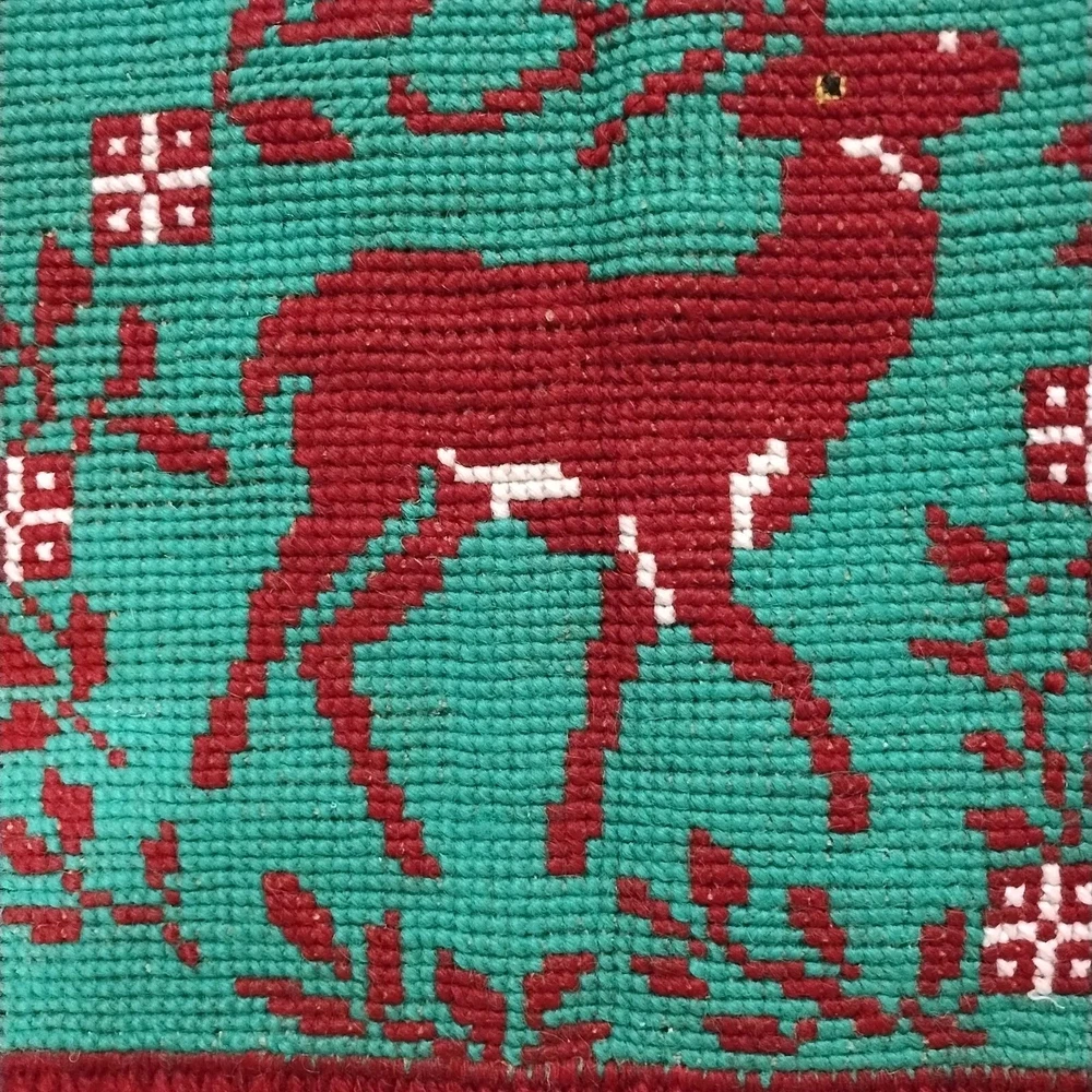 VIntage Finished Needlepoint of a reindeer with fringe, probably a wall hanging or doily ? Not sure. But nice for Christmas and measures 12.5 x 12.5 inches, the stitch is larger than a needlepoint stitch and looks like it goes up and down rather than on an angle, Thanks!