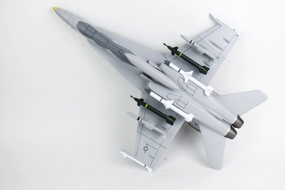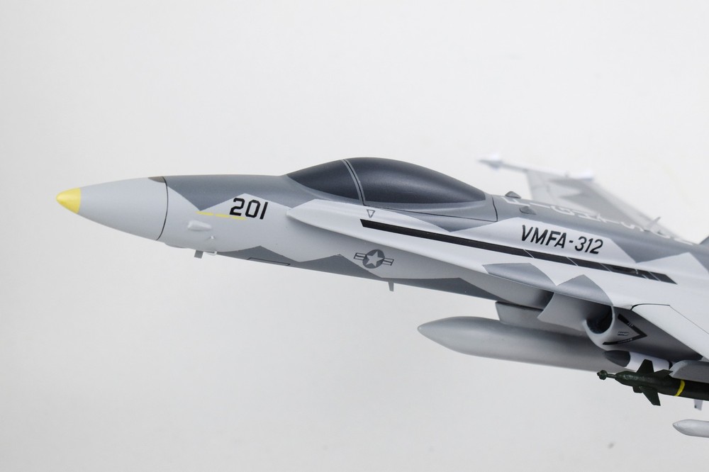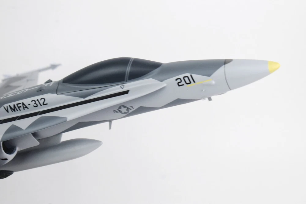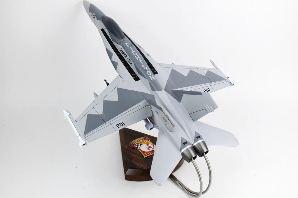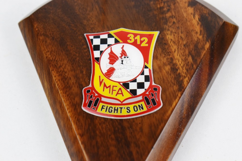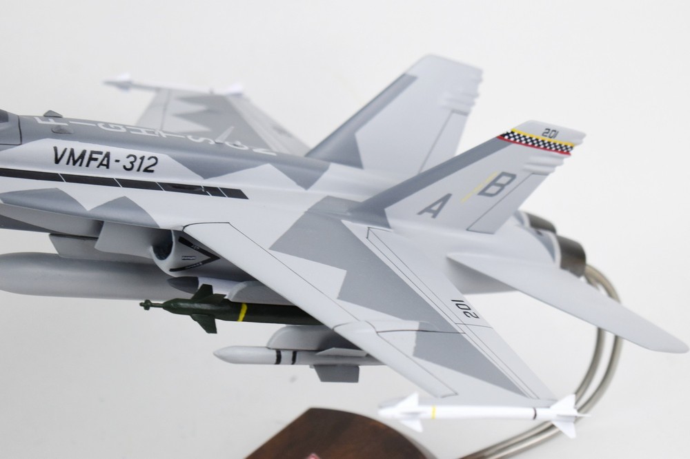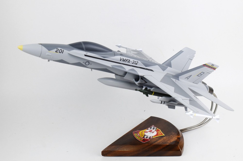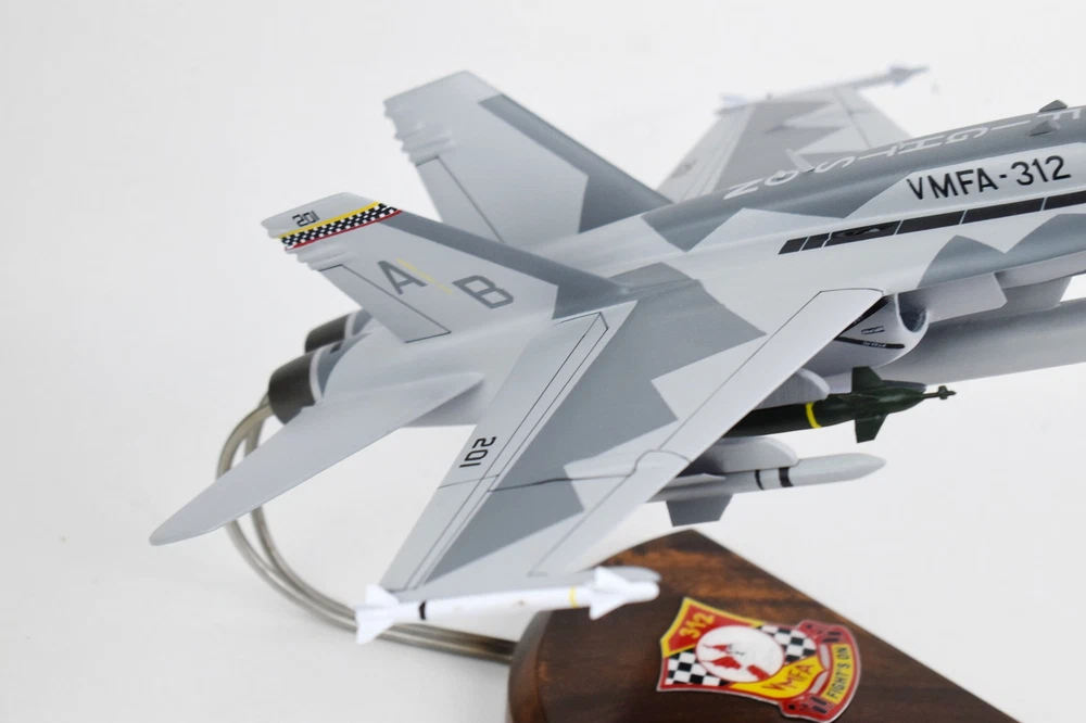 VMFA-312 Checkerboards "Fight's On" 2005 F/A-18C Model Fly with the VMFA-312 Checkerboards in this hand crafted F/A-18C Model. Each piece is carved from wood and hand painted to provide a piece you'll love. Length - 18 inches Made from Mahogany US Veteran Owned Business The product is not intended to be used by children 12 years and younger. Marine Fighter Attack Squadron 312 (VMFA-312) is a United States Marine Corps F/A-18C Hornet squadron. Also known as the "Checkerboards", the squadron is based at Marine Corps Air Station Beaufort, South Carolina and falls under the command of Marine Aircraft Group 31 (MAG-31) and the 2nd Marine Aircraft Wing (2nd MAW). The Radio Callsign is "Check." History World War II Marine Fighter Squadron 312 (VMF-312) was commissioned on June 1, 1943, at Page Field, Parris Island, South Carolina. Originally it was part of MAG-31, 1st MAW. As first aircraft the squadron received 10 SNJ-4 Texans and one F4U-1A Corsair. As their unit crest the squadron members choose a satan-like bulldog wearing a flying helmet and carrying -at that time- six .50 caliber machineguns (the armament of the Corsair) drawn by Technical Sergeant James R. Wroble.[3] In honor of their commanding officer, Major Richard M. Day, the men nicknamed their squadron "Day's Knights". Also at this time, the Checkerboards emblem began to appear on both the cowling and rudder of the aircraft. After being transferred in August 1943 to MAG-32, 3rd MAW, the squadron relocated to San Diego, California, and departed Parris Island on January 2, 1944, and headed for Miramar. They departed MCAS Miramar on February 28, 1944 and headed for Marine Corps Air Station Ewa on Hawai. VMF-312 trained at Ewa for 3 months and then headed out for Espiritu Santo, New Hebrides to become part of MAG-11, 2nd MAW. Assigned to Marine Aircraft Group 11 on June 25, 1944, the squadron was transported to Espiritu Santo, New Hebrides, where they received 24 new F4U-1D Corsairs. VMF-312's first combat action came on April 12, 1945 during the Battle of Okinawa as part of Marine Aircraft Group 33 (MAG-33), when four squadron aircraft intercepted 20 Japanese Zeros and achieved eight kills without a loss. VMF-312 continued to operate from Kadena Air Base on Okinawa until the cessation of hostilities. By war's end, the squadron had accounted for 59.5 air combat kills in the Pacific Theater. Between September 1945 and February 1946 VMF-312 participated in the occupation force stationed on Okinawa. 1946-1950 Returning to the United States in February 1946, the squadron began operations at Marine Corps Air Station El Toro still as part of MAG-33, where the squadron completed a transition to F7F-3 Tigercats, a single seat day fighter variant of the two seat Tigercat night fighter. Although the night fighters continued in service for several years, the day fighter version proved unsuitable, and VMF-312 transitioned back to Corsairs, this time F4U-4s, a higher performance model. The Korean War, 1950-1955 The squadron transferred to Marine Aircraft Group 12, MCAS El Toro in July 1950 and was alerted for deployment and service in the Korean War. The first VMF-312 aircraft flew in Korea on September 19, 1950. Flying out of Wonson Air Base, the Checkerboards flew missions in support of the 1st Marine Division during the Battle of Chosin Reservoir.[9] Redeployed in March 1951 aboard the light carrier USS Bataan (CVL-29), the Checkerboards were assigned escort and blockade missions.[10] Leaving the ship in June 1951, the squadron amassed 4,945 accident-free hours of carrier operations while logging 1,920 carrier landings. After a short period of ground-based close air support operations, the squadron returned to sea, first with Bairoko, then with Bataan, and later with Sicily. While aboard Bataan, the Checkerboards became the first piston engine squadron to shoot down a jet aircraft, when Captain Jesse Folmar shot down a MiG-15 jet fighter with 20 mm cannon fire.[12] On June 8, 1953, the Checkerboards were relieved by VMF-332, and returned to the United States in anticipation of transitioning to F9F Panthers at Marine Corps Air Station Miami, Florida. The 1960s through the 1990s The Panthers were replaced with FJ-2 Furies (the naval version of the F-86 Sabre) and later FJ-3 Furies, while they in their turn were being replaced in mid-1959 by F8U-1 Crusaders. Concurrent with the reassignment in February 1966 to MCAS Beaufort was the transition to yet another aircraft, the F-4B Phantom II, and redesignation as Marine Fighter Attack Squadron (VMFA-312). Crewed with a pilot and Radar Intercept Officer, and capable of speeds of up to mach 2, the Phantom served as a formidable combat weapon with the Checkerboards for over 20 years. During the Vietnam War, the Checkerboards performed the vital mission of training combat aircrews prior to their deployment to Southeast Asia. In 1973, the squadron received the newer F-4J aircraft, with its much improved radar and avionics, as well as improved aerodynamic design. In 1979, the Checkerboards became the first 2nd Marine Aircraft Wing fighter squadron to deploy to the Western Pacific under the Unit Deployment Program (UDP). Since joining the UDP cycle, VMFA-312 has made five six-month deployments to the Western Pacific as well as participated in numerous training deployments around the United States. Upon completion of the first six-month UDP rotation, the Checkerboards became the first squadron to receive the F-4S variant of the Phantom, which incorporated leading edge slats as well as advanced radar. In July 1987, VMFA-312 retired its F-4 aircraft and transitioned to the F/A-18A Hornet. In 1993, VMFA-312 participated in Operation Provide Promise and Operation Deny Flight over Yugoslavia. They also flew missions over Iraq in support of Operation Southern Watch while operating from the Red Sea. In March 1995, the squadron deployed once again with Carrier Air Wing 8 aboard Theodore Roosevelt for its second consecu