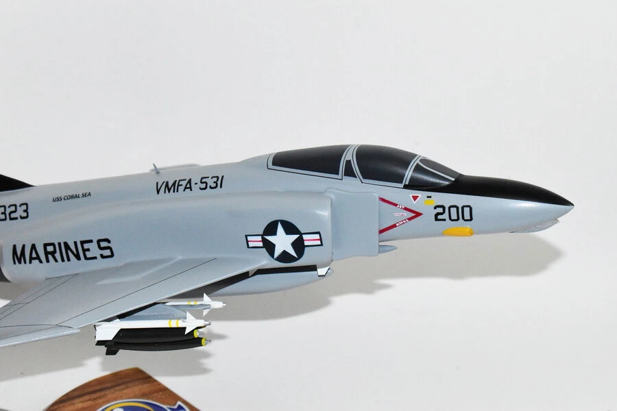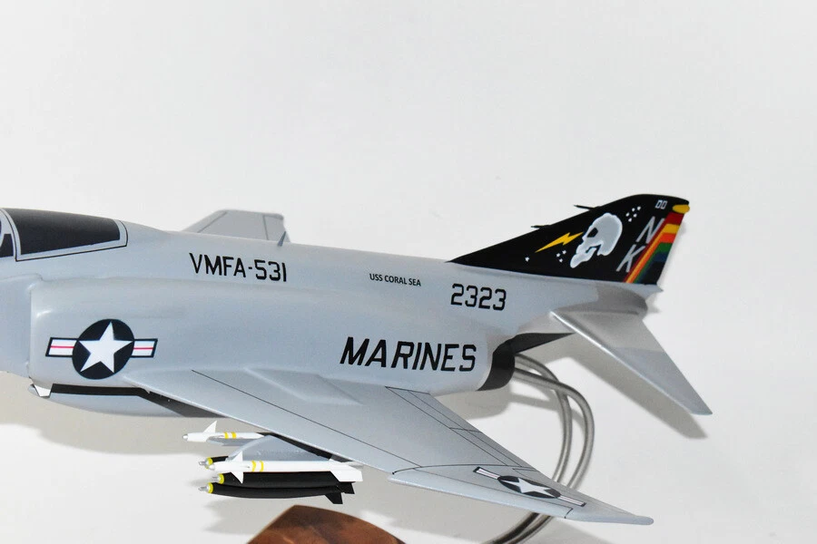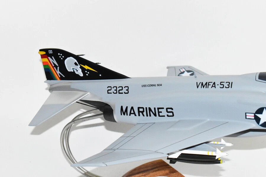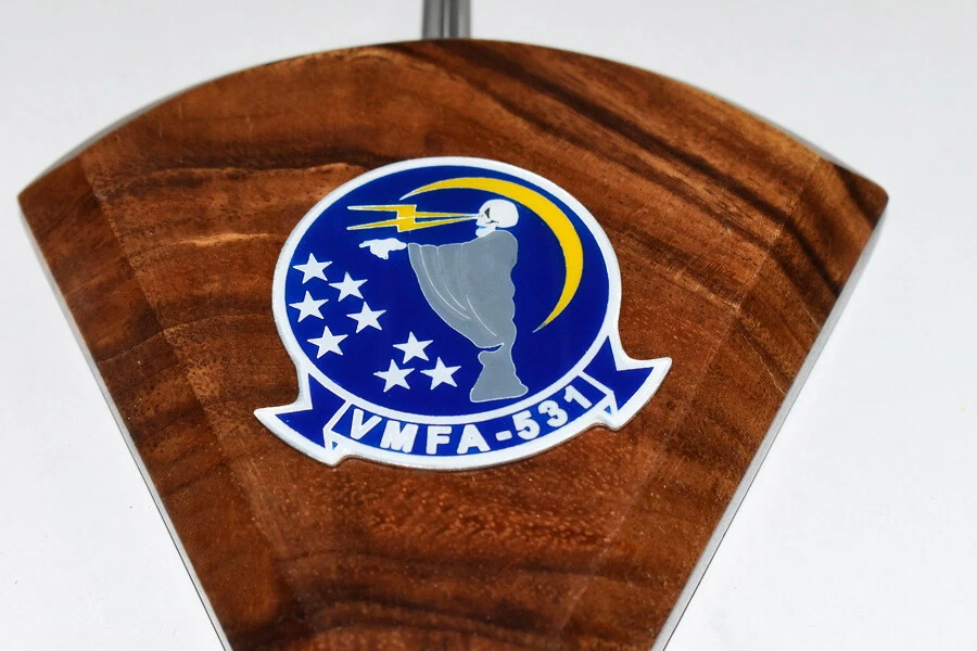 VMFA-531 GREY GHOSTS (1979) F-4N Model Fly with the VMFA-531 GREY GHOSTS (1979) F-4N Model in this hand crafted F-4 model. Each piece is carved from wood and hand painted to provide a piece you'll love. Length - 18 inches Made from Mahogany US Veteran Owned Business The product is not intended to be used by children 12 years and younger. Marine Fighter Attack Squadron 531 (VMFA-531) was a United States Marine Corps fighter squadron consisting of F/A-18 Hornets. Known as the "Grey Ghosts", the squadron participated in action during World War II and the Vietnam War. They were decommissioned on March 27, 1992. History World War II Marine Night Fighter Squadron 531 (VMF(N)-531) was activated on November 16, 1942 at Marine Corps Air Station Cherry Point, North Carolina.[1] On January 9, 1943 the squadron became part of the Fleet Marine Force and on April 1 was absorbed by Marine Aircraft Group 53 (MAG-53). The squadron took delivery of its first non-trainer aircraft, the Lockheed PV-1 Ventura on February 15. Due to the uniqueness of their night fight mission, VMF(N)-531 was placed under the direction of the Commandant of the Marine Corps until it was ready to deploy to combat. Responding to Japanese night attacks on Guadalcanal, MAG-53 was reassigned to the 3rd Marine Aircraft Wing on April 15, 1943 and was quickly ordered to deploy to the South Pacific as soon as possible. VMF(N)-531 was the first combat squadron to leave MCAS Cherry Point. After layovers in Hawaii and Espiritu Santo, the squadron finally arrived at Renard Field on Banika in the Russell Islands on September 11. Joining Marine Aircraft Group 21, 1st Marine Aircraft Wing, the Grey Ghosts flew their first combat patrol on September 16 making them the first naval aviation night-fighter squadron to operate in the South Pacific.[2] The squadron's first kill was made by Captain Duane Jenkins, who happened upon a Betty bomber on the evening of November 13, 1943. The first kill aided by GCI did not come until December 6.[3] During their tour in the Pacific, the squadron operated out of fields in the Russell Islands, Vella Lavella and Bougainville. They accounted for 12 enemy planes shot down by 5 different crews, all at night, with a loss of 6 of their own aircraft and 17 crew members, none of them a result of enemy fire. The squadron returned to MCAS Cherry Point on September 1, 1944 and was quickly deactivated only to be reactivated a short time later on October 13 at Marine Corps Auxiliary Airfield Kinston (MCAAF Kinston), North Carolina and reassigned to MAG-53, 9th Marine Aircraft Wing. A short time later the squadron moved to Marine Corps Air Station Eagle Mountain Lake near Fort Worth, Texas to operate as a training squadron for replacement pilots and ground control intercept operators being sent overseas. Following the conclusion of World War II, the squadron was relocated back to MCAS Cherry Point and in March 1947 reassigned to the 2nd Marine Aircraft Wing (2nd MAW). 1950s The Vietnam War On April 10, 1965, 15 F-4Bs from the squadron arrived at Da Nang Air Base, South Vietnam becoming the first land-based Marine Corps jets during the Vietnam War. They immediately began flying bombing missions under radar guidance and standard close air support missions in support of Marines on the ground.[4][5][6] The 1980s to 1992 On May 29, 1984, 531 received its first F/A-18 Hornet, becoming the 3rd fleet squadron to receive the new fighter. LtCol Keith J. Stalder was the commanding officer from December 1990 to the time the squadron was decommissioned March 21, 1992.