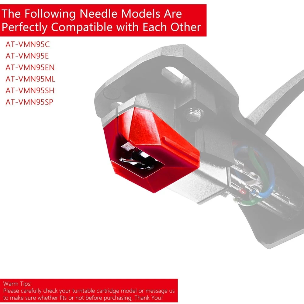 -VMN95E Elliptical Turntable Stylus Replacement, Diamond Record Player8325 Ideal Replacement for Turntables: The AT-VMN95E elliptical stylus is designed specifically for the AT-LP120X turntables. Featuring a striking red housing, this stylus not only enhances the functionality but also the aesthetics of your turntable, making it a perfect blend of style and performance. Enhanced Sound Quality: Experience superior audio fidelity with the AT-VMN95E replacement stylus. Engineered to deliver crystal-clear sound and precise sound reproduction, this stylus is essential for any vinyl record enthusiast looking to get the most out of their vinyl collection. Universal Compatibility with VM95 Series: Compatible with all six models of the VM95 Series cartridges, the AT-VMN95E uses the same electromagnetic engine, allowing for a seamless upgrade or replacement. This versatility ensures you can maintain optimal performance across multiple turntable setups. Optimal Tracking and Reduced Distortion: The AT-VMN95E stylus is designed to operate within a tracking pressure range of 2.5g to 3.5g. This optimal tracking ability enhances frequency and phase responses while significantly reducing distortion, ensuring a pure and enjoyable listening experience. Colour: Red Material: plastic Note: There may be slight color difference or difference in the actual product, which not affect the use Package Contents: 1 x Turntable Stylus