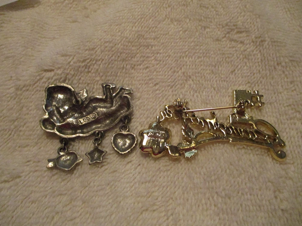 BOTH PINS SIGNED. LCD(Lindsey Claire Designs) Pewter Angel Cherub on Cloud with dangling charms and back post is missing for this lapel pin.