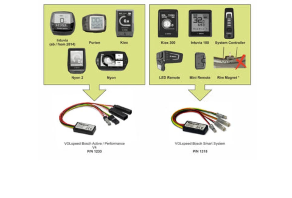 eBike Tuning Kits eBike GPS trackers Surron Parts MTB Hopper eBike Conversion Kit Shotgun Child Bike Seat Dirtlej eBike Apparel Other #1 SELLER PREMIUM CUSTOMER SUPPORT SHIPPING WORLDWIDE 2 YEAR WARRANTY EASY TO INSTALL UNDETECTABLE VOLspeed V4 Tuning Chip Kit for Bosch eBikes | 2014-2023 Our best-selling tuning kit for ebikes with Bosch motors. Works with all Gen2 | Gen3 | Gen4 2014-2023 motors. Does not work with Bosch Smart System Compatible with all ebike Bosch Motors Unlock the full potential of your ebike! You will ride faster and experience the thrills of owning a derestricted ebike - you will love the difference! Install it effortlessly- quick plug-and-play connection - no setup required . Feel safe for your e-bike and warranty- it's safe for ebike and undetectable to keep your warranty safe! Quick plug-and-play installation. No setup! Increase the speed limiter from original 16 mph (25km/h) to 30mph (45km/h) See accurate speed on your ebike display! Enable/disable when needed! Just press ' - ' button and hold it for 3 seconds Get after-sales support from us and a 2 year warranty from Volspeed! The bike feels completely different once derestricted - it's just like a whole different bike! The rides are so much more fun now! Tuning kits are safe to your bike and every ebiker should have one installed! You will love riding your ebike with it - guaranteed! Matt - Owner of Two Wheels Empire Product details What does this Tuning Kit do? A smart Tuning Kit Volspeed V4 with an option to set a speed limit of an e-bike of your own choice. After the chip is installed, your e-bike?s display will show real data, such as maximum and average speeds, daily mileage and cruising range. In contrast to the almost complete elimination of the speed limit with other tuning modules, this module still allows a very sporty riding style with moderate battery consumption by slightly increasing the limit, e.g. to 20 mph (32km/h). For a more natural riding experience, the dynamic mode spreads the downshift over a wider speed range, the so-called "wall effect" is significantly reduced. How does Volspeed V4 Work? The tuning kit can be activated directly on your bike?s display. After pressing the ' - ' button and holding it for 3 seconds. After Tuning kit activation speed limit is displayed for 5 seconds. If you would like to change maximumm speed, just press 'Plus' or 'Minus' keys. Possible values: 16... 28mph (25... 45 km/h). Default value: 20mph (32 km/h). The set value is saved. To deactivate the tuning kit, press the ' - ' button and hold it for 3 seconds again. The tuning is always switched off after switching on the bike. It is possible to set a "softer curtailment behavior" (dynamic mode). This significantly softens the otherwise very abrupt deceleration at the speed limit. Correct display of the speed, the distance covered and the average speed at all times. Is this Volspeed the right tuning kit for my bike? This tuning kit is compatible with all eBikes; eMTB; eMountainBikes that have a Bosch Motor manufactured from 2014-2023. Including all Active Line, Active Line Plus, Cargo Line, Performance Line, Performance Line Speed, Performance Line CX models including motors of the 4th generation. Compatible with displays: - KIOX - INTUVIA - NYON - PURION - COBI Compatible with motors (incl. Gen4): - Active Line Plus - Performance Line - Performance Line CX Line - Performance Line Speed - Cargo Line Compatibility table: How to install this tuning kit? When connecting Tuning Kit to an e-bike you will find connectors colored to make installation very simple. We have prepared detailed instructions and videos to make installation easy for you. Disassembly of our tuning kit is just as easy. If you have any troubles with installation or disassembly, do not hesitate to contact us. If you are planning to install Volspeed on a brand-new bike, make sure you ride it for at least 0.6 miles (1 km) before the tuning kit is activated. Installation Guide Installation guide PDF: https://cdn.shopify.com/s/files/1/0051/1515/0434/files/VOLspeed_Bosch_V4_Rev2.pdf?v=1671024603 Important legal note Please note that the operation of this type of modified electric bikes on public roads may be against the law in some countries. The manufacturer takes no responsibility for damages resulting from the use VOLspeed products. Electric bikes equipped with VOLspeed products are not allowed to be used on public roads, cycling paths and public places. Electric bikes equipped with VOLspeed products can be used exclusively on private property and entirely at one?s own risk. The use of VOLspeed may void the warranty of your ebike. We strongly recommend using other safety features and protective gear to prevent injuries in higher speeds. VOLspeed Products are thoroughly tested and we stand by their quality. VOLspeed provide 2 years warranty to all their Products!
