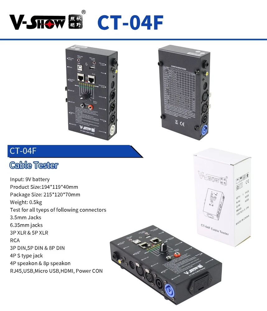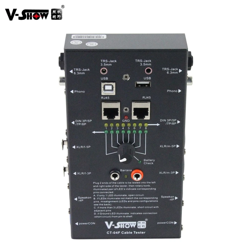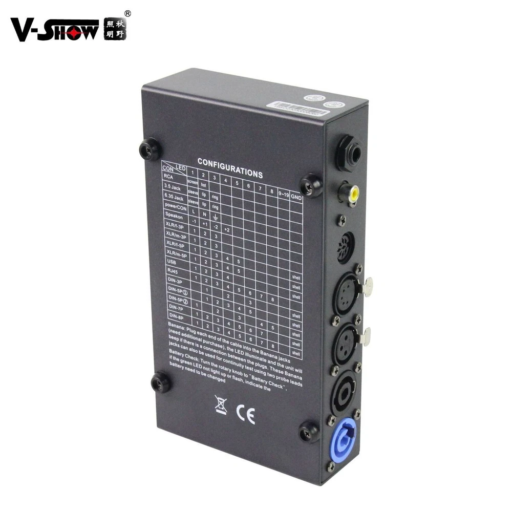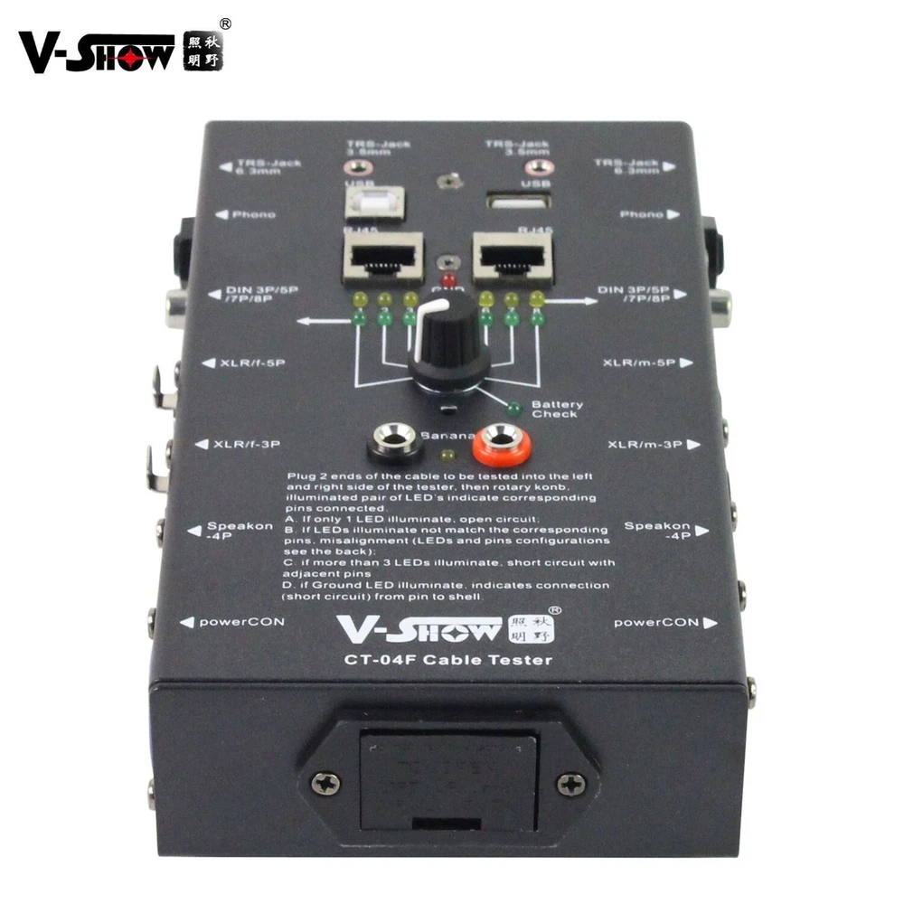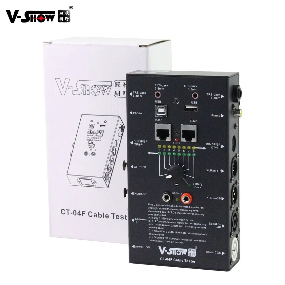 Free Shipping!!! Shipped from US warehouse and fast delivery! Package List: 1 x Cable tester About this item: ♬ QUICK TESTING: Offers easy way to make sure your audio cables are working properly. Supports nearly all cable types used in the sound recording industry. Definitely, an all-in-one solution to help identify cable continuity issues in your audio setup ♬LED INDICATOR: The LED light panel features 8 indicators that let you know if your cable has full continuity and which pins are functioning or broken. That way you can repair any broken pins or purchase a new cable while you still have time ♬ Rugged and Durable: cable tester is built in a strong, compact metal casing, it is a great long-term item to help keep your audio setup running smoothly. ♬ 8-Way Switch: Operation requires one 9-volt battery (not included), SUPPORTS: Tests cables with all combinations of the following connections - USB, ¼” TRS jacks, 3 & 5 pin XLR male and XLR female, 4 &8 pin-pole speakon, 3 & 5 & 8 pin Din, 4 pin S type jack, RJ45, USB(A-A) ♬ Test With the Best: The cable checker accepts every type of cable you might use in a recording or live performance situation, helpful and functional 【What We Provide】 It is available in US warehouse, we can ship the products to your hands soon. 【 After-Sales Service 】 V-Show promise to provide 100% after-sales service, one year warranty period to ensure you worry-free use of our products. Our customer service team would respond you within 24hours if you have any question. We will try best to make you satisfied. Youtube video link: https://www.youtube.com/watch?v=hsZ_-UuYdsc Specifications: Input Voltage 110-240V,50/60Hz 3&5-Pin XLR(M/F) 3&5&8-Pin Din 4-Pin S type jack Yes USB(A-A) Yes Pin Diagrams on facing Yes 9V Battery Compartme Yes Dimensions 252*118*44mm Net Weight 1kg warranty 1 year Application: 3.5mm Jacks, 6.35mm Jacks, 3P XLR & 5P XLR RCA 3P DIN, 5P DIN & 8P DIN 4PS type jack 4P speakon & 8p speakon RJ45,USB,Micro USB,HDMI, Power CON