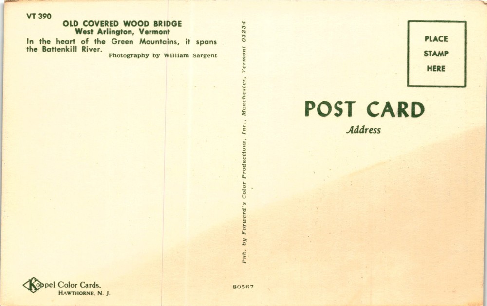 MAKE AN OFFER. THE MORE YOU BUY THE BETTER DEAL I WILL ACCEPT The postcard features a photograph of the VT 390 Old Covered Wood Bridge in West Arlington, Vermont. This historic bridge is located in the Green Mountains and crosses the Battenkill River. The image was captured by photographer William Sargent and published by Forward's Color Productions, Inc. in Manchester, Vermont.