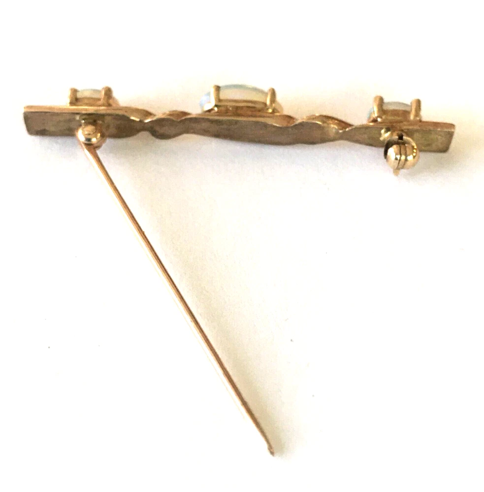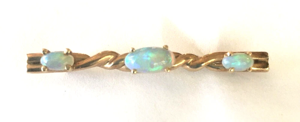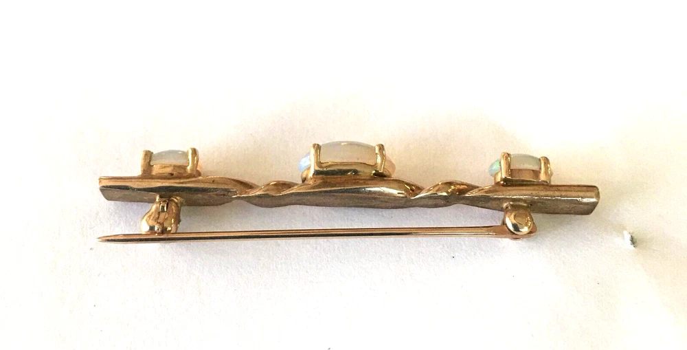 GORGEOUS VINTAGE CUSTOM-MADE 14K SOLID YELLOW GOLD OPAL BAR PIN....THE OPALS ARE OVAL FIRE OPALS...THE CENTER STONE IS LARGER THAN THE TWO END STONES AND THEY JUST RADIATE WITH A RAINBOW OF COLOR...1 3/4" LONG...TWISTED HEAVY GOLD BAR...UN MARKED BUT TESTED BY OUR JEWELER...IT WILL COME IN A GIFT BOX. THIS IS AN AMAZING PIECE...IT COULD EVEN BE TURNED INTO A PENDANT. FREE SHIPPING CONTINENTAL US