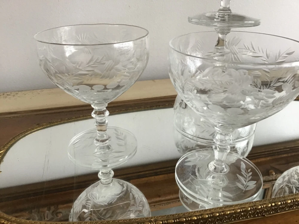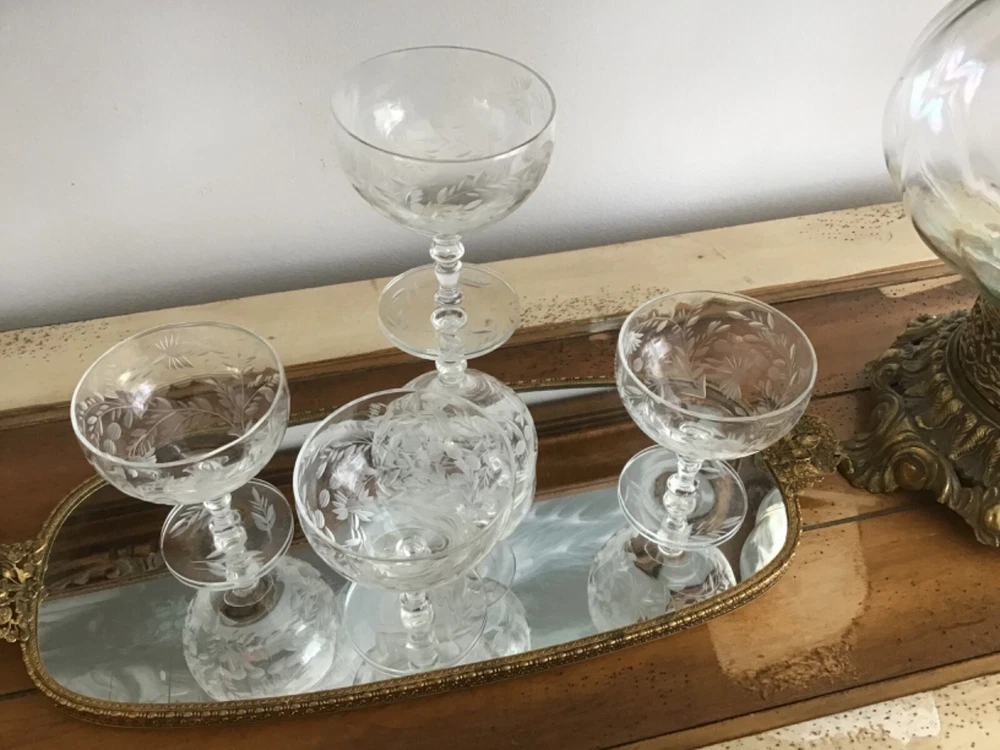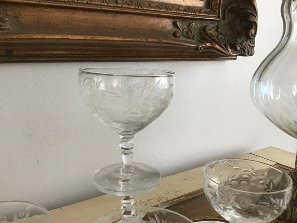 This vintage set of 1950's etched crystal stemmed glasses is perfect for all occasions. The cocktail glasses feature an elegant American Empire style with a clear crystal material and etched design. Manufactured in the 1950s, these glasses are part of the Wildflower product line and showcase a timeless sophistication. The unmarked brand adds to the charm of these licensed reproduction glasses, making them a beautiful addition to any drinkware collection. 4 1/8 x 3 3/8”
