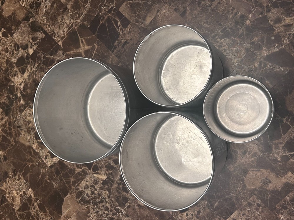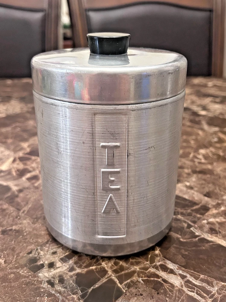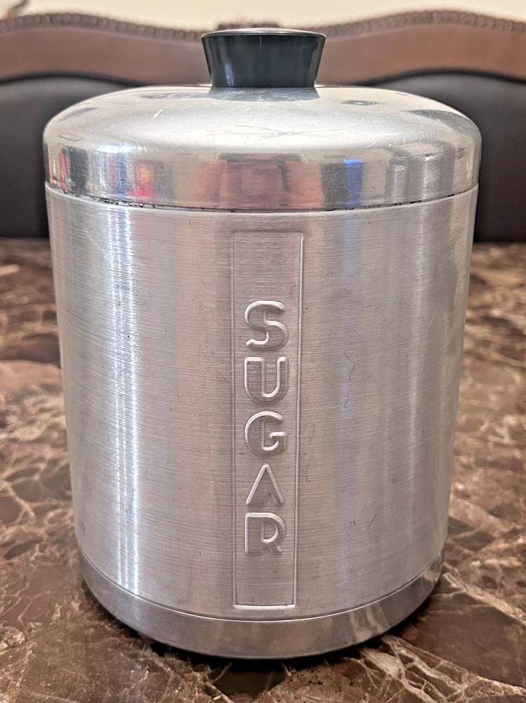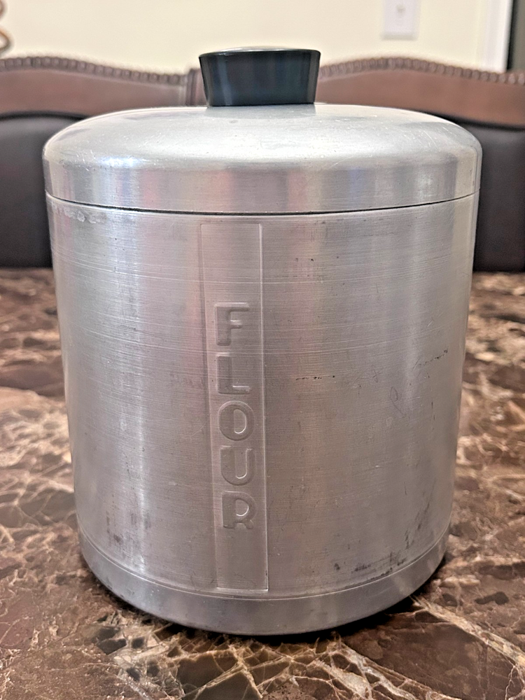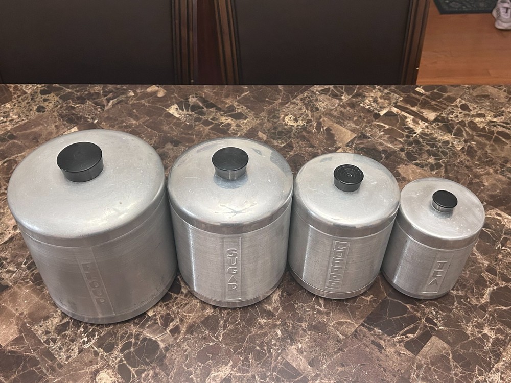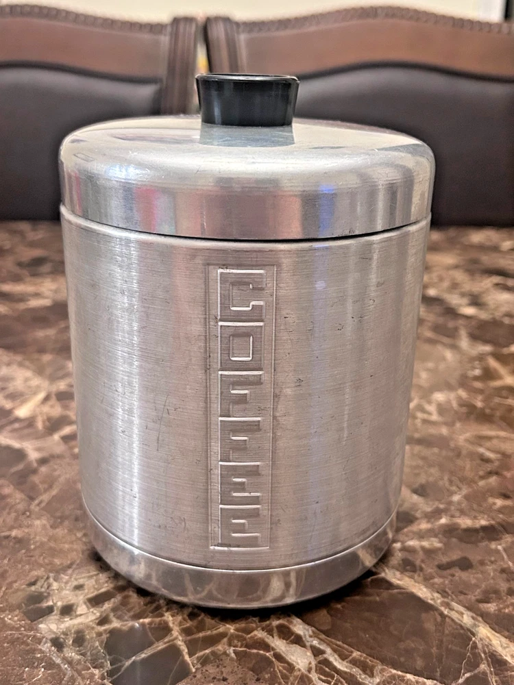 Classic 1950s–60s brushed aluminum kitchen canisters with embossed vertical labels. A beautiful example of atomic-era minimalist design. Includes: • Flour • Sugar • Coffee • Tea Features: • Spun/brushed aluminum construction • Raised vertical lettering panels • Domed lids with black plastic knobs • Graduated sizing Condition: Good vintage condition with age-appropriate wear. Light surface scratches and minor scuffs from normal use. No major dents or structural damage noted. Clean interiors with visible utensil marks consistent with vintage aluminum. These display beautifully and would be perfect for: • Mid-century kitchen styling • Retro coffee bar • Atomic / Mad Men decor • Vintage prop or staging Please review all photos for condition details.