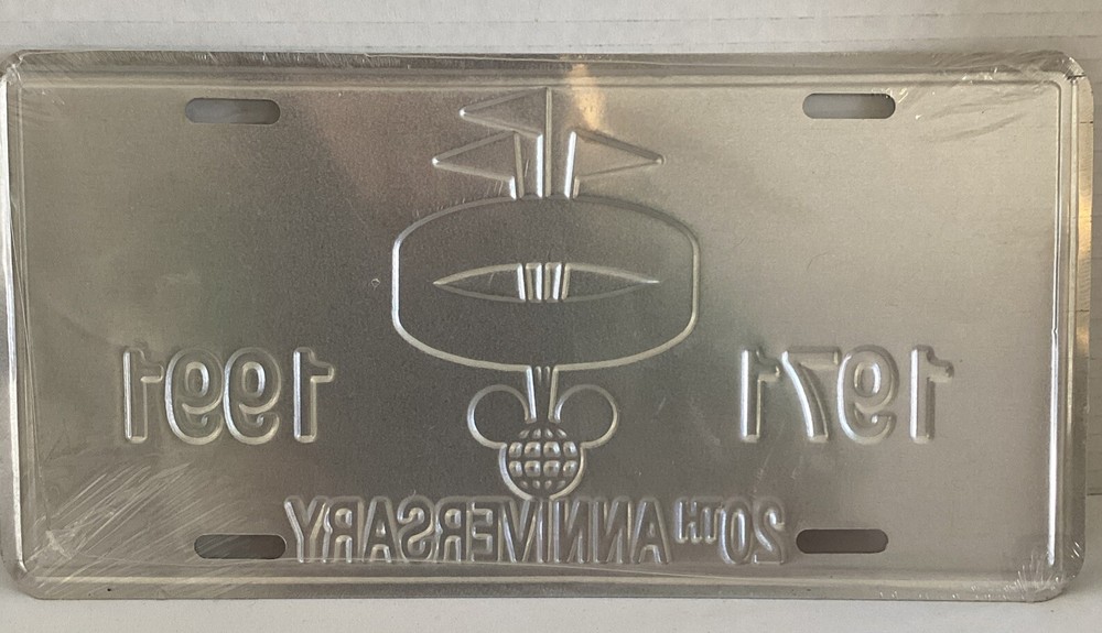 The product is a vintage 1971-1991 Walt Disney World 20th Anniversary license plate that is still sealed. It features branding from Disney and celebrates the milestone anniversary of the theme park. The license plate likely incorporates elements from popular Disney franchises such as Cars, given its connection to the Disney brand. This collectible item would be a nostalgic and unique piece for any Disney enthusiast or collector. There is a scratch on the front white, plastic has small whole, pictured.