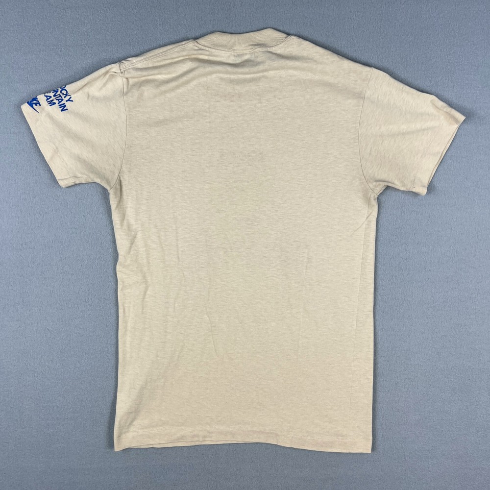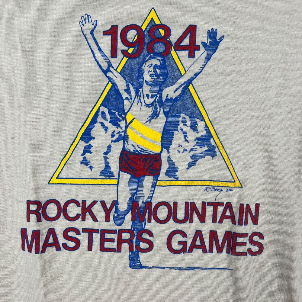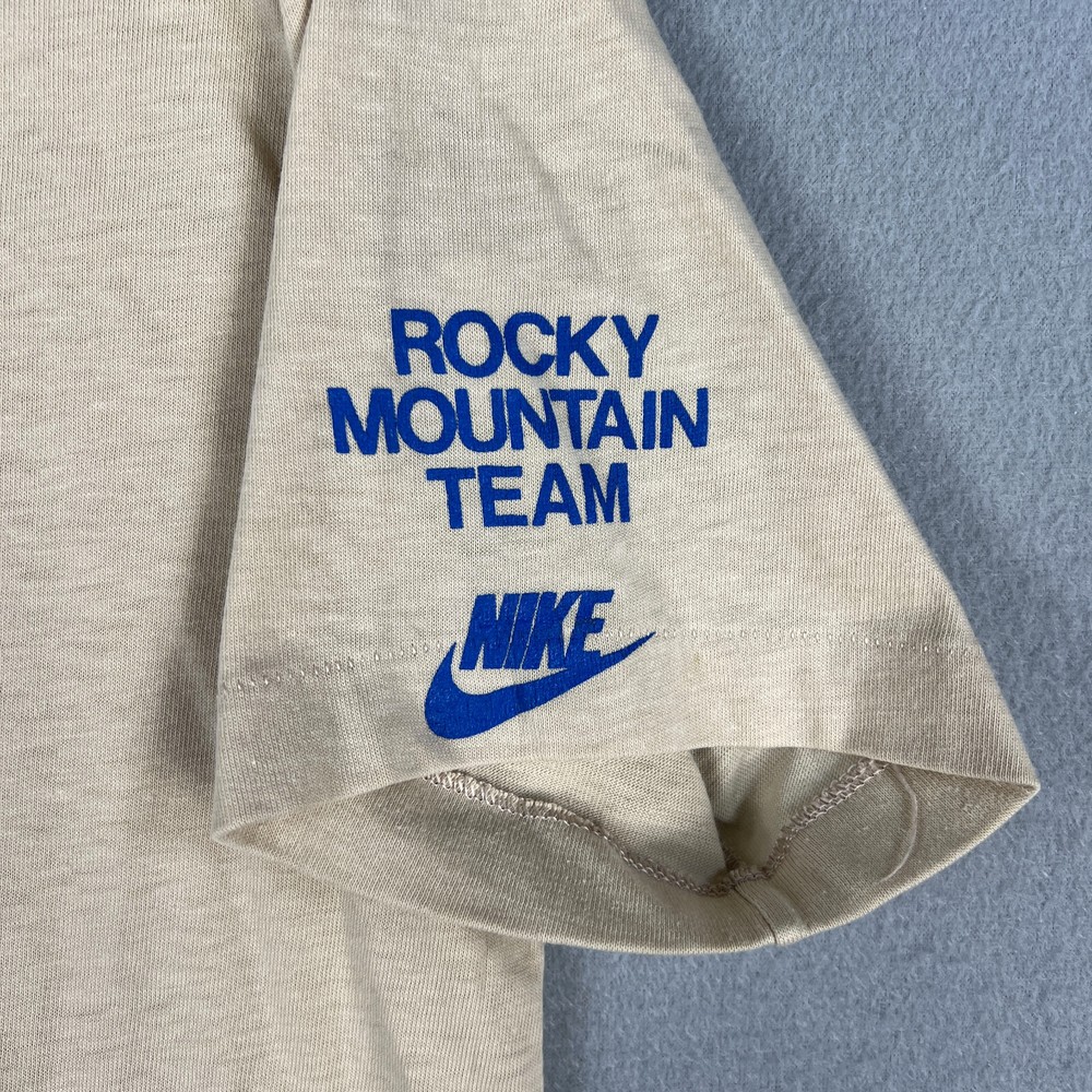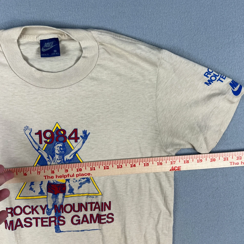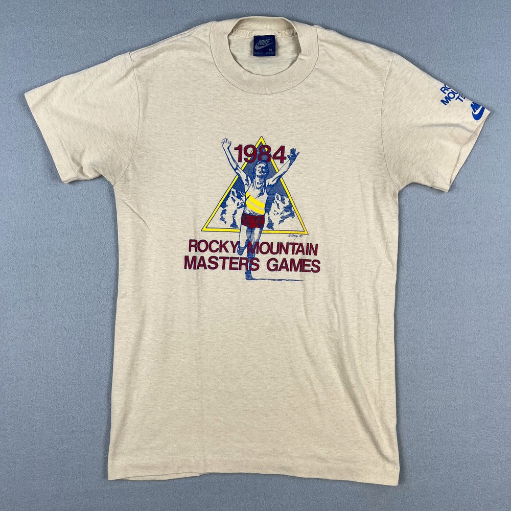 Tag reads medium but the shirt measures closer to a modern men's small or extra small. Please see photos for details on condition and measurements. All measurements are approximate. Please check your own measurements before purchasing. Will ship quickly and package safely. Please message me with any questions you may have. Thanks for shopping with us! For sale is a rare vintage 1984 Nike Rocky Mountain Masters Games t-shirt featuring a bold front graphic of a marathon runner crossing the finish line, set against a mountain backdrop. This shirt was produced for the 1984 Rocky Mountain Masters Games and features the original Nike blue tag , dating it to the early-to-mid 1980s. A true collector’s piece, this shirt also has the Nike logo and Rocky Mountain text on the left sleeve , making it even more desirable. Perfect for vintage Nike enthusiasts, marathon collectors, or anyone looking to own a unique piece of sportswear history.